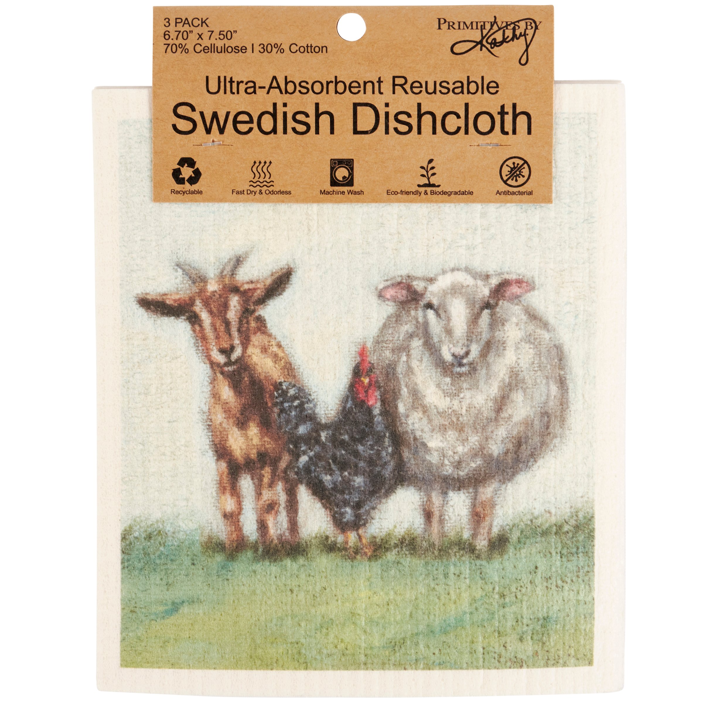 Safe to use on all types of surfaces, eco-friendly Swedish Dishcloths dry quickly and are antibacterial for more hygienic cleaning with reduced waste. This set of 3 Swedish Dishcloths from our Farmhouse Collection features charming scenes of farm animals together in a field. Farm animals designs are replicated from original artwork painted onto burlap canvas, giving the art a unique depth and texture. Our Farm Family Swedish cloth set is ultra-absorbent and conveniently machine-washable for easy cleaning and reuse. Dishcloths are attached to header card with hole for easy rack display. A rustic farm-themed set of reusable dishcloths perfect for replacing dull sponges and paper towels with long-lasting colorful designs.
