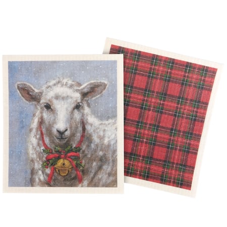 Safe to use on all types of surfaces, eco-friendly Swedish Dishcloths dry quickly and are antibacterial for more hygienic cleaning with reduced waste. This set of 2 Swedish Dishcloths from our Christmas Collection features a charming winter scene of a sheep wearing a festive Christmas bell with a coordinating holiday plaid on the other dishcloth. Christmas sheep design is replicated from original artwork painted onto burlap canvas, giving the art a unique depth and texture. Our Festive Sheep Swedish cloth set is ultra-absorbent and conveniently machine-washable for easy cleaning and reuse. Seasonal dishcloths are attached to header card with hole for easy store rack display. A rustic farm-themed set of reusable Christmas dishcloths perfect for replacing dull sponges and paper towels with long-lasting colorful designs.