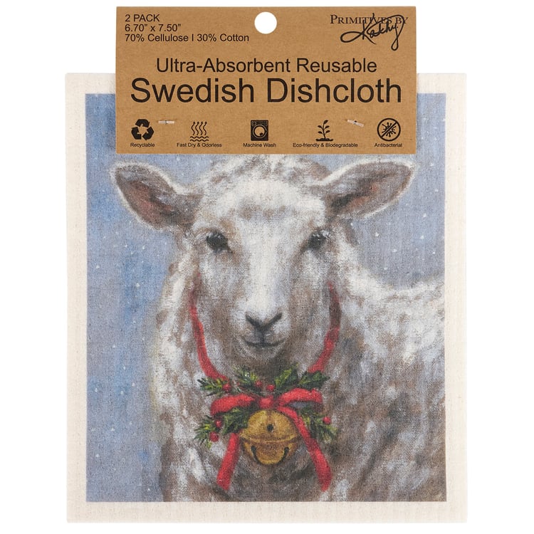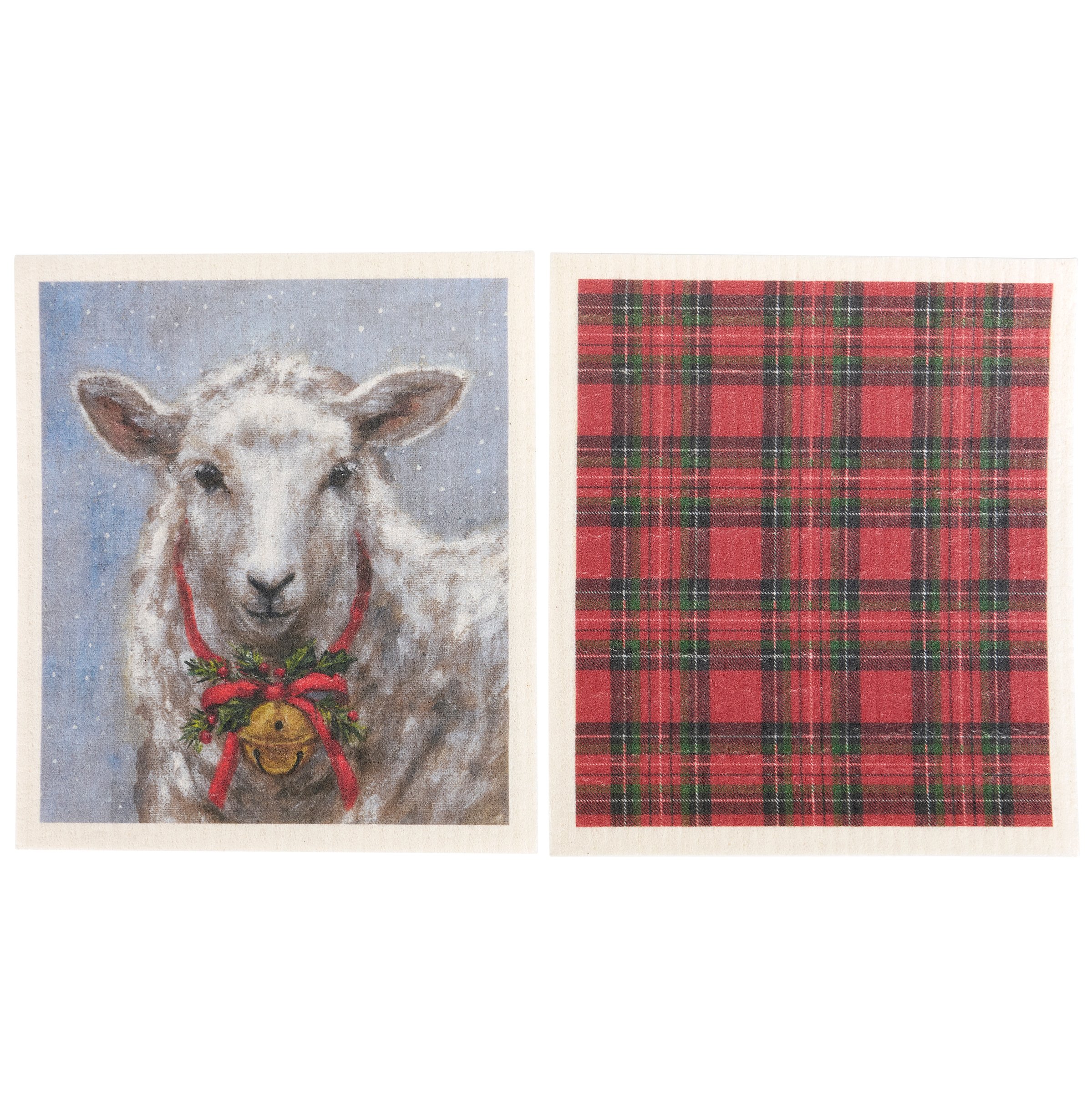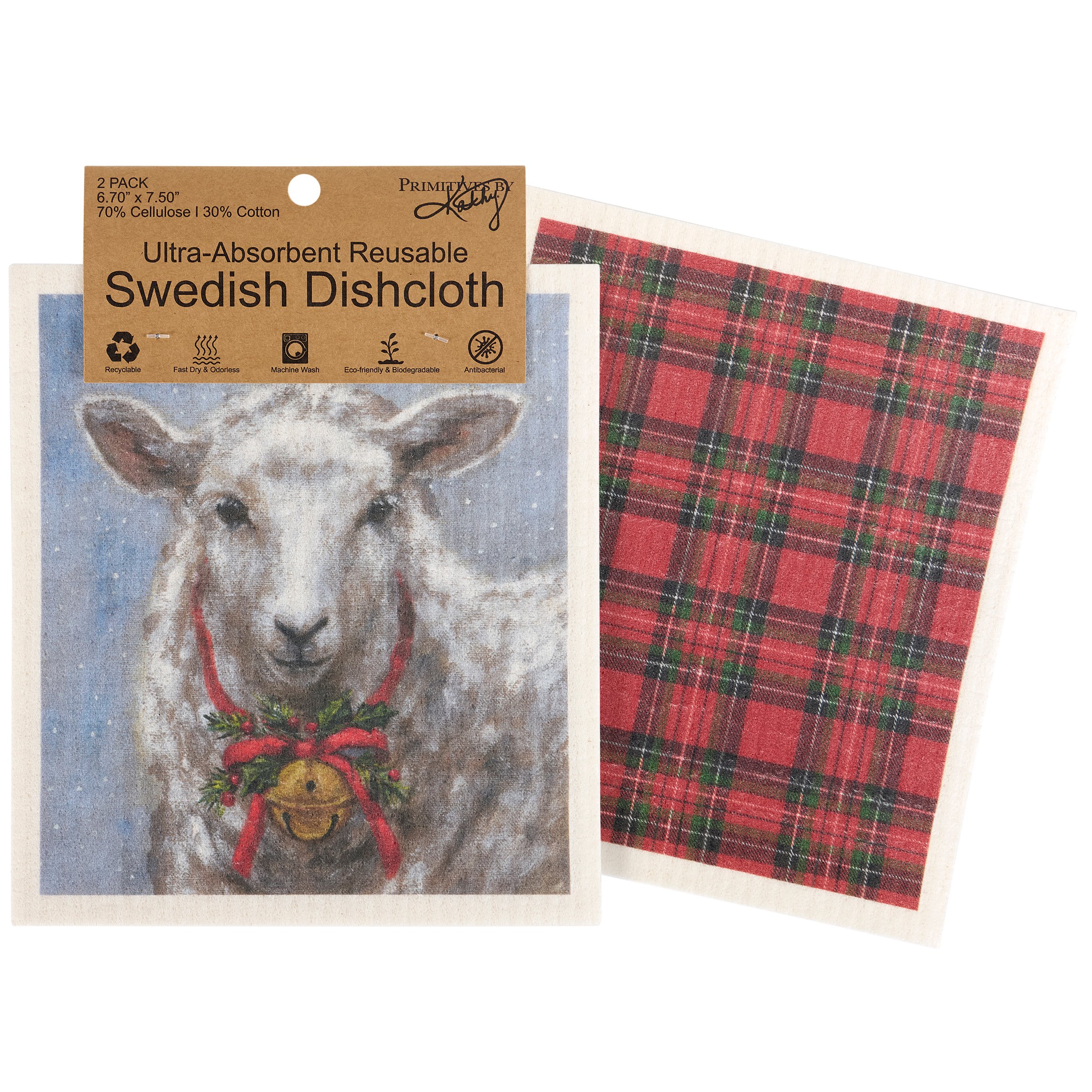 Safe to use on all types of surfaces, eco-friendly Swedish Dishcloths dry quickly and are antibacterial for more hygienic cleaning with reduced waste. This set of 2 Swedish Dishcloths from our Christmas Collection features a charming winter scene of a sheep wearing a festive Christmas bell with a coordinating holiday plaid on the other dishcloth. Christmas sheep design is replicated from original artwork painted onto burlap canvas, giving the art a unique depth and texture. Our Festive Sheep Swedish cloth set is ultra-absorbent and conveniently machine-washable for easy cleaning and reuse. Seasonal dishcloths are attached to header card with hole for easy store rack display. A rustic farm-themed set of reusable Christmas dishcloths perfect for replacing dull sponges and paper towels with long-lasting colorful designs.