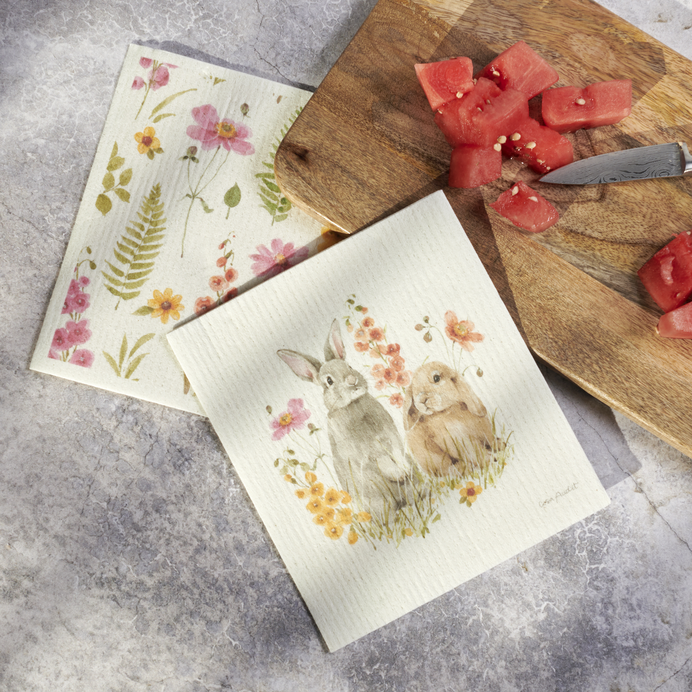 Safe to use on all types of surfaces, eco-friendly Swedish Dishcloths dry quickly and are antibacterial for more hygienic cleaning with reduced waste. This set of two Swedish Dishcloths from our Easter & Spring Collection features spring inspired designs replicated from original hand painted art. Designs include delightful bunnies with spring flowers on one dishcloth and a spring flower pattern on the other dishcloth. Our Flower Bunnies Swedish Dishcloth set is machine-washable for convenient cleaning. Dishcloths are attached to header card with hole for easy rack display. A charming seasonal set of reusable dishcloths perfect for replacing dull sponges and paper towels with long-lasting colorful designs.