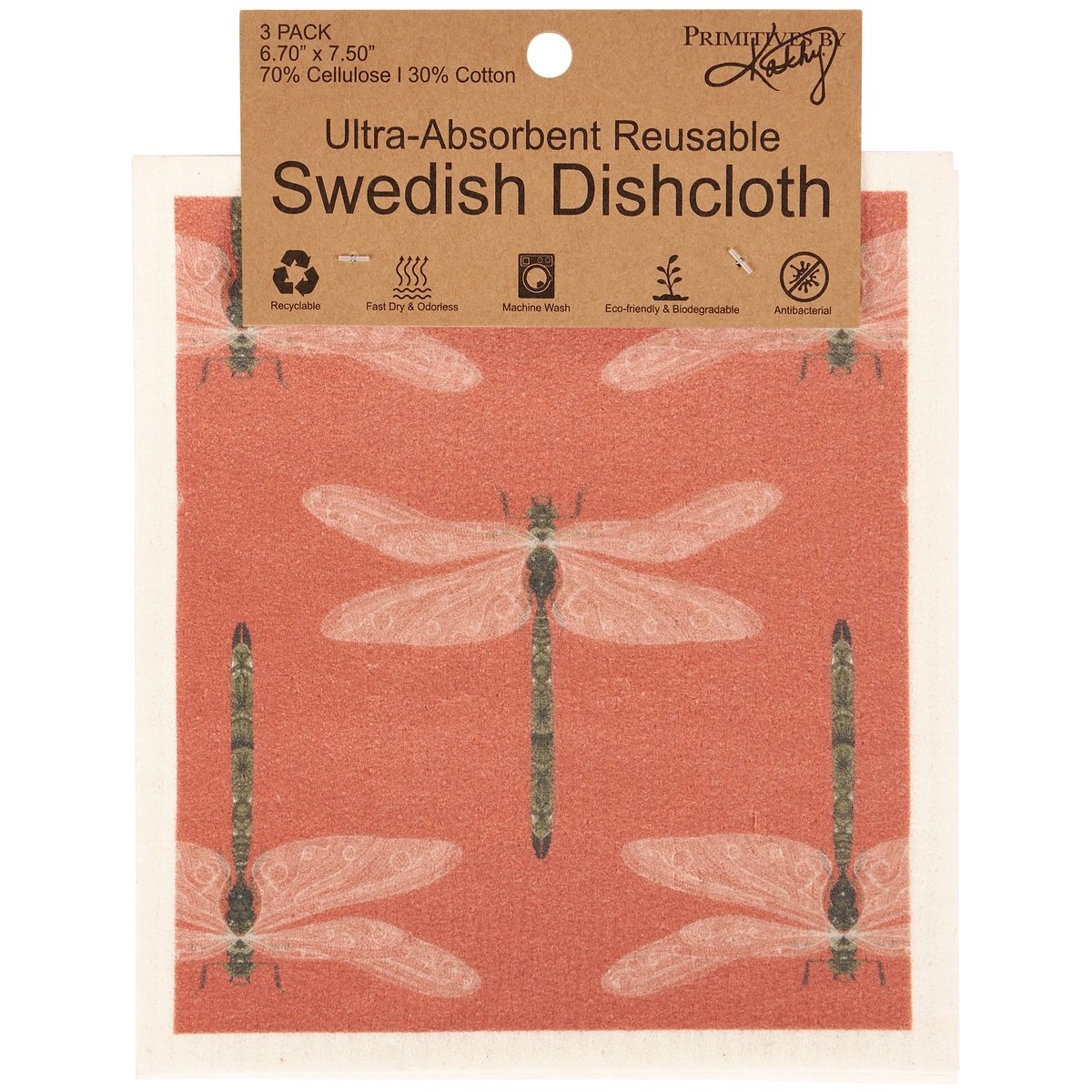Safe to use on all types of surfaces, eco-friendly Swedish Dishcloths dry quickly and are antibacterial for more hygienic cleaning with reduced waste. This set of 3 Swedish Dishcloths from our Garden Collection features various garden bug designs with hand illustrated floral details. Garden bug designs include dragonflies, honey bees, and ladybugs. Our Garden Bug Swedish Dishcloth set is machine-washable for convenient cleaning. Dishcloths are attached to header card with hole for easy rack display. A fun garden-theme set of reusable dishcloths perfect for replacing dull sponges and paper towels with long-lasting colorful designs.