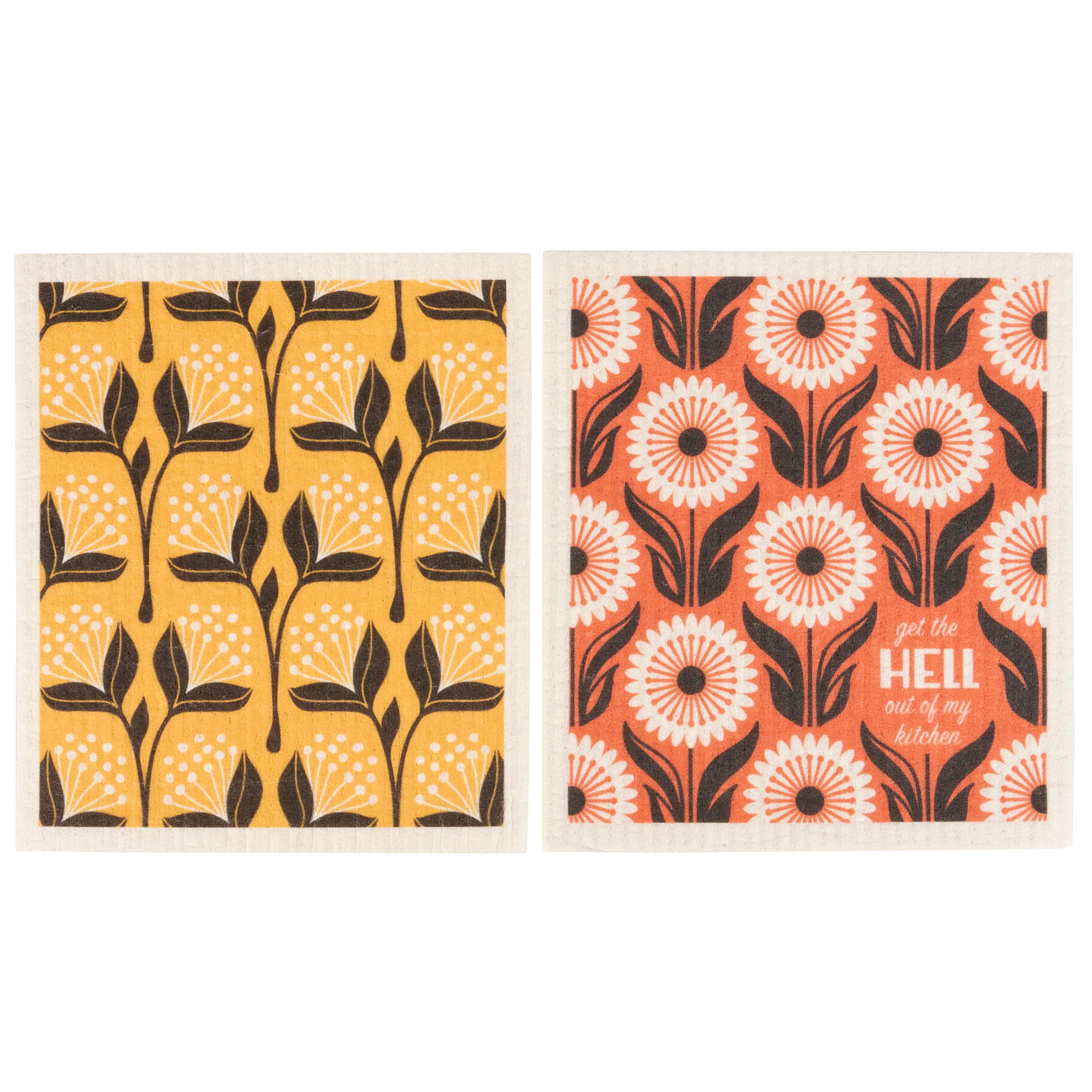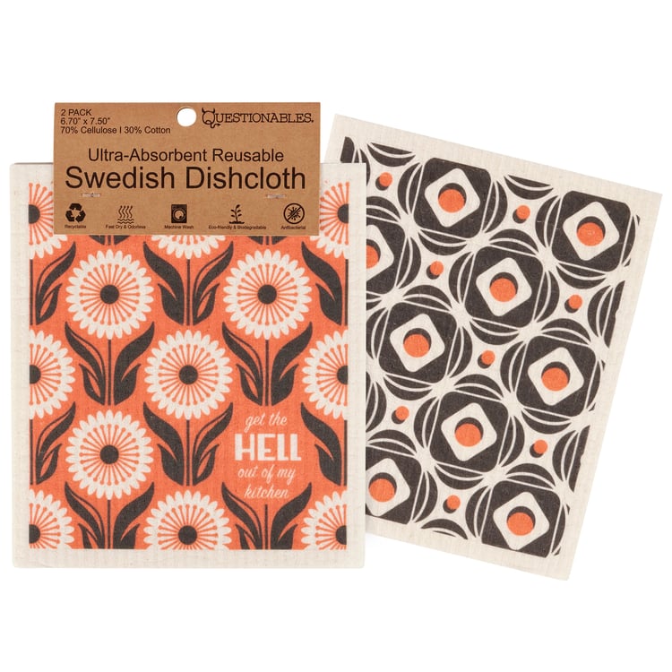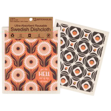 Safe to use on all types of surfaces, eco-friendly Swedish Dishcloths dry quickly and are antibacterial for more hygienic cleaning with reduced waste. This stylish set of 2 Swedish Dishcloths flaunts vibrant floral patterns and a sassy sentiment that reads "Get The Hell Out Of My Kitchen." Questionables Swedish Dishcloth sets are ultra absorbent to soak up whatever you throw at them and machine washable for stress-free cleaning. Dishcloths are attached to a header card with hole for easy rack display. Our Get Out Swedish Dishcloth set demands attention making it perfect for everyday expression or gifting to your favorite kitchen boss to replace dull sponges and paper towels with long-lasting colorful designs.