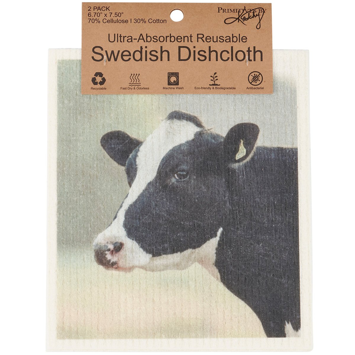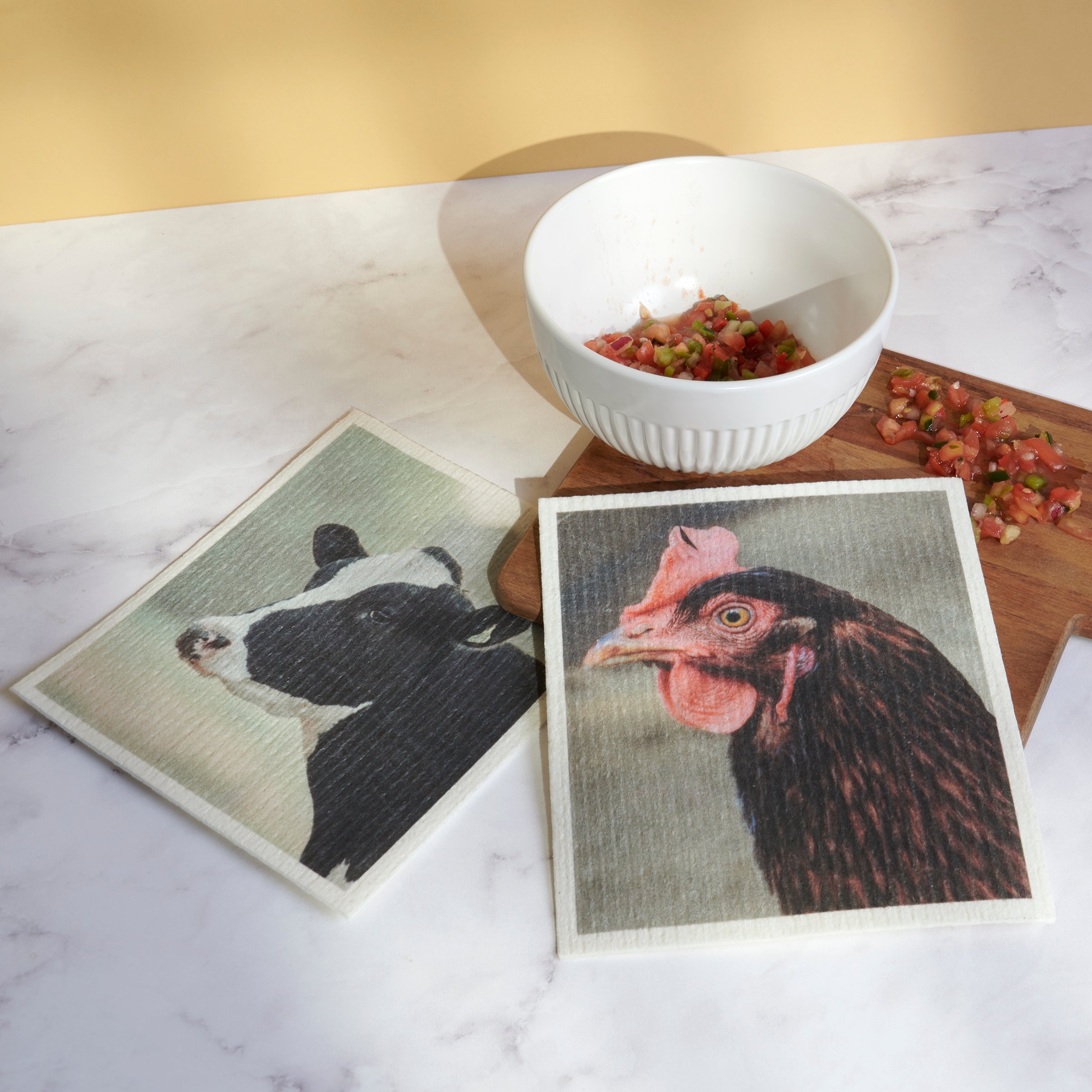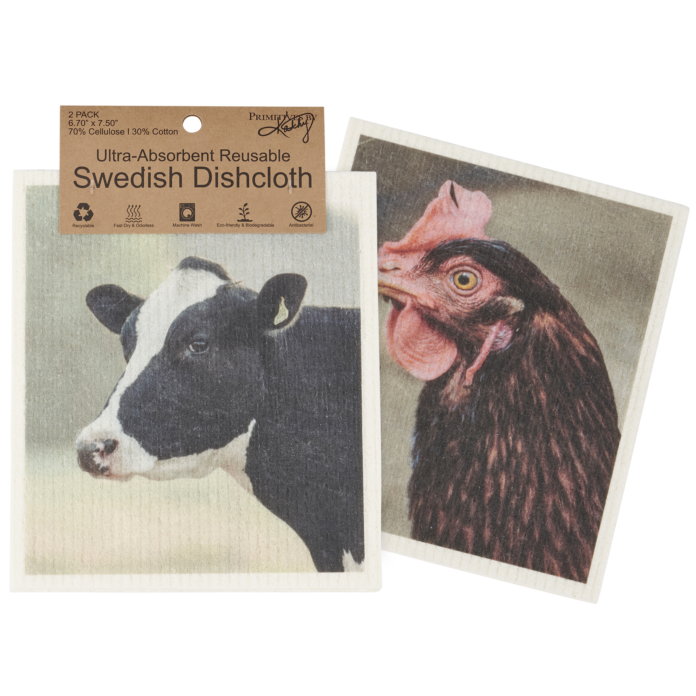 Safe to use on all types of surfaces, eco-friendly Swedish Dishcloths dry quickly and are antibacterial for more hygienic cleaning with reduced waste. This set of two Swedish Dishcloths from our Homestead Collection features beautiful lifestyle photography of a cow and of a chicken. Designs are replicated from original photographs for added interest. Our Homestead Swedish Dishcloth set is machine-washable for convenient cleaning. Dishcloths are attached to header card with hole for easy rack display. A rustic farm-themed set of reusable dishcloths perfect for replacing dull sponges and paper towels with long-lasting colorful designs.