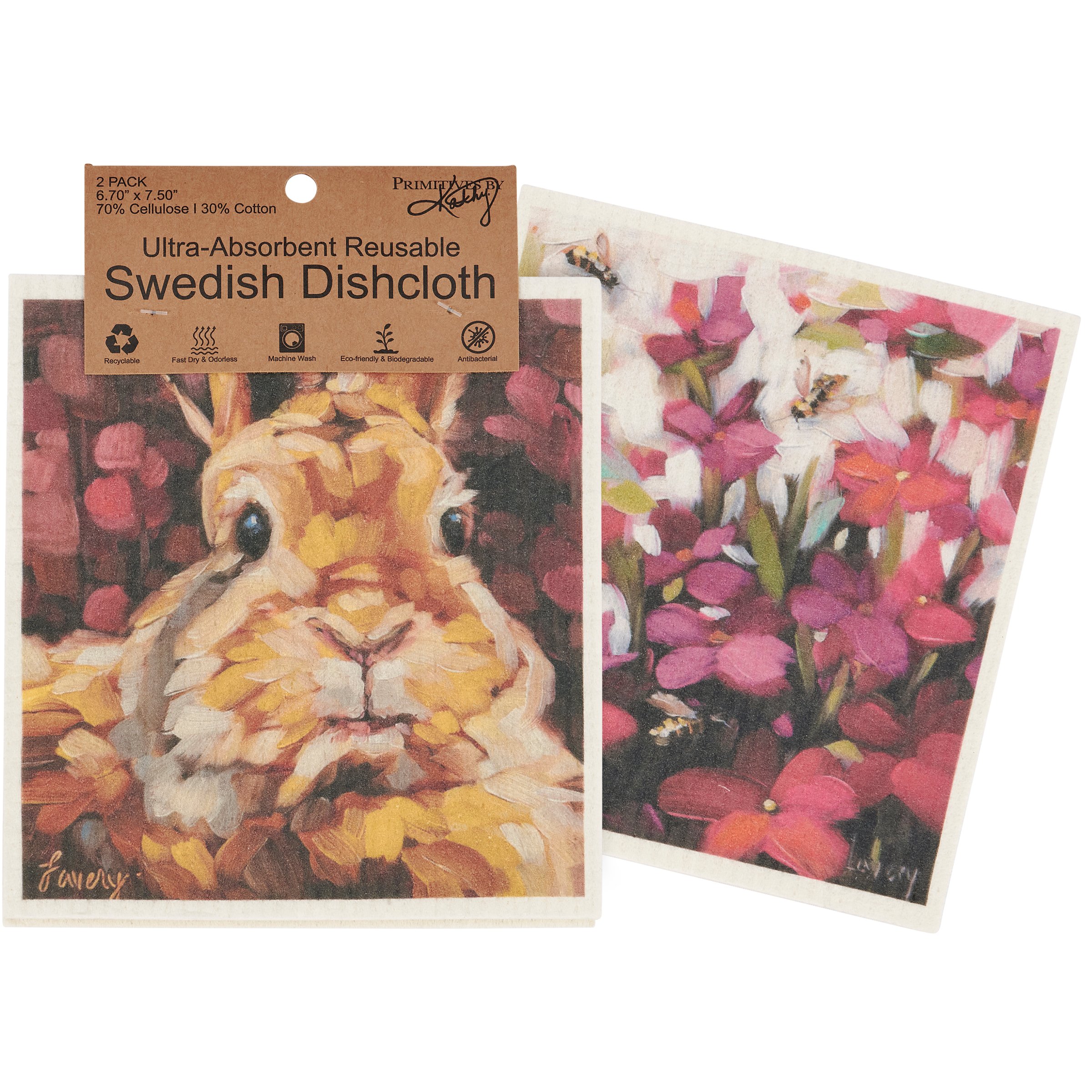 Safe to use on all types of surfaces, eco-friendly Swedish Dishcloths dry quickly and are antibacterial for more hygienic cleaning with reduced waste. This set of 2 Swedish Dishcloths from our Easter & Spring Collection features calming scenes of a bunny on one dishcloth and spring flowers on the other dishcloth. Designs are replicated from original artwork hand painted in a unique textured style. Our Hoppy Bunny Swedish Dishcloth set is machine-washable for convenient cleaning. Dishcloths are attached to header card with hole for easy rack display. A charming spring-themed set of reusable dishcloths perfect for replacing dull sponges and paper towels with long-lasting colorful designs.
