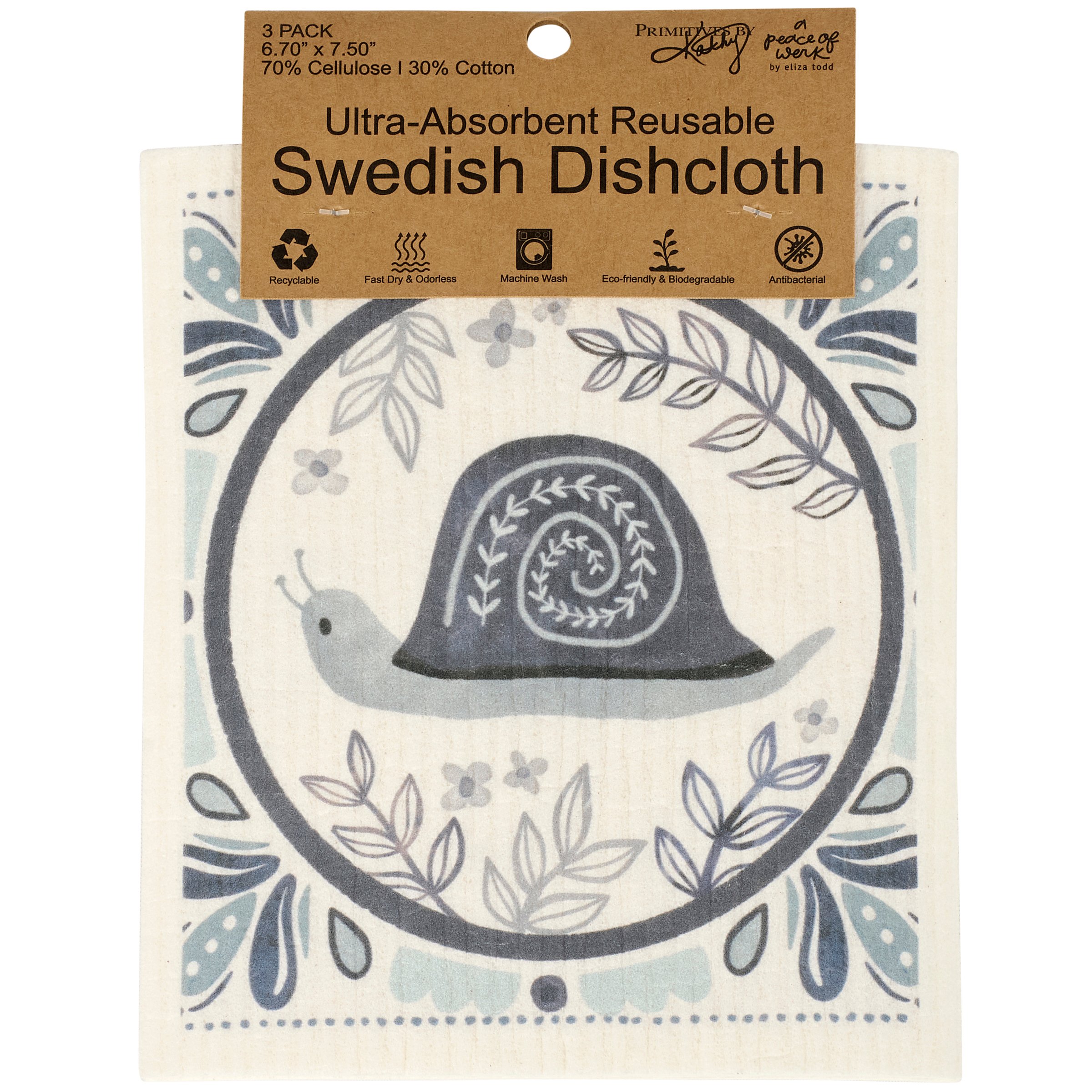 Safe to use on all types of surfaces, eco-friendly Swedish Dishcloths dry quickly and are antibacterial for more hygienic cleaning with reduced waste. This set of 3 Swedish Dishcloths from our Home Collection features tile inspired designs with various nature scenes in calming indigo color palettes. Indigo tile and nature designs are replicated from original hand illustrated artwork. Our Indigo Tile Swedish cloth set is ultra-absorbent and conveniently machine-washable for easy cleaning and reuse. Dishcloths are attached to header card with hole for easy rack display. A stylish nature themed set of reusable dishcloths perfect for replacing dull sponges and paper towels with long-lasting colorful designs.