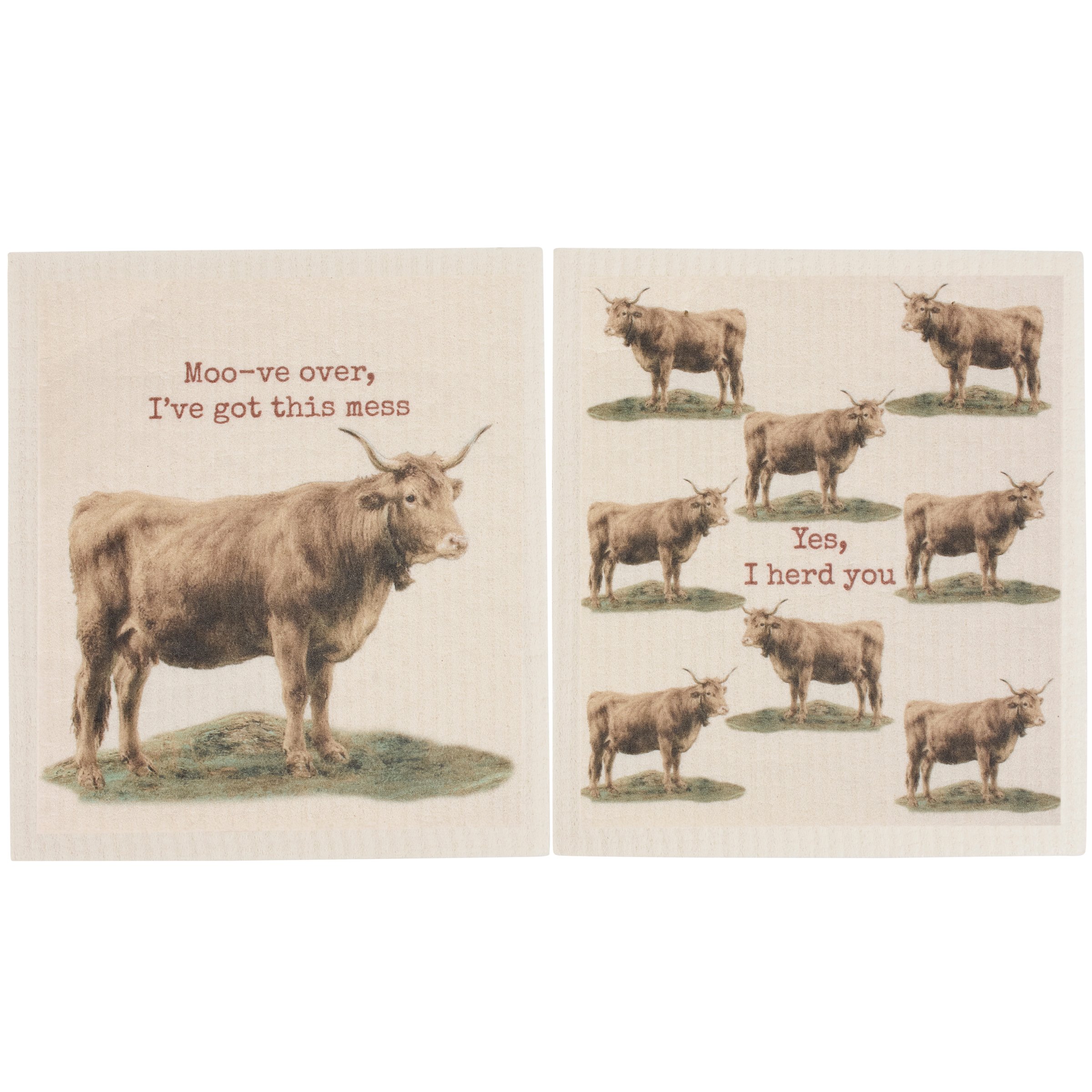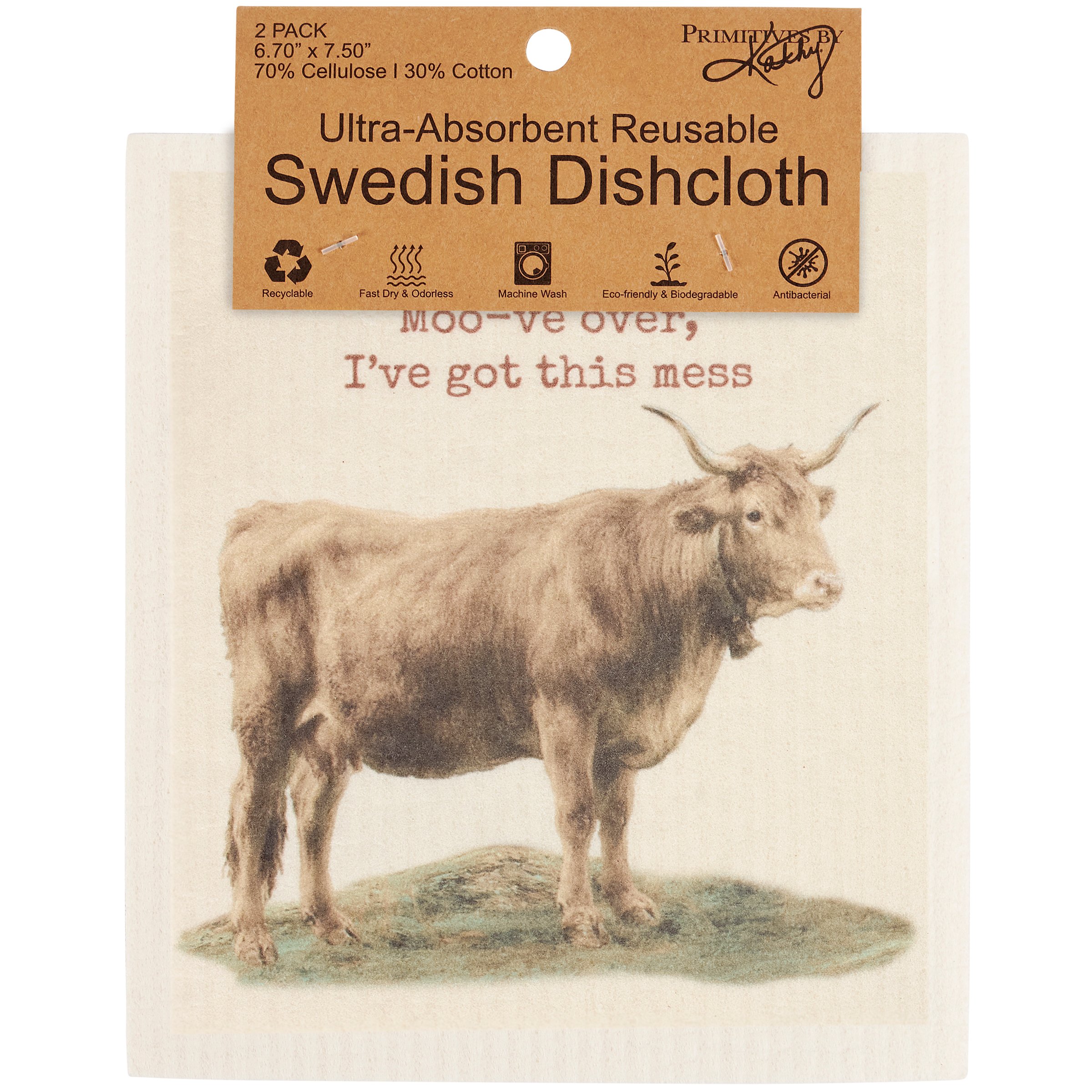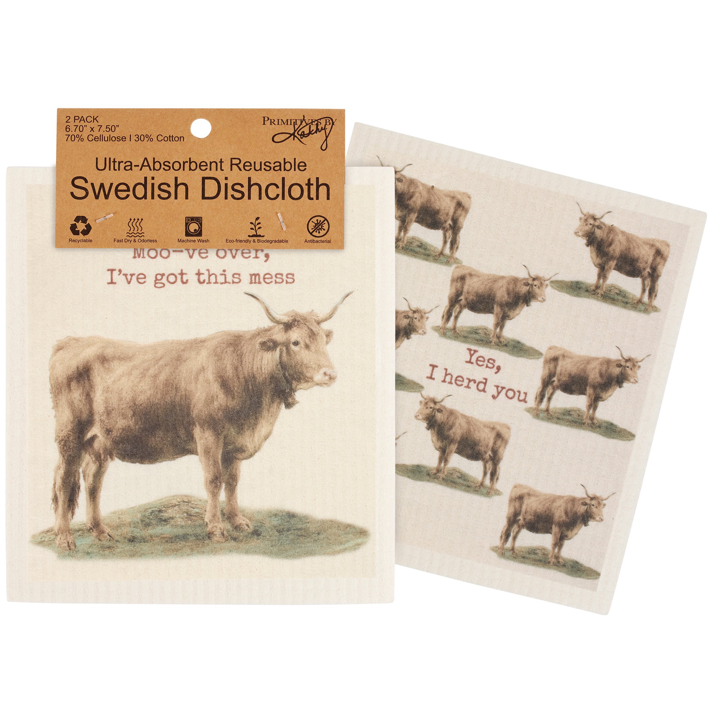 Safe to use on all types of surfaces, eco-friendly Swedish Dishcloths dry quickly and are antibacterial for more hygienic cleaning with reduced waste. This set of 2 Swedish Dishcloths from our Farmhouse Collection features vintage art of highland cows with fun farm animal puns. Farm designs include a highland cow under a "Moo-ve Over, I've Got This Mess" sentiment on one dishcloth and a highland cow pattern with a "Yes, I Herd You" sentiment on the other dishcloth. Our Moove Over I Got This Swedish cloth set is ultra-absorbent and conveniently machine-washable for easy cleaning and reuse. Dishcloths are attached to header card with hole for easy rack display. A fun farm themed set of reusable dishcloths perfect for replacing dull sponges and paper towels with long-lasting colorful designs.