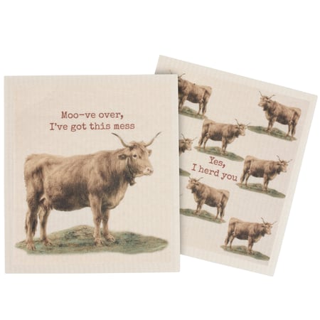 Safe to use on all types of surfaces, eco-friendly Swedish Dishcloths dry quickly and are antibacterial for more hygienic cleaning with reduced waste. This set of 2 Swedish Dishcloths from our Farmhouse Collection features vintage art of highland cows with fun farm animal puns. Farm designs include a highland cow under a "Moo-ve Over, I've Got This Mess" sentiment on one dishcloth and a highland cow pattern with a "Yes, I Herd You" sentiment on the other dishcloth. Our Moove Over I Got This Swedish cloth set is ultra-absorbent and conveniently machine-washable for easy cleaning and reuse. Dishcloths are attached to header card with hole for easy rack display. A fun farm themed set of reusable dishcloths perfect for replacing dull sponges and paper towels with long-lasting colorful designs.
