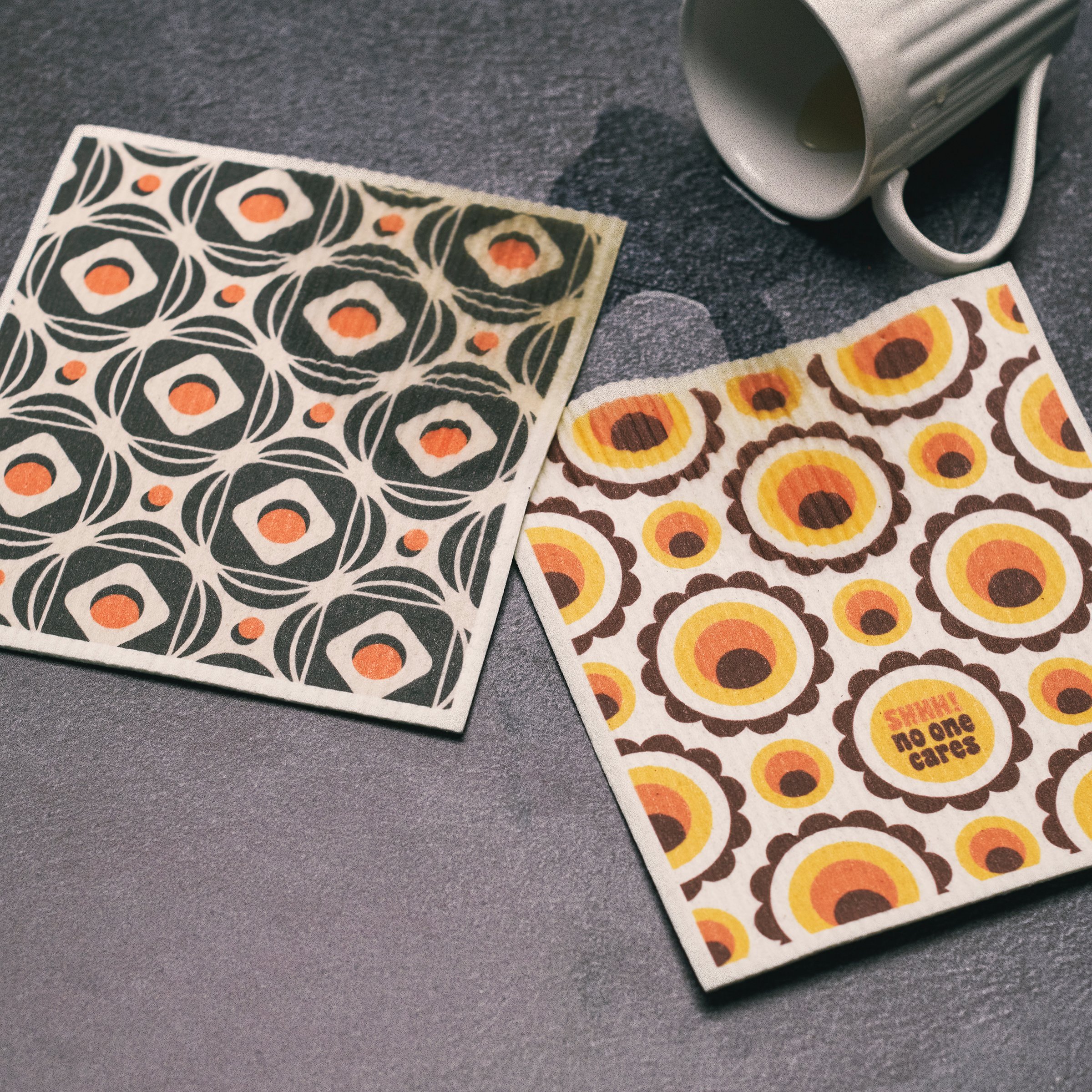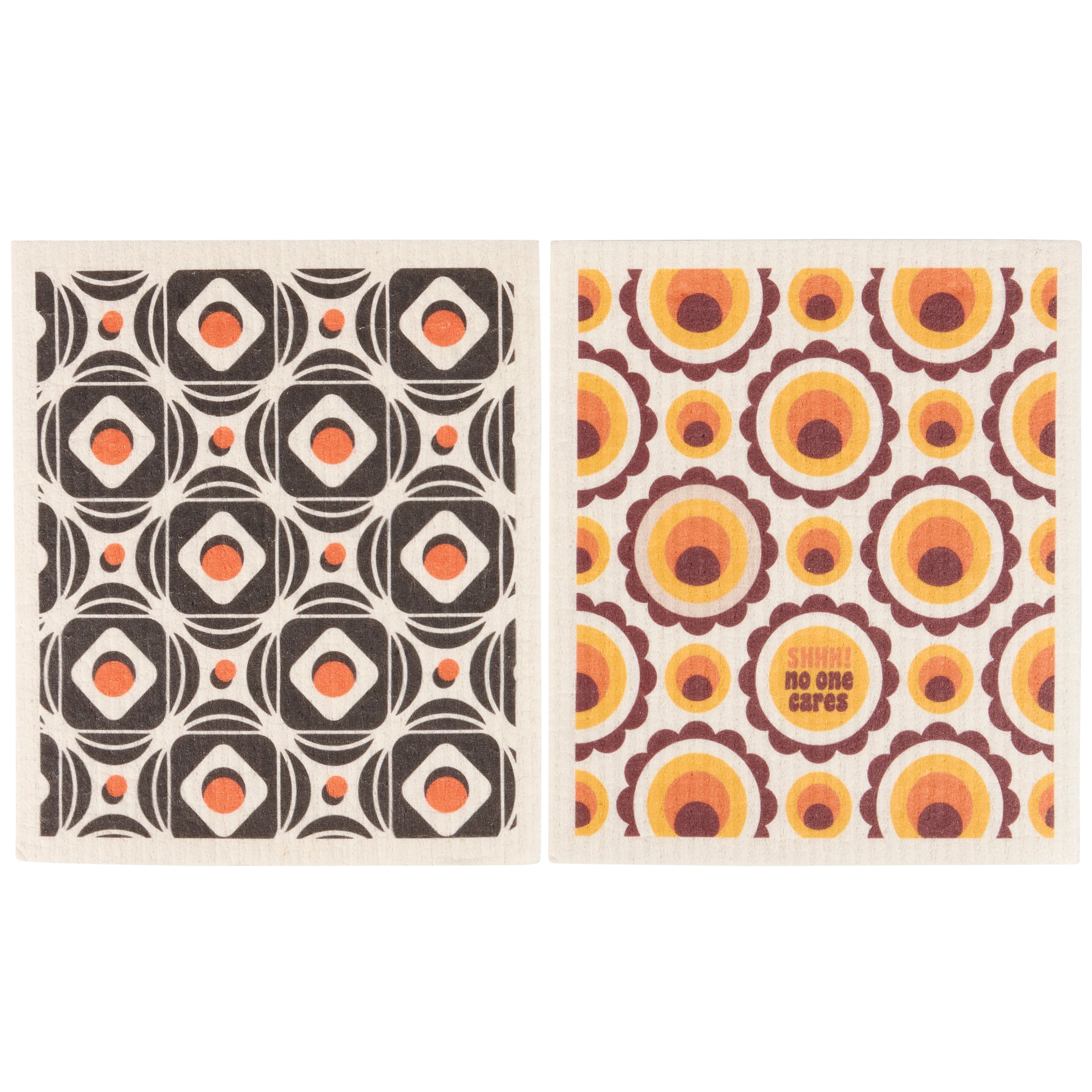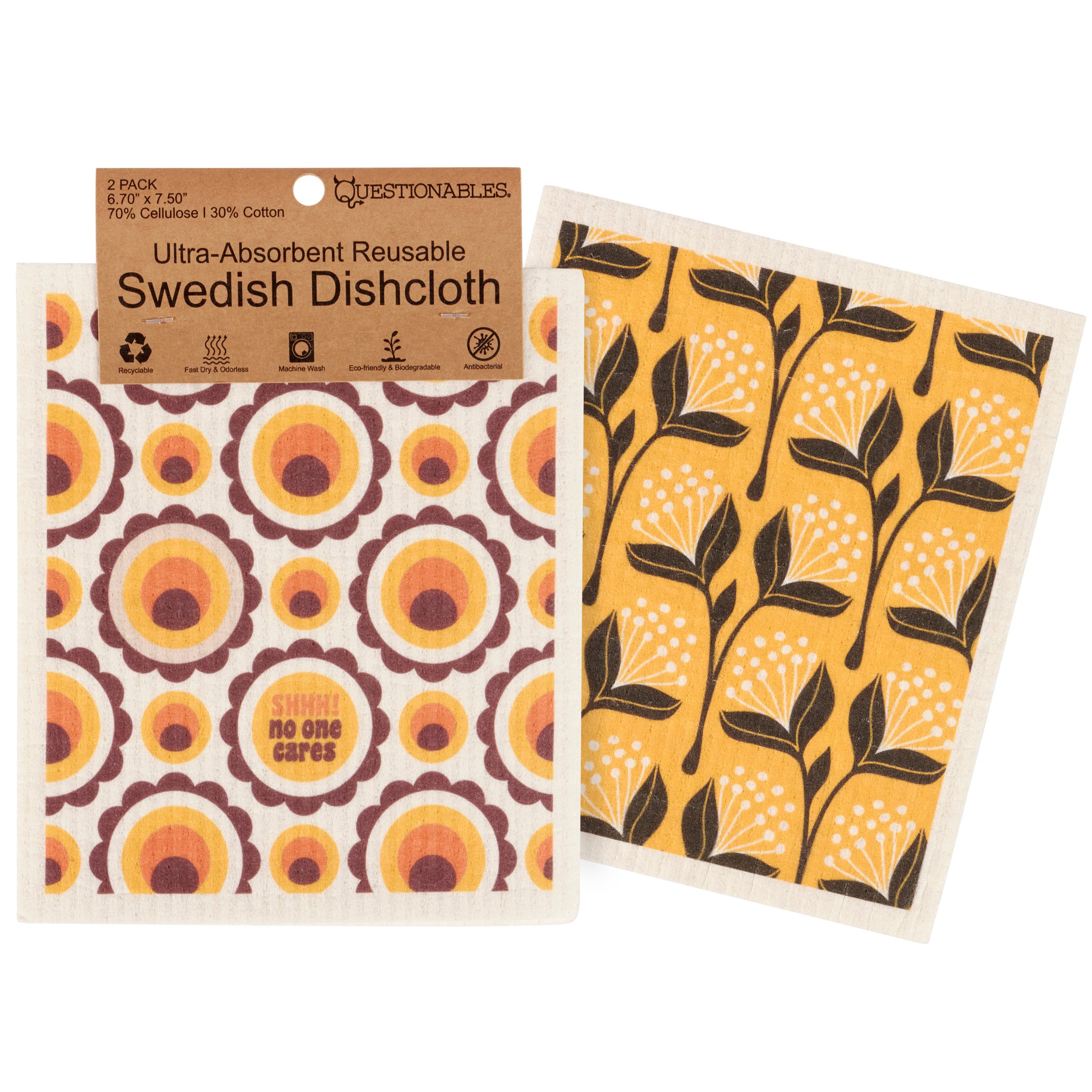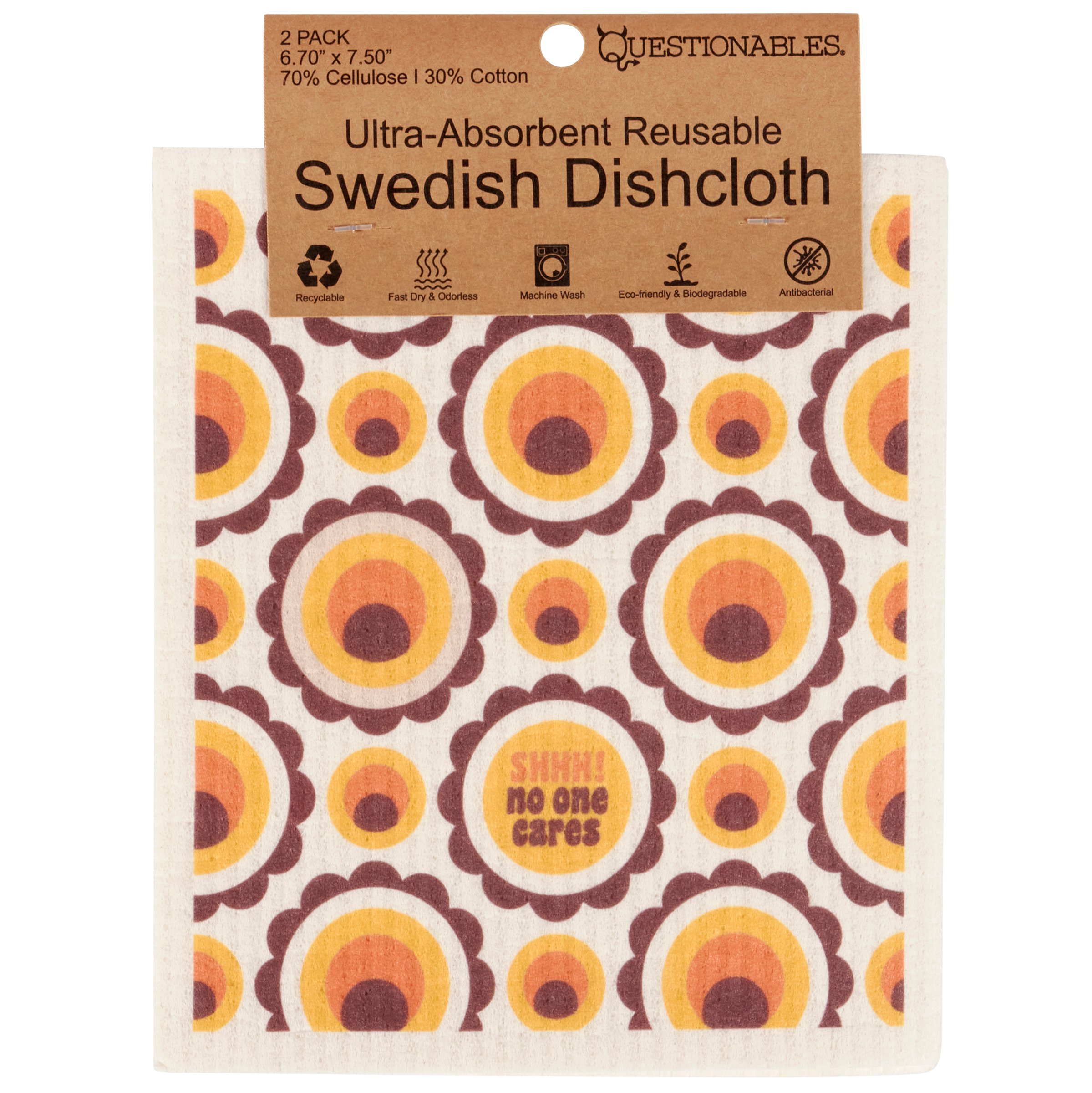 Safe to use on all types of surfaces, eco-friendly Swedish Dishcloths dry quickly and are antibacterial for more hygienic cleaning with reduced waste. This stylish set of 2 Swedish Dishcloths flaunts vibrant retro inspired patterns and a sassy sentiment that reads "Shhh! No One Cares." Questionables Swedish Dishcloth sets are ultra absorbent to soak up whatever you throw at them and machine washable for stress-free cleaning. Dishcloths are attached to a header card with hole for easy rack display. Our No One Swedish Dishcloth set calls back to a retro style while also calling out a modern mentality making it perfect for everyday expression while replacing dull sponges and paper towels with long-lasting colorful designs.