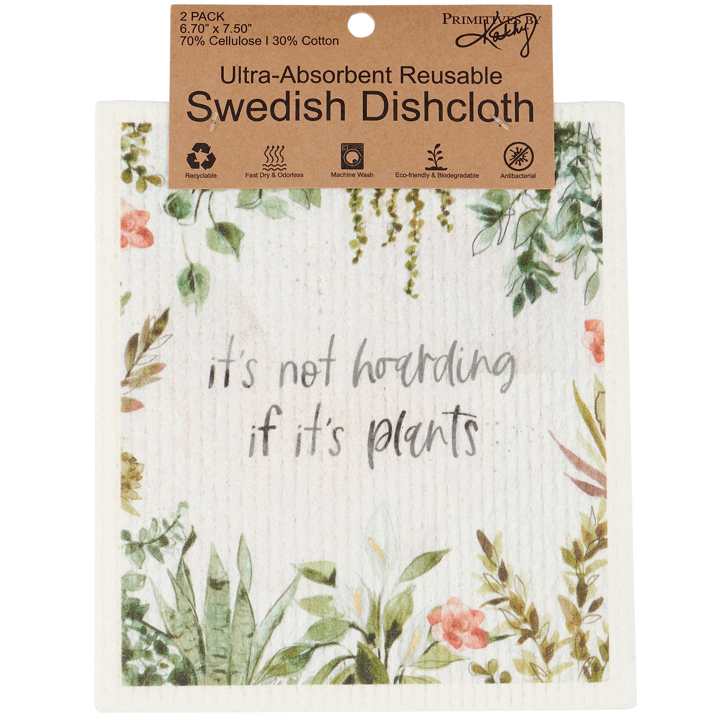 Safe to use on all types of surfaces, eco-friendly Swedish Dishcloths dry quickly and are antibacterial for more hygienic cleaning with reduced waste. This set of two Swedish Dishcloths from our Botanical Collection features house plant inspired designs replicated from original art hand painted in a watercolor style. Designs include house plants surrounding a "It's Not Hoarding If It's Plants" sentiment on one dishcloth and succulents on a shelf under a "Home Is Where My Plants Are" sentiment on the other dishcloth. Our Not Hoarding Swedish Dishcloth set is machine-washable for convenient cleaning. Dishcloths are attached to header card with hole for easy rack display. A fun plant-themed set of reusable dishcloths perfect for replacing dull sponges and paper towels with long-lasting colorful designs.
