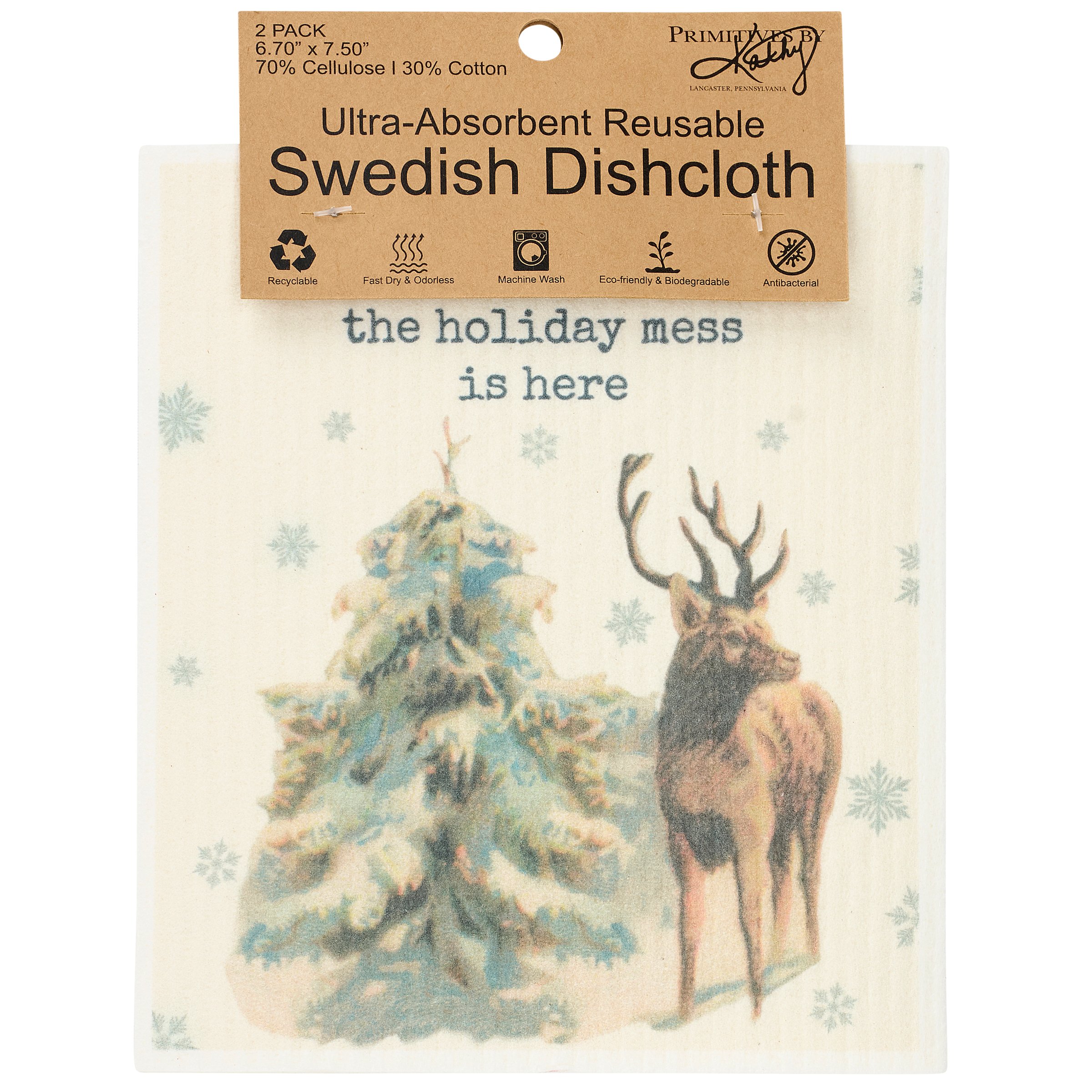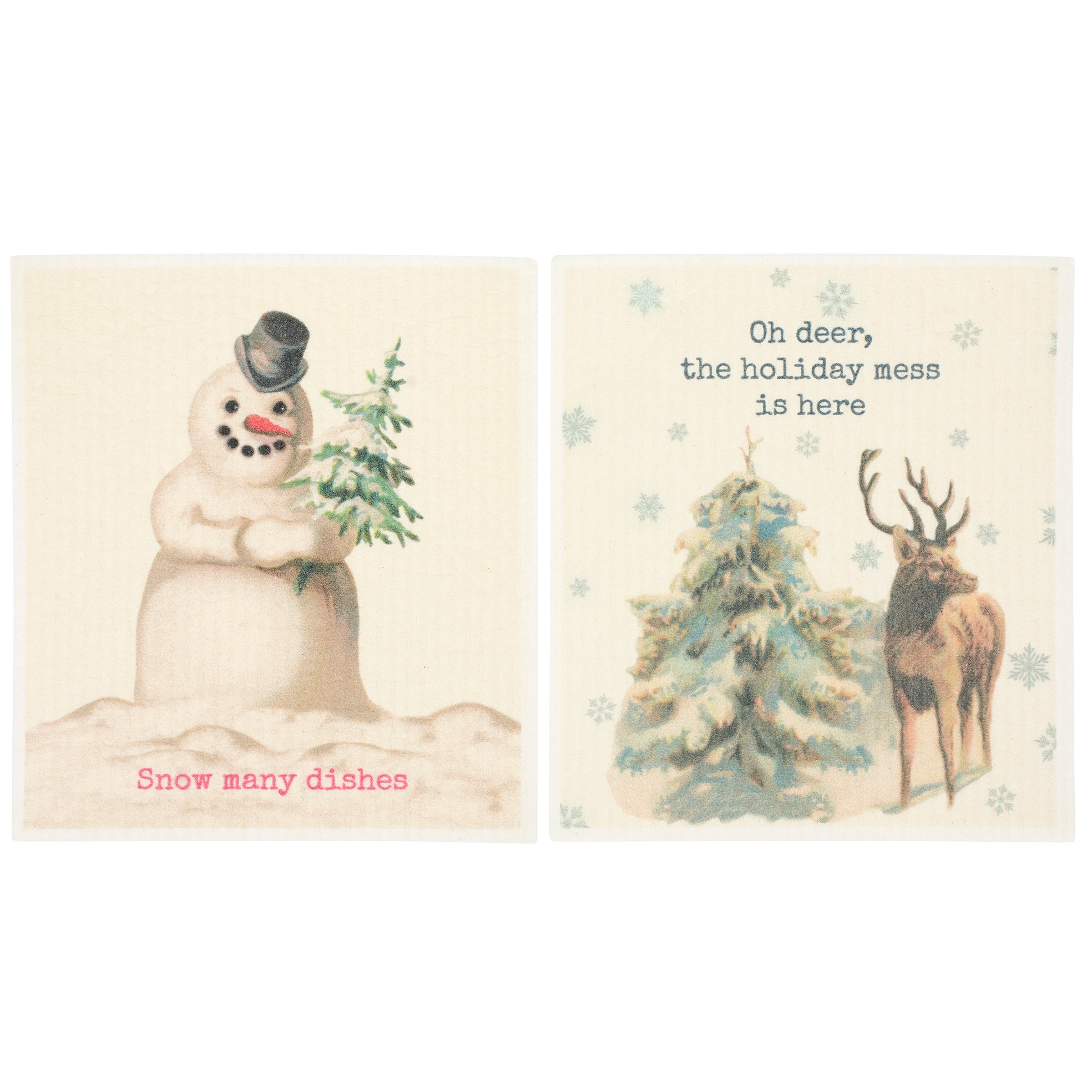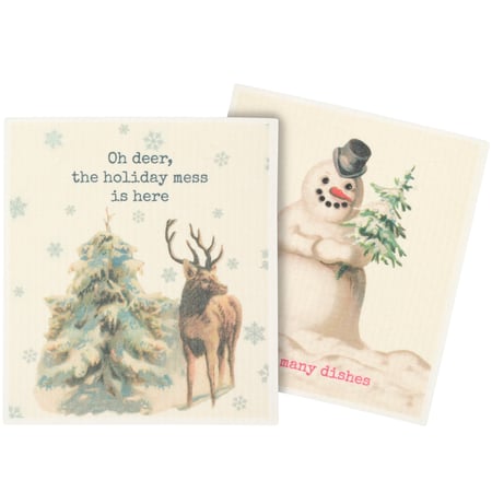 Safe to use on all types of surfaces, eco-friendly Swedish Dishcloths dry quickly and are antibacterial for more hygienic cleaning with reduced waste. This set of 2 Swedish Dishcloths from our Christmas Collection features vintage art of deer and a snowman with fun winter puns. Winter designs include a deer on a snowy hill under a "Oh Deer, The Holiday Mess Is Here" sentiment on one dishcloth and a snowman with a "Snow Many Dishes" sentiment on the other dishcloth. Our Oh Deer cloth set is ultra-absorbent and conveniently machine-washable for easy cleaning and reuse. Seasonal dishcloths are attached to header card with hole for easy rack display. A fun winter themed set of reusable dishcloths perfect for replacing dull sponges and paper towels with long-lasting colorful designs.