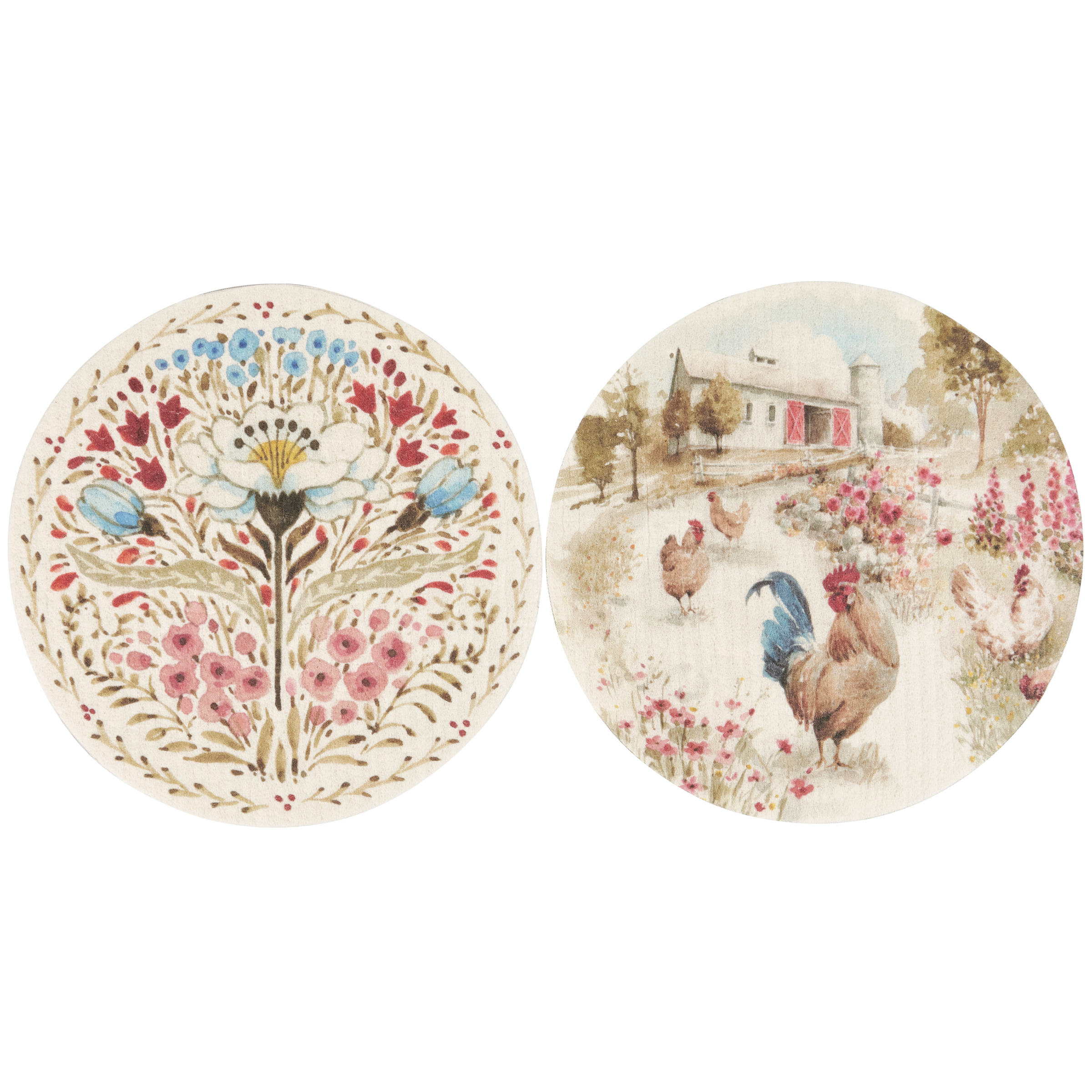 Safe to use on all types of surfaces, eco-friendly Swedish Dishcloths dry quickly and are antibacterial for more hygienic cleaning with reduced waste. This set of 2 round Swedish Dishcloths from our Farmhouse Collection features charming farm themed designs replicated from original art hand painted in a delicate watercolor style. Farm designs include a scene of roosters and farmhouse on one dishcloth and a rustic floral design on the other dishcloth. Our Roosters Swedish cloth set is ultra-absorbent and conveniently machine-washable for easy cleaning and reuse. Dishcloths are attached to header card with hole for easy rack display. A rustic farm-themed set of reusable dishcloths perfect for replacing dull sponges and paper towels with long-lasting colorful designs.
