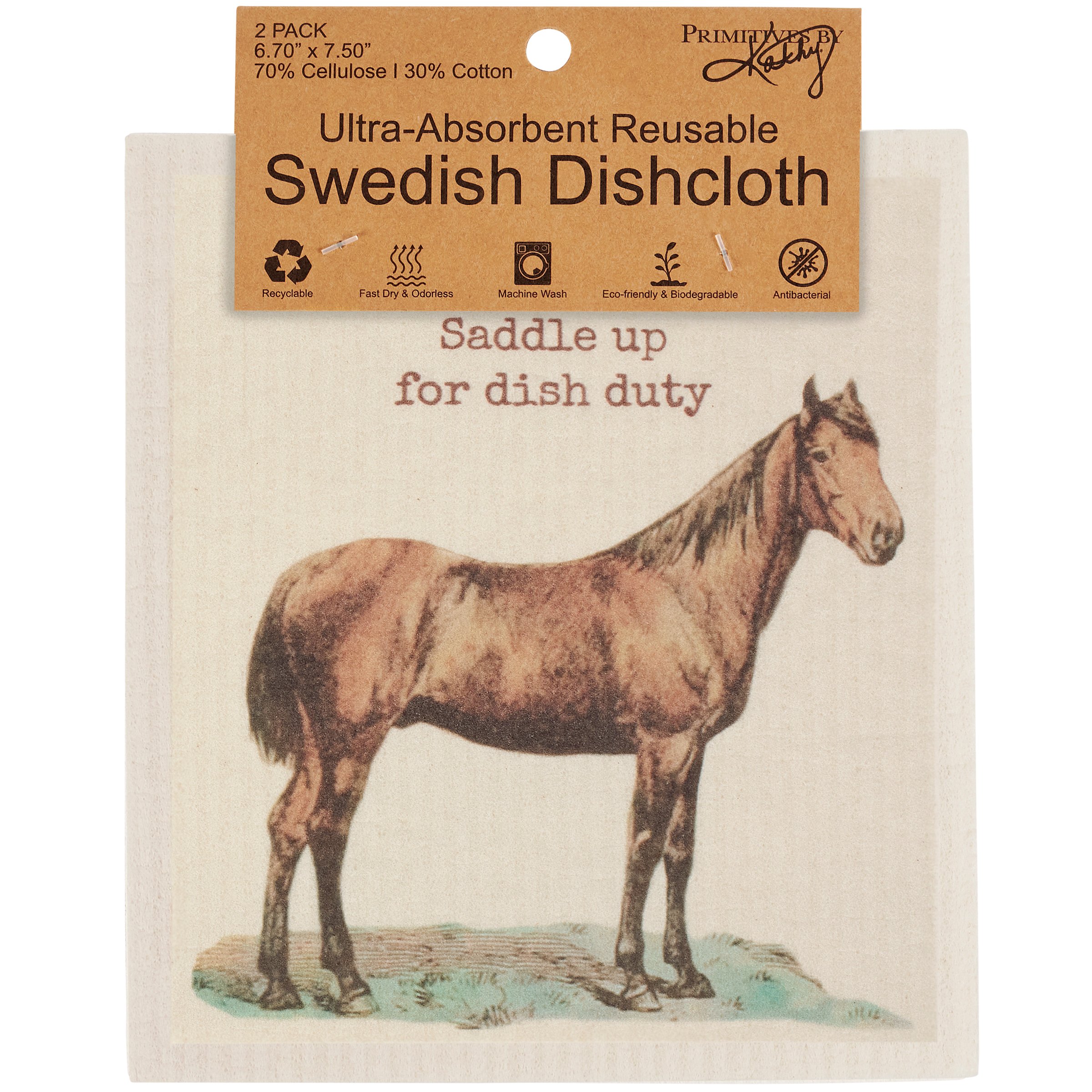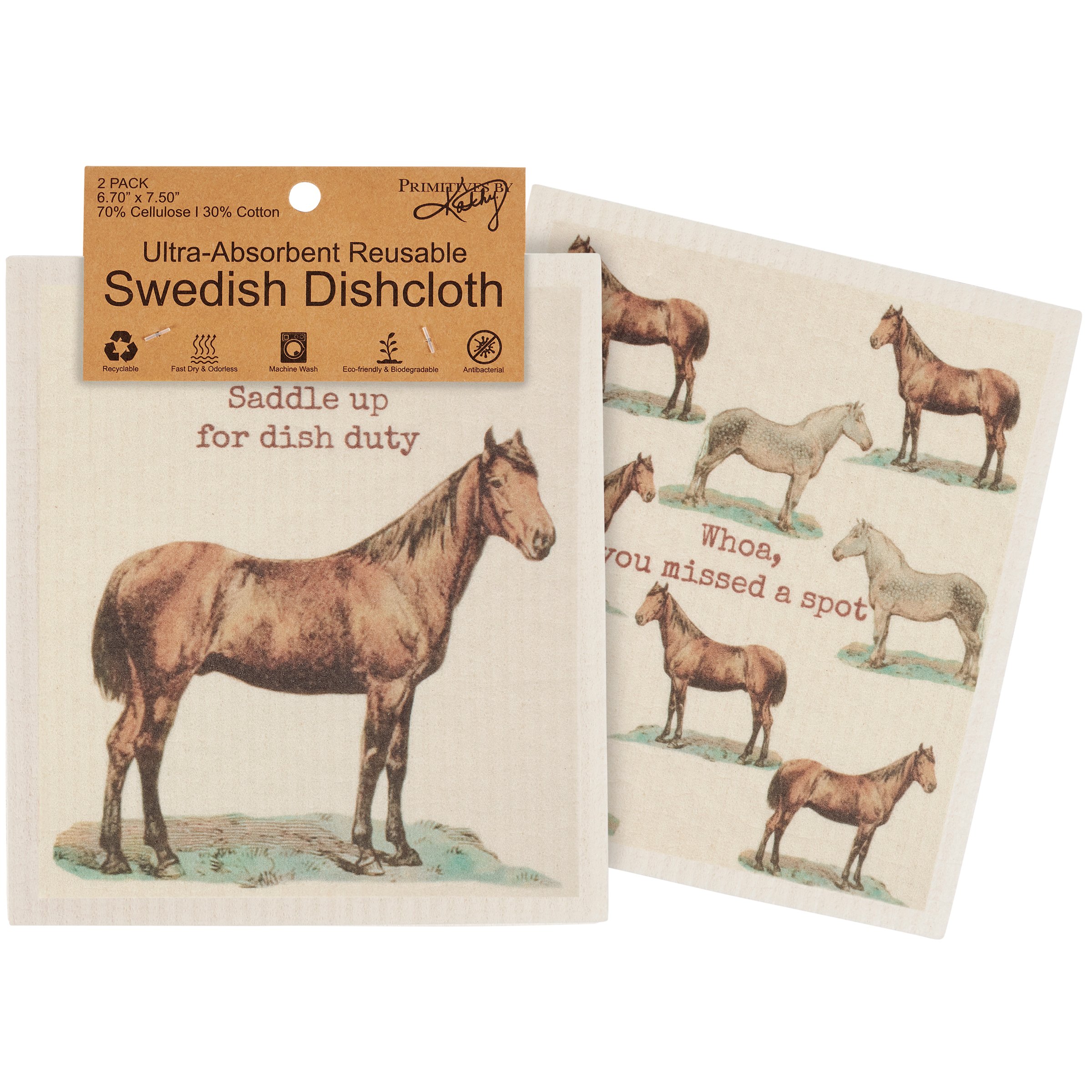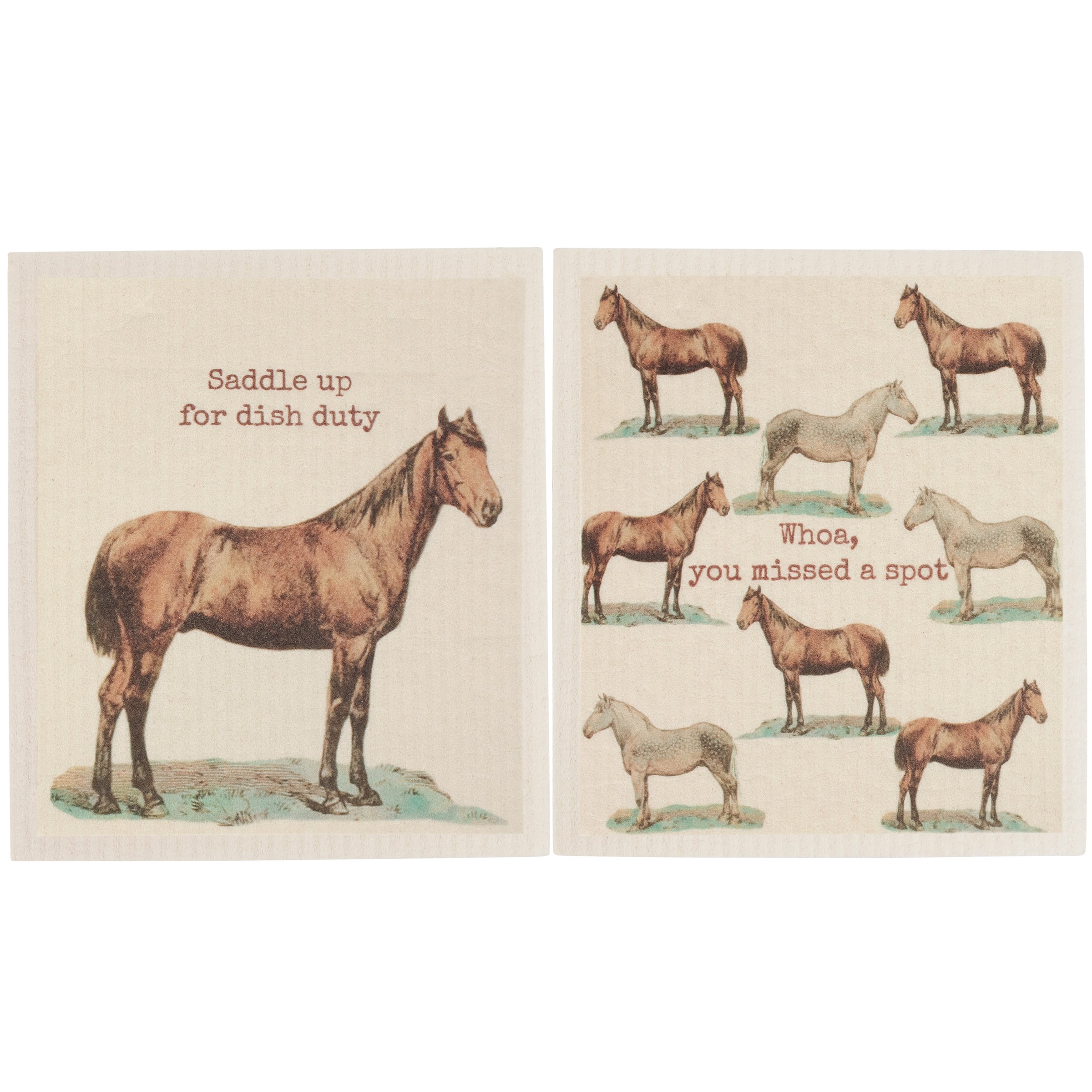 Safe to use on all types of surfaces, eco-friendly Swedish Dishcloths dry quickly and are antibacterial for more hygienic cleaning with reduced waste. This set of 2 Swedish Dishcloths from our Farmhouse Collection features vintage art of horses with fun horse puns. Horse designs include a horse under a "Saddle Up For Dish Duty" sentiment on one dishcloth and a horse pattern with a "Whoa, You Missed A Spot" sentiment on the other dishcloth. Our Saddle Up Swedish cloth set is ultra-absorbent and conveniently machine-washable for easy cleaning and reuse. Dishcloths are attached to header card with hole for easy rack display. A fun horse themed set of reusable dishcloths perfect for replacing dull sponges and paper towels with long-lasting colorful designs.