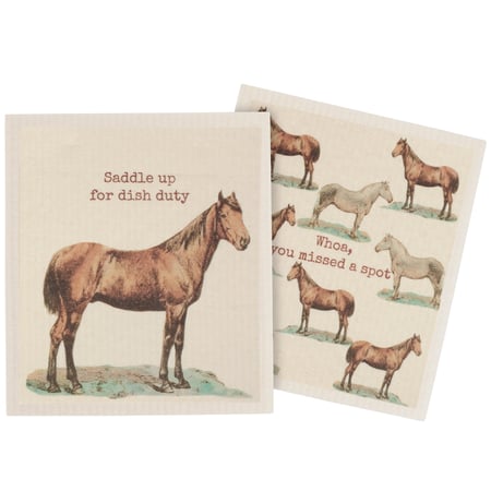 Safe to use on all types of surfaces, eco-friendly Swedish Dishcloths dry quickly and are antibacterial for more hygienic cleaning with reduced waste. This set of 2 Swedish Dishcloths from our Farmhouse Collection features vintage art of horses with fun horse puns. Horse designs include a horse under a "Saddle Up For Dish Duty" sentiment on one dishcloth and a horse pattern with a "Whoa, You Missed A Spot" sentiment on the other dishcloth. Our Saddle Up Swedish cloth set is ultra-absorbent and conveniently machine-washable for easy cleaning and reuse. Dishcloths are attached to header card with hole for easy rack display. A fun horse themed set of reusable dishcloths perfect for replacing dull sponges and paper towels with long-lasting colorful designs.