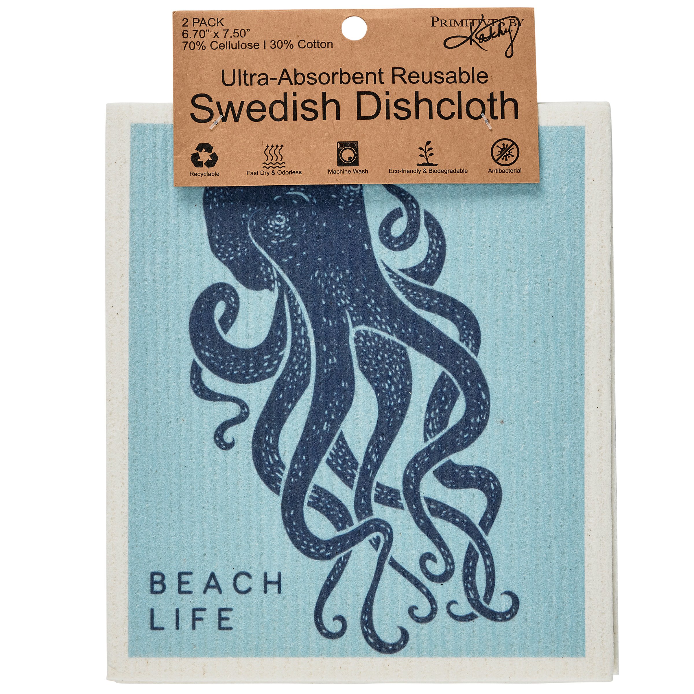 Safe to use on all types of surfaces, eco-friendly Swedish Dishcloths dry quickly and are antibacterial for more hygienic cleaning with reduced waste. This set of two Swedish Dishcloths from our Beach Collection features sea creature inspired designs in a block print art style. Designs include octopus with "Beach Life" sentiment on one dishcloth and a pattern of various sea creatures on the other dishcloth. Our Sea Creatures Swedish Dishcloth set is machine-washable for convenient cleaning. Dishcloths are attached to header card with hole for easy rack display. A beach-themed set of reusable dishcloths perfect for replacing dull sponges and paper towels with long-lasting colorful designs.