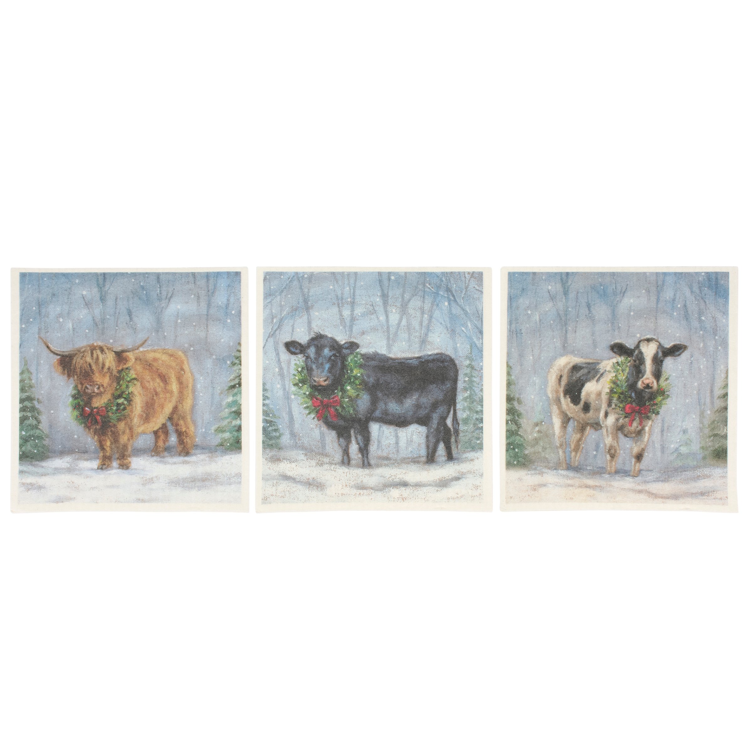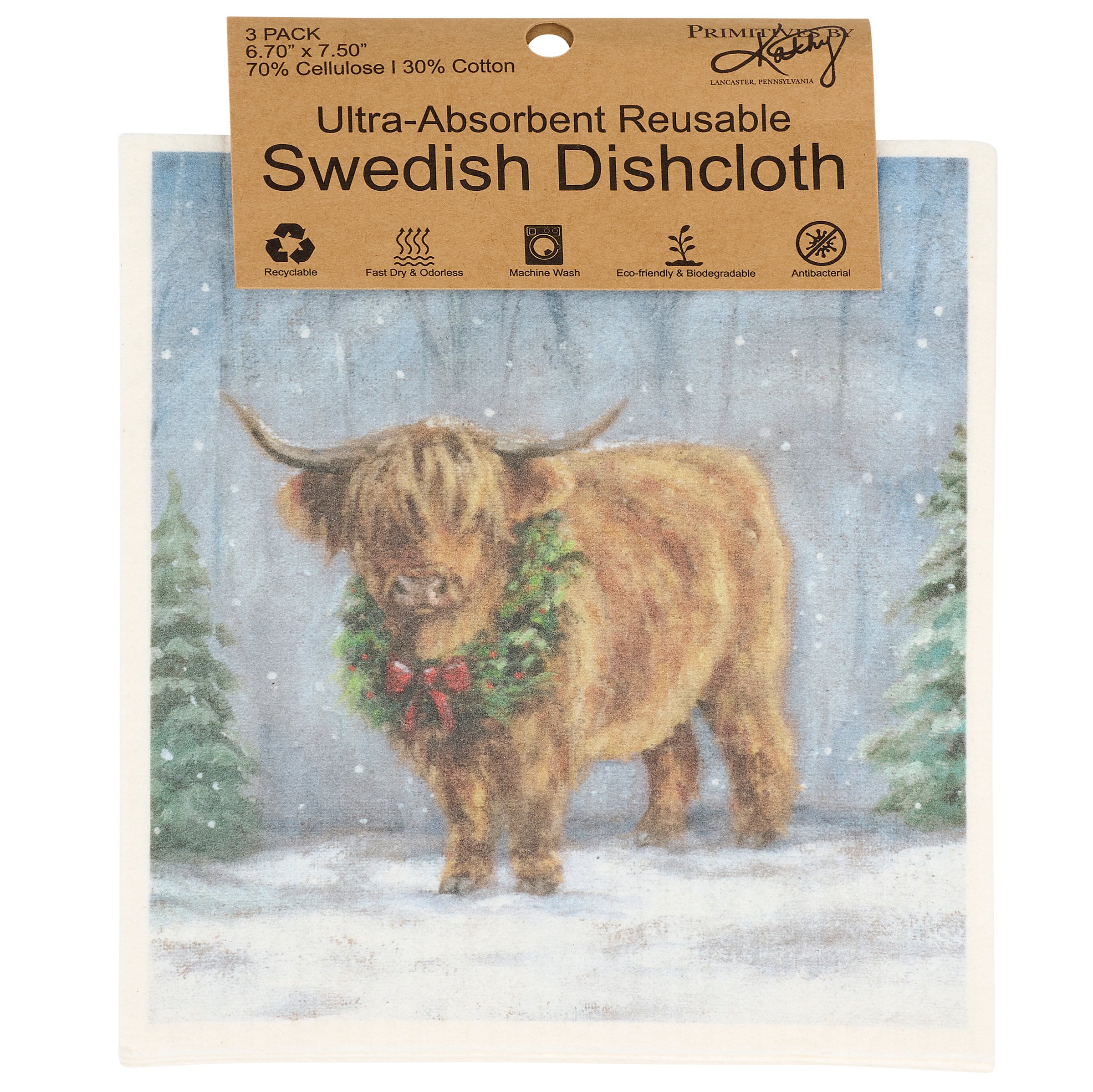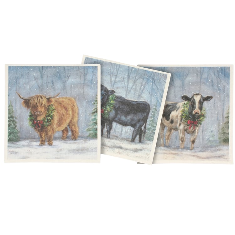 Safe to use on all types of surfaces, eco-friendly Swedish Dishcloths dry quickly and are antibacterial for more hygienic cleaning with reduced waste. This set of 2 Swedish Dishcloths from our Christmas Collection features charming winter scenes of various farm cows wearing holiday wreaths on each dishcloth. Winter cow designs are replicated from original artwork painted onto burlap canvas, giving the art a unique depth and texture. Our Snowy Cows Swedish cloth set is ultra-absorbent and conveniently machine-washable for easy cleaning and reuse. Seasonal dishcloths are attached to header card with hole for easy rack display. A farm themed set of reusable dishcloths perfect for replacing dull sponges and paper towels with long-lasting colorful designs.