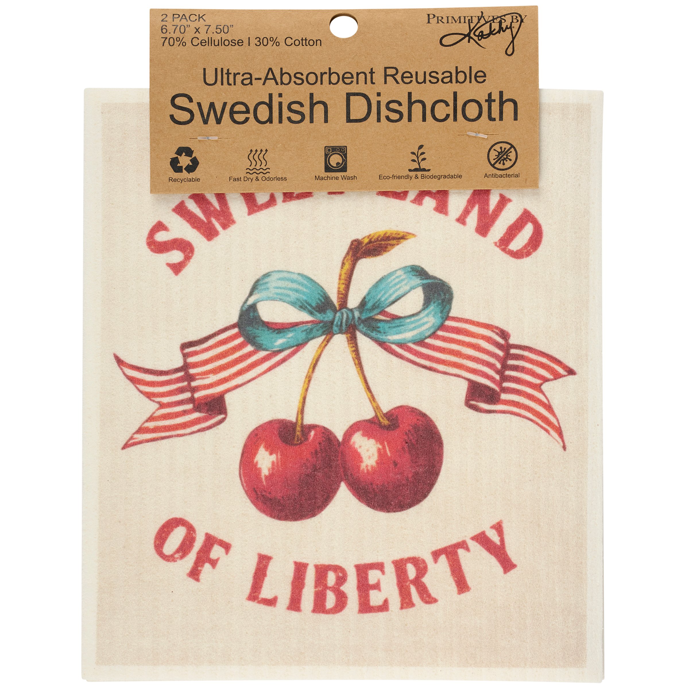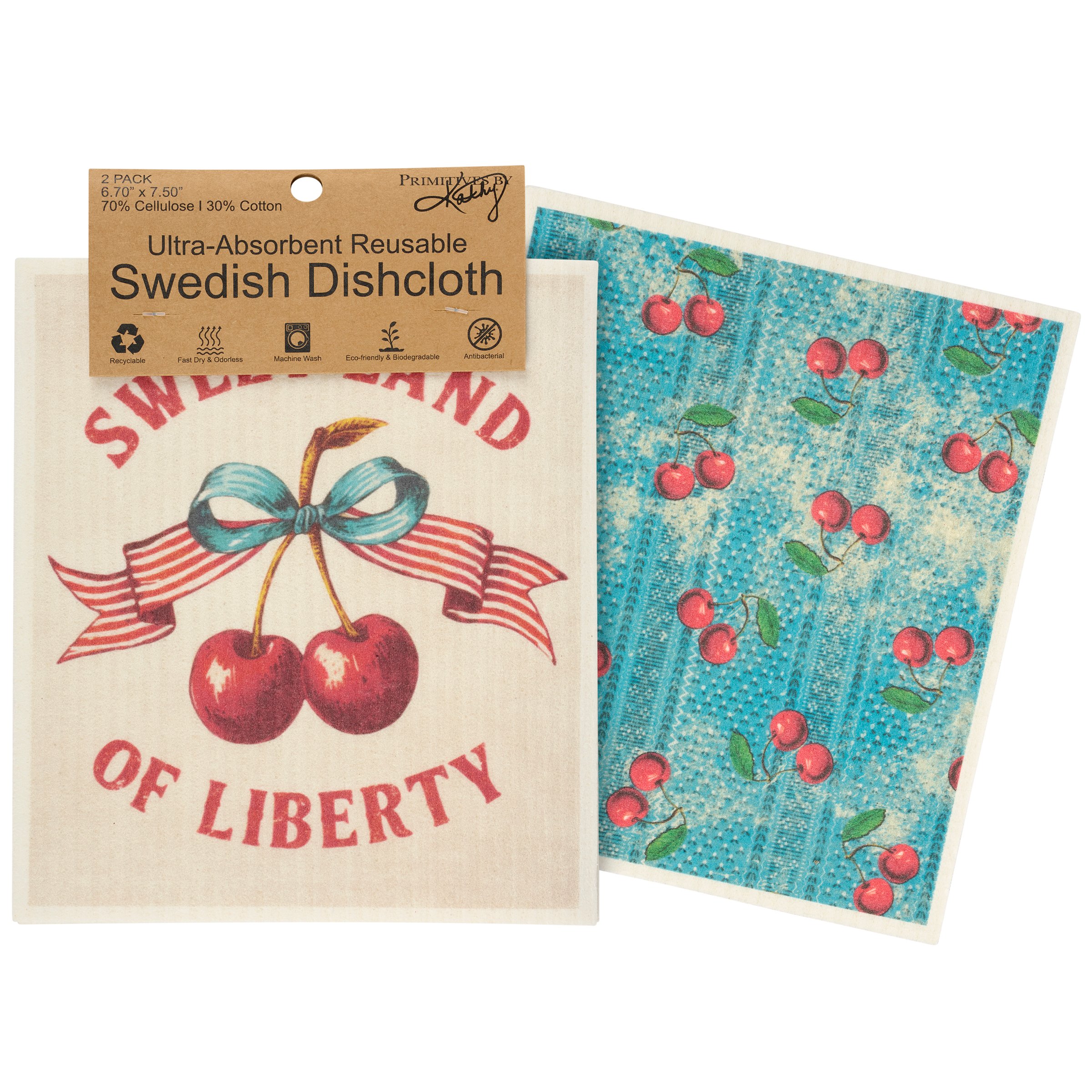 Safe to use on all types of surfaces, eco-friendly Swedish Dishcloths dry quickly and are antibacterial for more hygienic cleaning with reduced waste. This set of 2 Swedish Dishcloths from our Patriotic Collection features cherry themed designs and a "Sweet Land Of Liberty" sentiment inspired by vintage Americana style. Our Sweet Land Of Liberty Swedish cloth set is ultra-absorbent and conveniently machine-washable for easy cleaning and reuse. Patriotic dishcloths are attached to header card with hole for easy rack display. A patriotic set of reusable dishcloths perfect for replacing dull sponges and paper towels with long-lasting colorful designs.