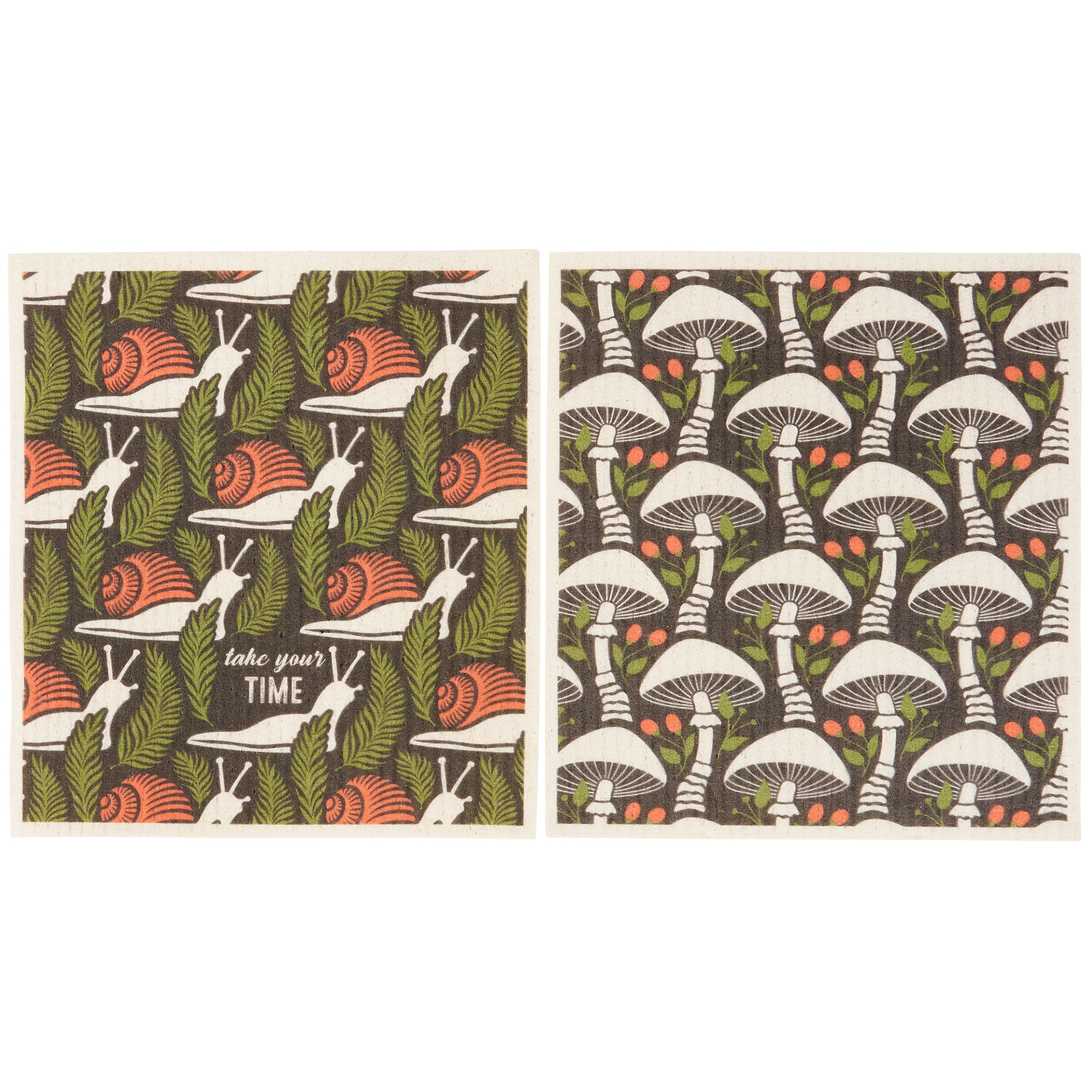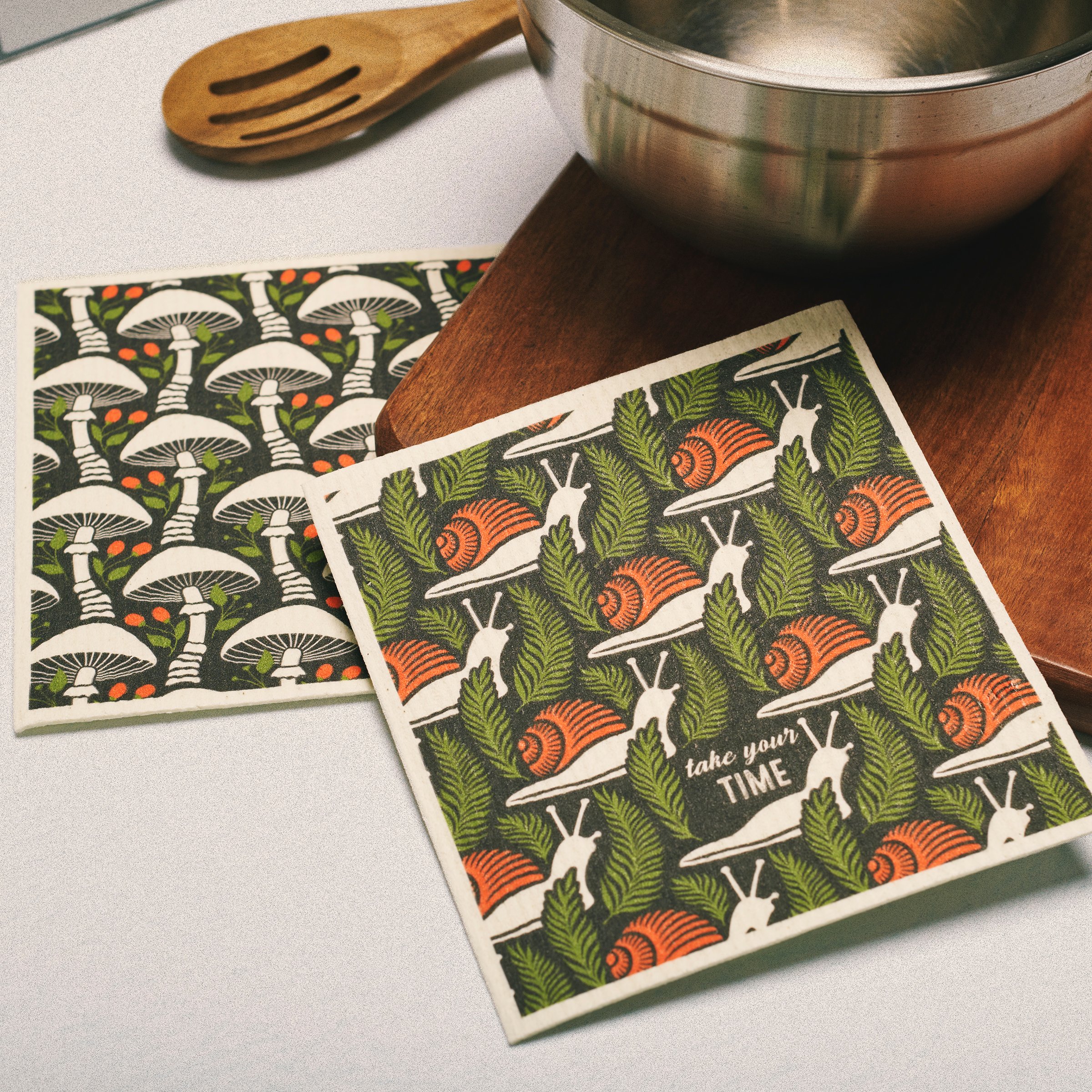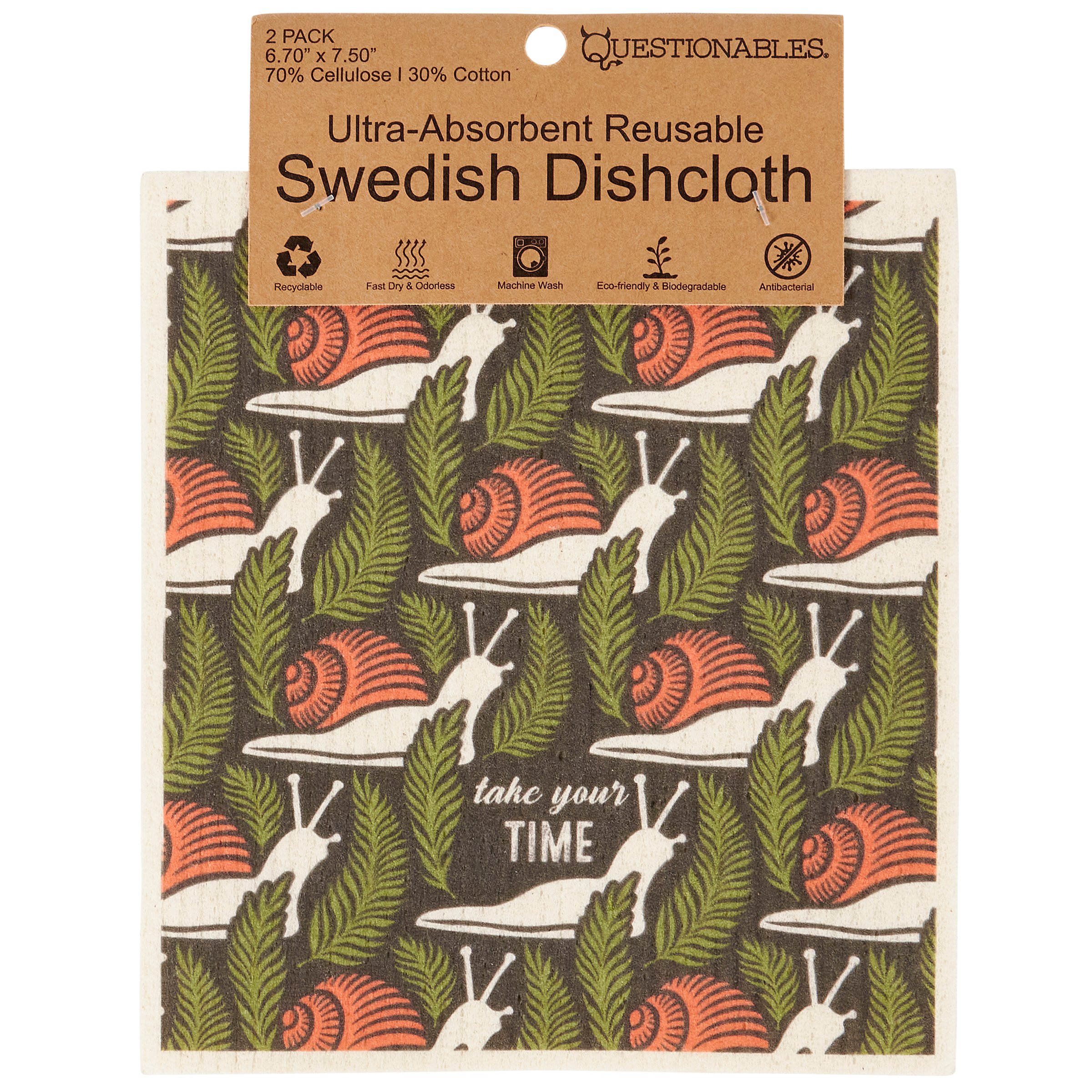 Safe to use on all types of surfaces, eco-friendly Swedish Dishcloths dry quickly and are antibacterial for more hygienic cleaning with reduced waste. This chill set of 2 Swedish Dishcloths displays relaxing patterns of mushrooms and snails with a down-to-earth sentiment that reads "Take Your Time." Questionables Swedish Dishcloth sets are ultra absorbent to soak up whatever you throw at them and machine washable for stress-free cleaning. Dishcloths are attached to a header card with hole for easy rack display. Our Take Time Swedish Dishcloth set is designed to maximize chill at home or for gifting to pass that feeling to someone who needs it while replacing dull sponges and paper towels with long-lasting colorful designs.