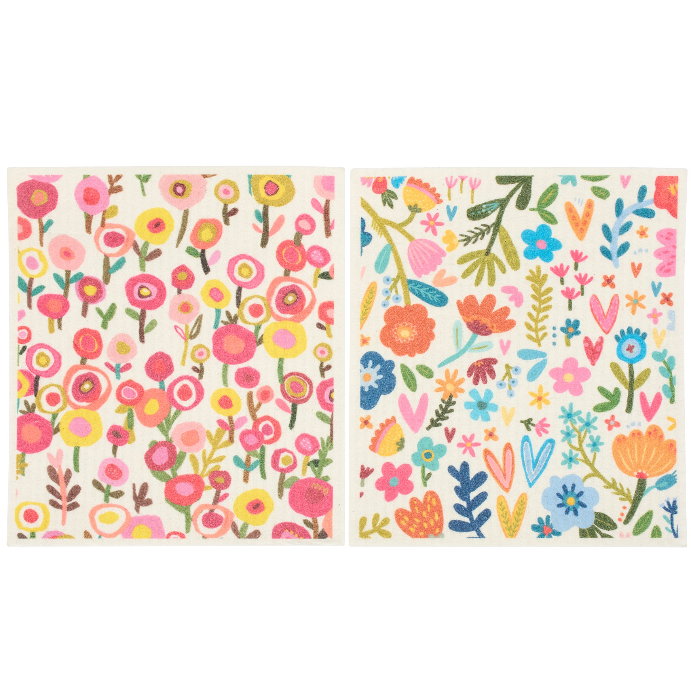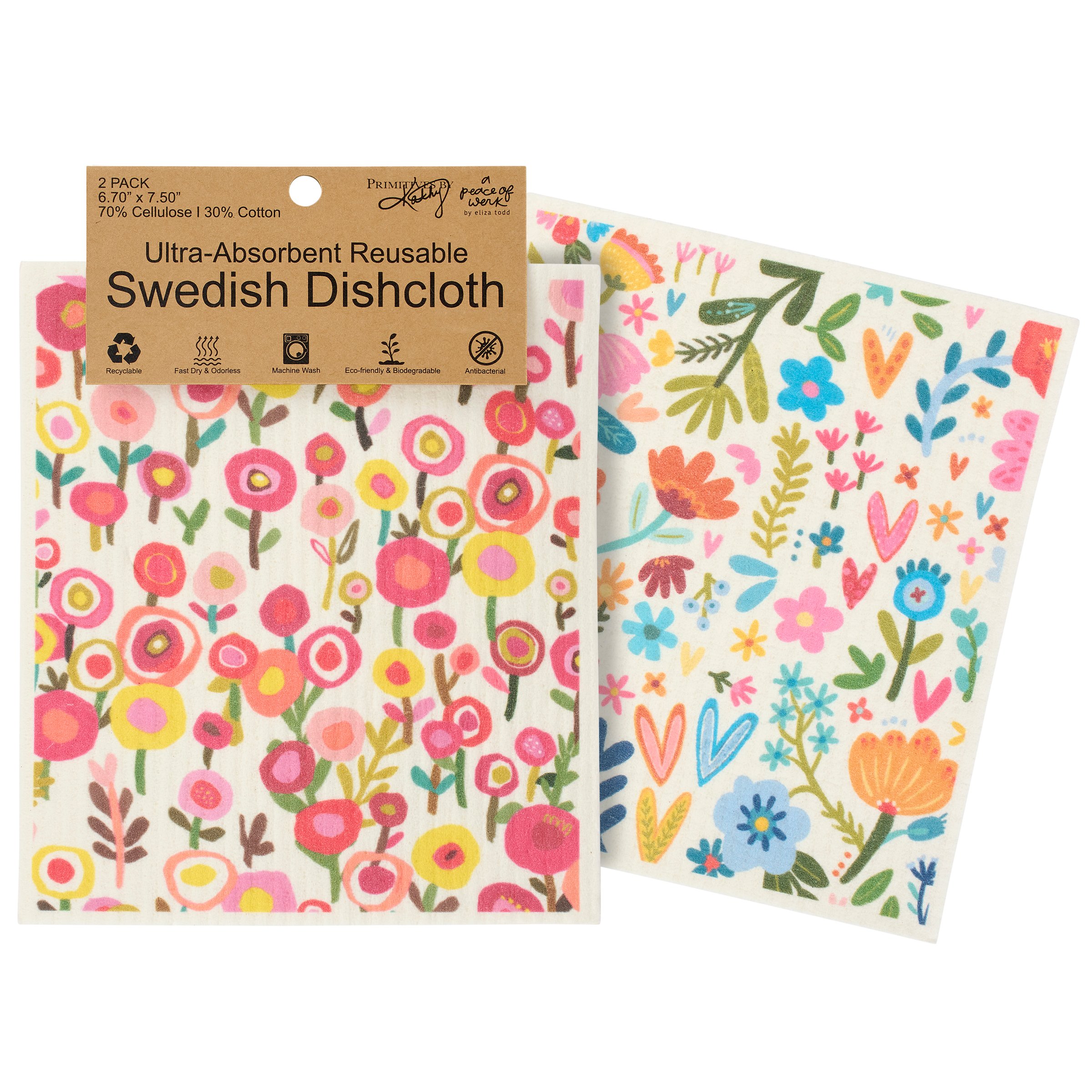 Safe to use on all types of surfaces, eco-friendly Swedish Dishcloths dry quickly and are antibacterial for more hygienic cleaning with reduced waste. This set of 2 Swedish Dishcloths from our Inspiration & Blooms Collection features patterns of vibrant florals with white backgrounds on each cloth. Floral designs are replicated from original hand illustrated artwork. Our White Floral Swedish cloth set is ultra-absorbent and conveniently machine-washable for easy cleaning and reuse. Dishcloths are attached to header card with hole for easy rack display. A stylish floral themed set of reusable dishcloths perfect for replacing dull sponges and paper towels with long-lasting colorful designs.