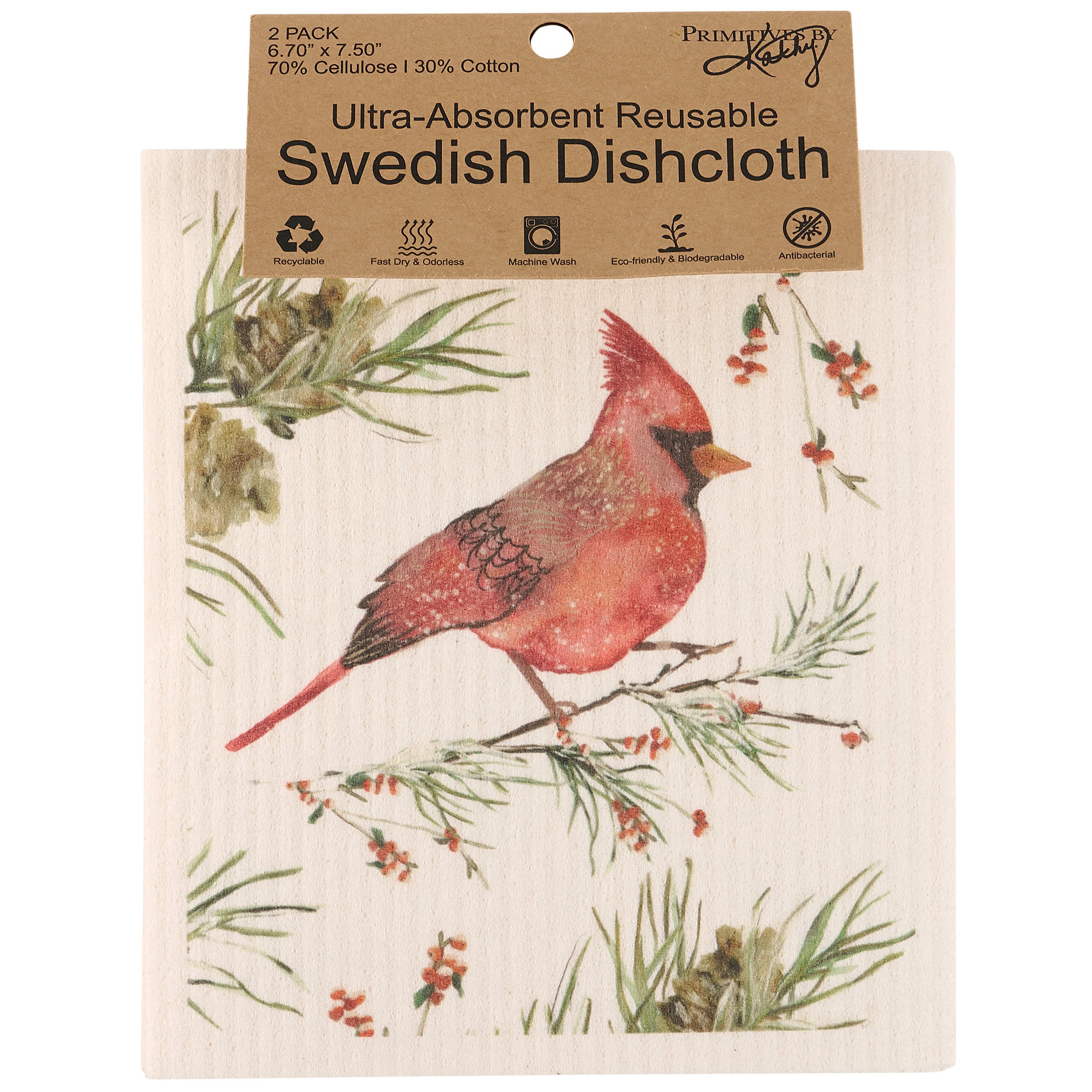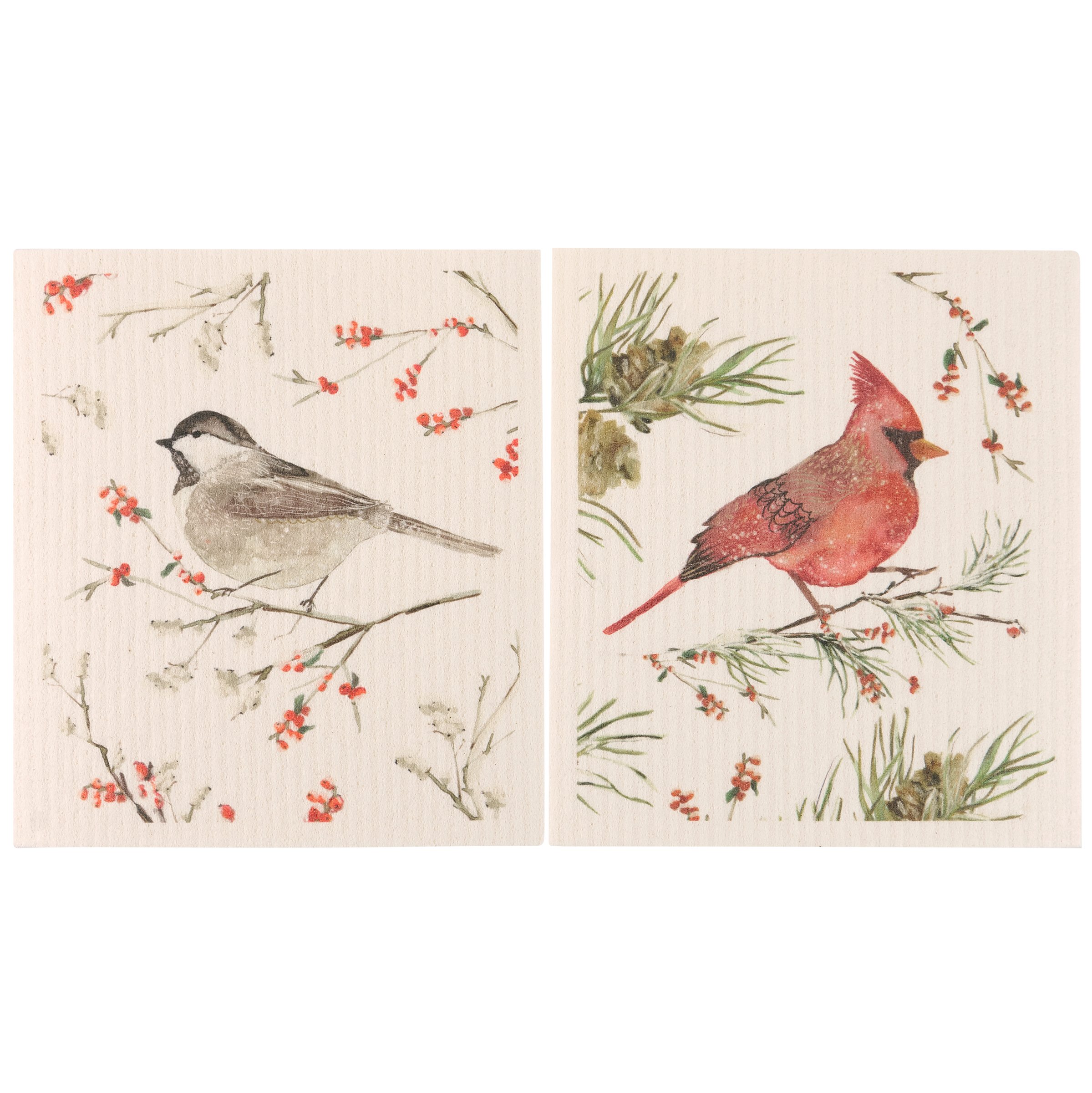 Safe to use on all types of surfaces, eco-friendly Swedish Dishcloths dry quickly and are antibacterial for more hygienic cleaning with reduced waste. This set of 2 Swedish Dishcloths from our Christmas Collection features charming winter scenes of a red cardinal and a chickadee perched on a snowy branch. Winter bird designs are replicated from original art hand painted in a unique watercolor style. Our Winter Birds Swedish cloth set is ultra-absorbent and conveniently machine-washable for easy cleaning and reuse. Seasonal dishcloths are attached to header card with hole for easy store rack display. A rustic winter-themed set of reusable seasonal dishcloths perfect for replacing dull sponges and paper towels with long-lasting colorful designs.