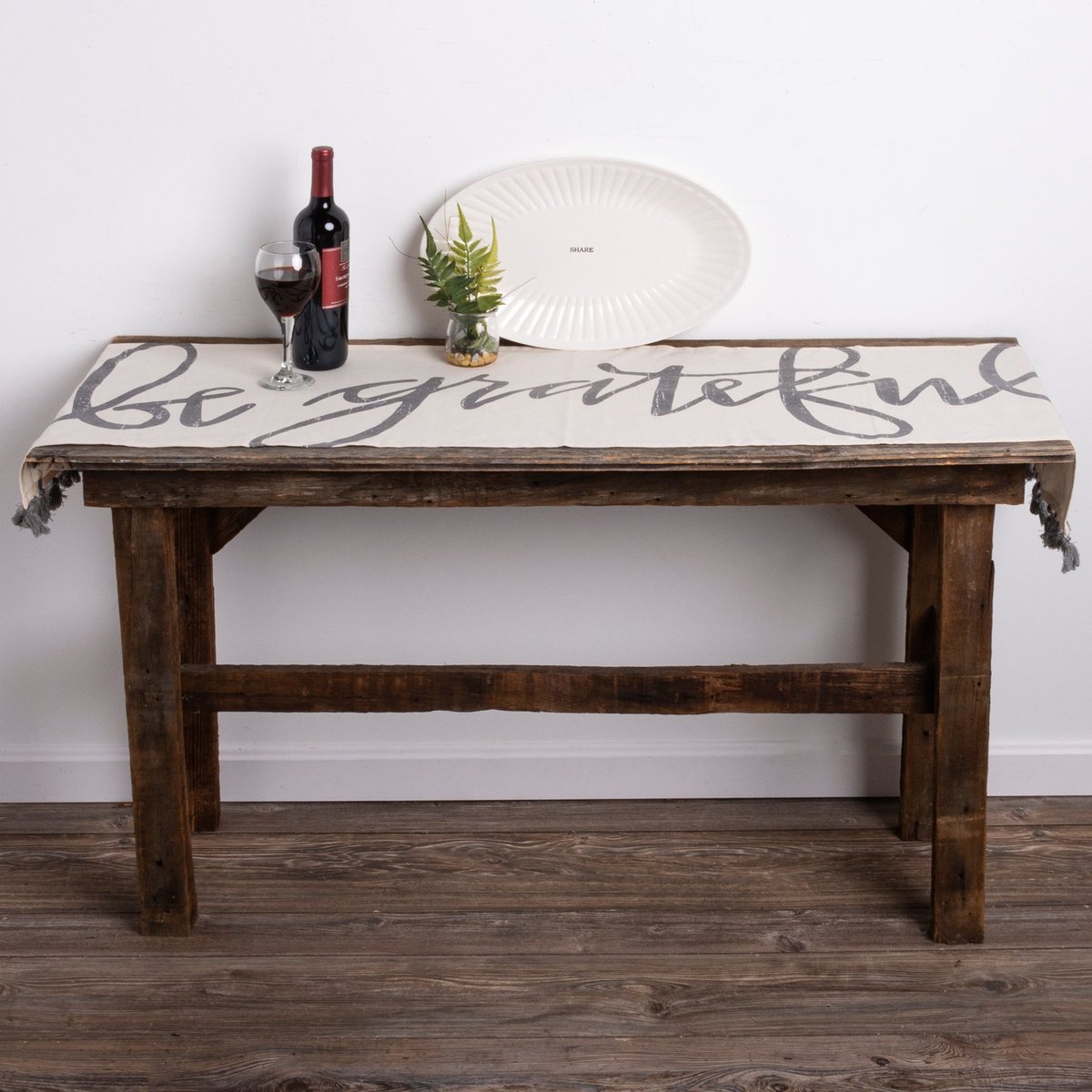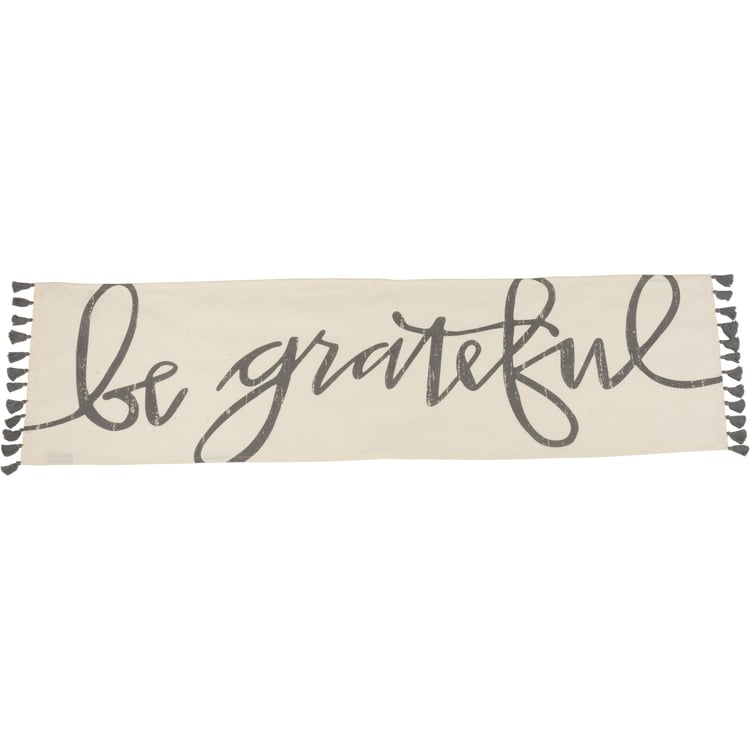 A cotton table runner featuring a distressed "Be Grateful" hand lettered sentiment in a neutral palette with tassel trim details. Complements well with existing decor or coordinating design pieces.
