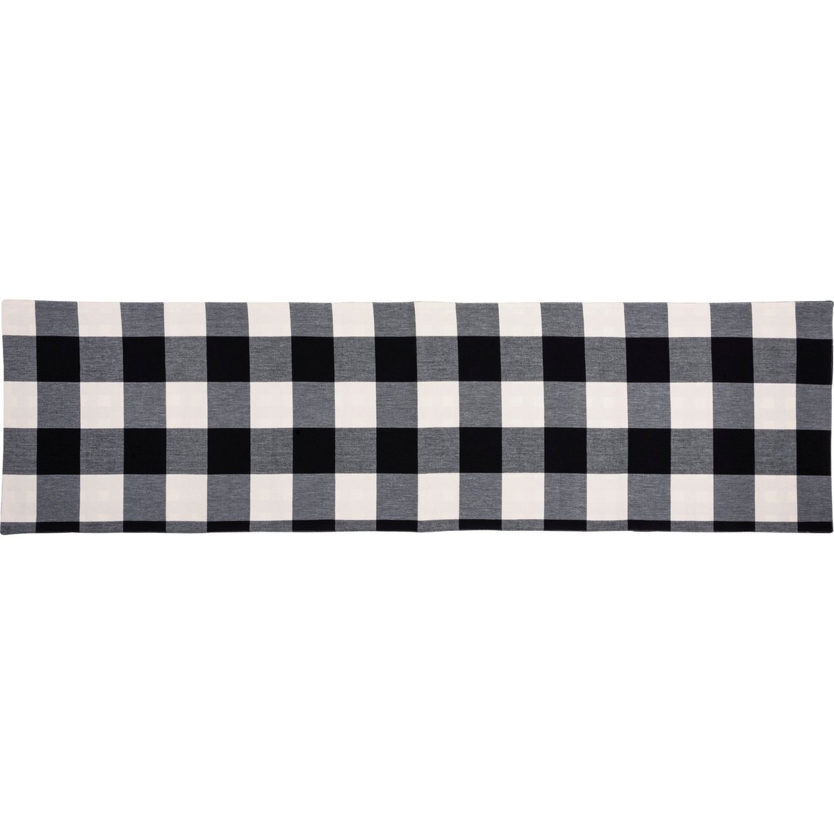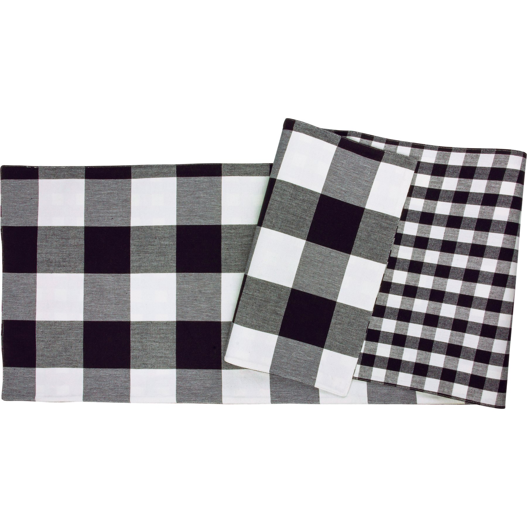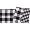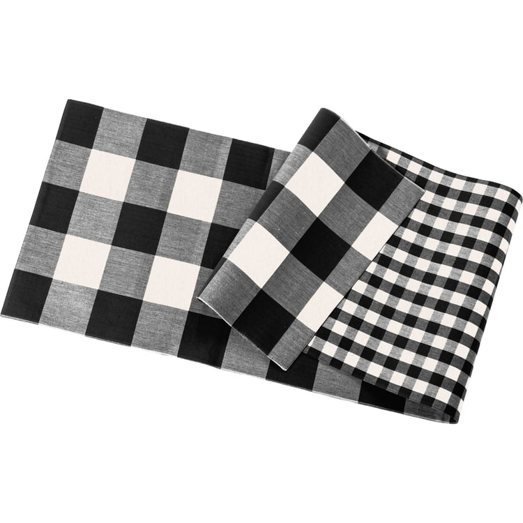A double-sided cotton buffalo check table runner from our Plaid Collection featuring black and white plaid designs. Front features large buffalo check pattern and reverse side features smaller gingham pattern. The black buffalo table runner is machine-washable.