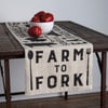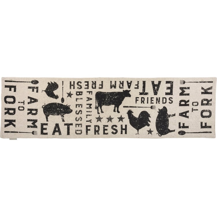 A black and white cotton table runner lending various distressed farm-inspired sentiments with utensil, farm animal, and star designs in a neutral palette. Complements well with coordinating design pieces for a rustic decor collection.