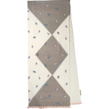 A 1980s Memphis-inspired cotton table runner featuring embroidered pink and blue eye designs, subtle color blocked accents, and multicolored fringe trim. Complements well with other coordinating Memphis style collection pieces.