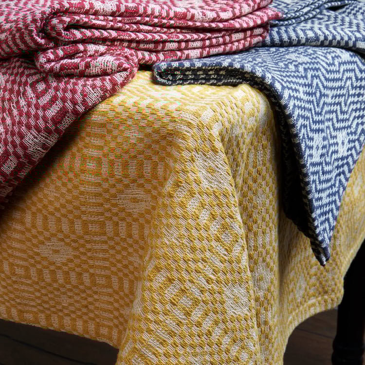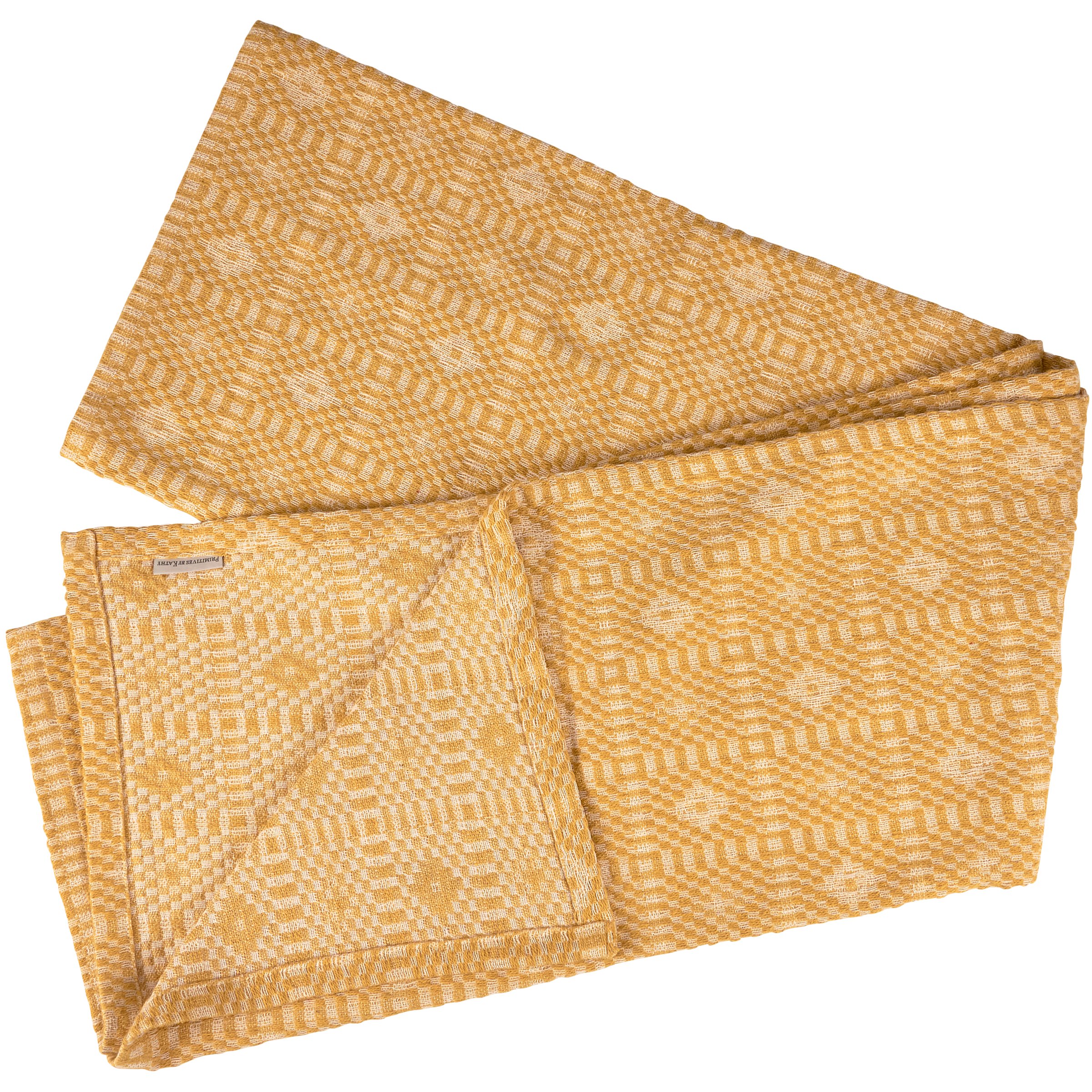 A cotton tablecloth from our Primitive Collection displaying a diamond pattern in gold and cream. Our Gold Diamonds tablecloth is conveniently machine-washable for easy cleaning. Measures 52 by 52 inches of length for plenty of coverage.