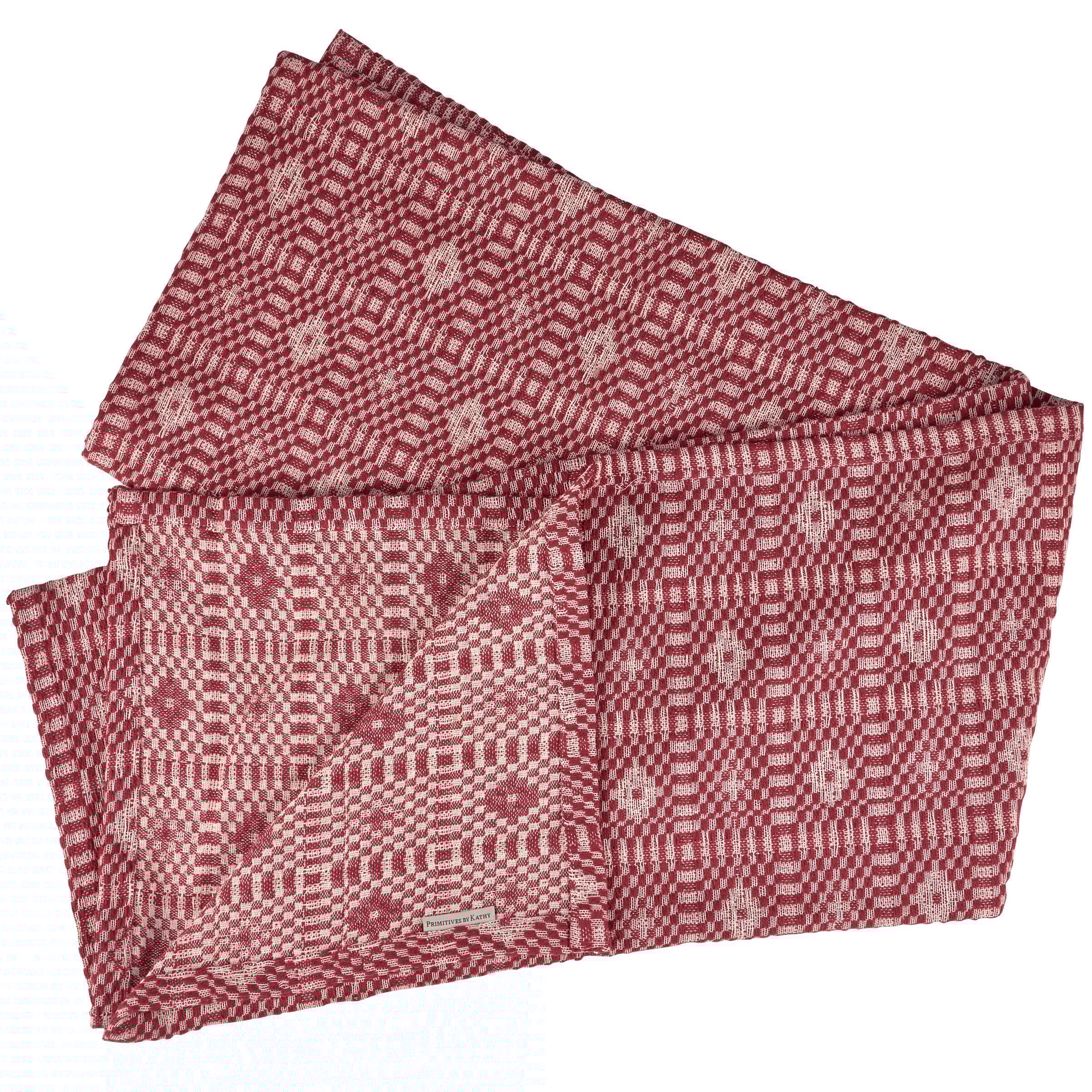 A cotton tablecloth from our Primitive Collection displaying a diamond pattern in red and cream. Our Red Diamonds tablecloth is conveniently machine-washable for easy cleaning. Measures 52 by 52 inches of length for plenty of coverage.