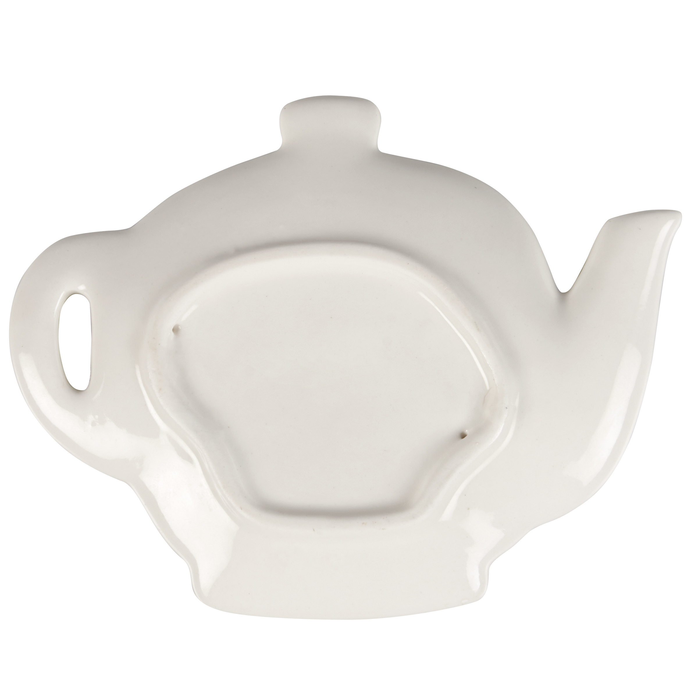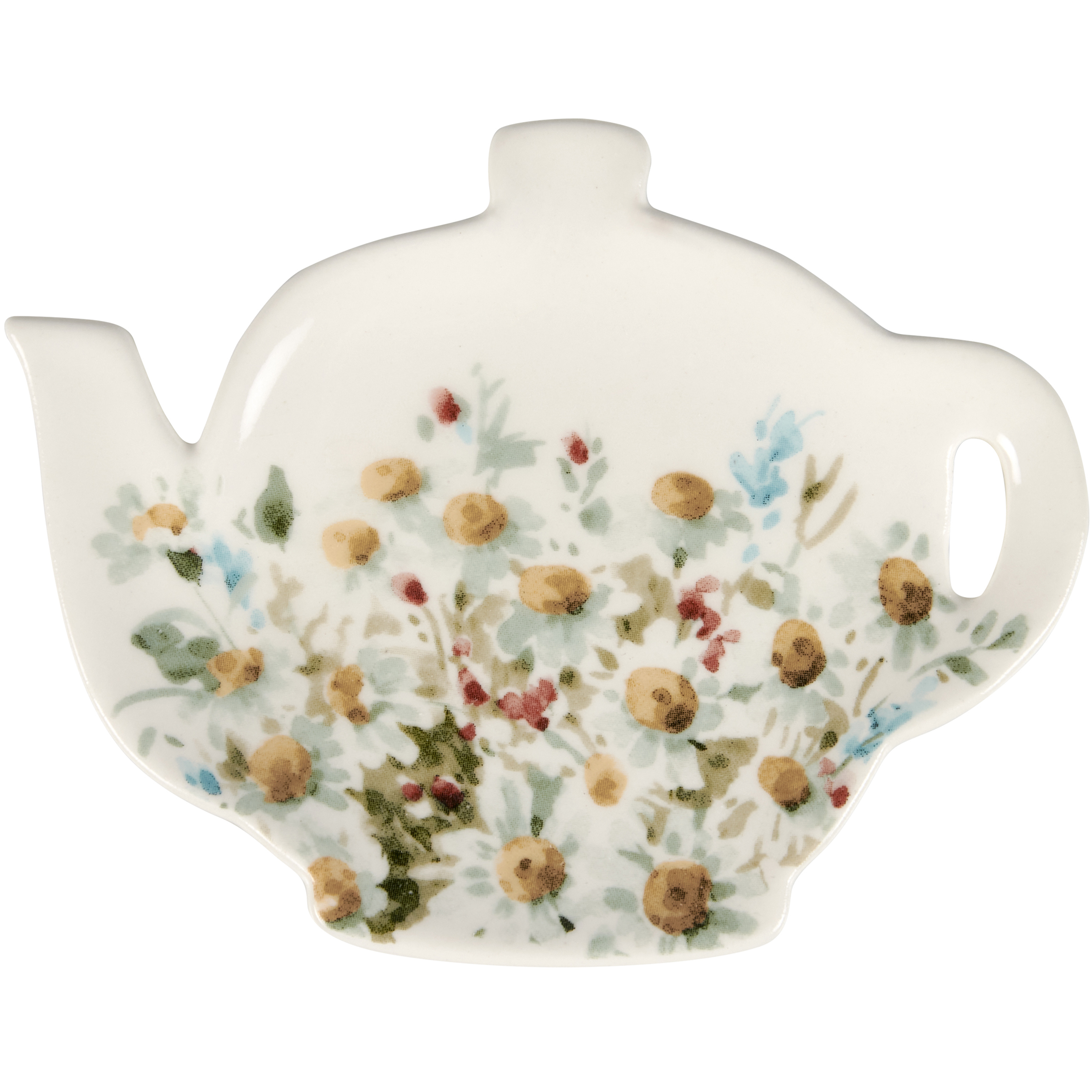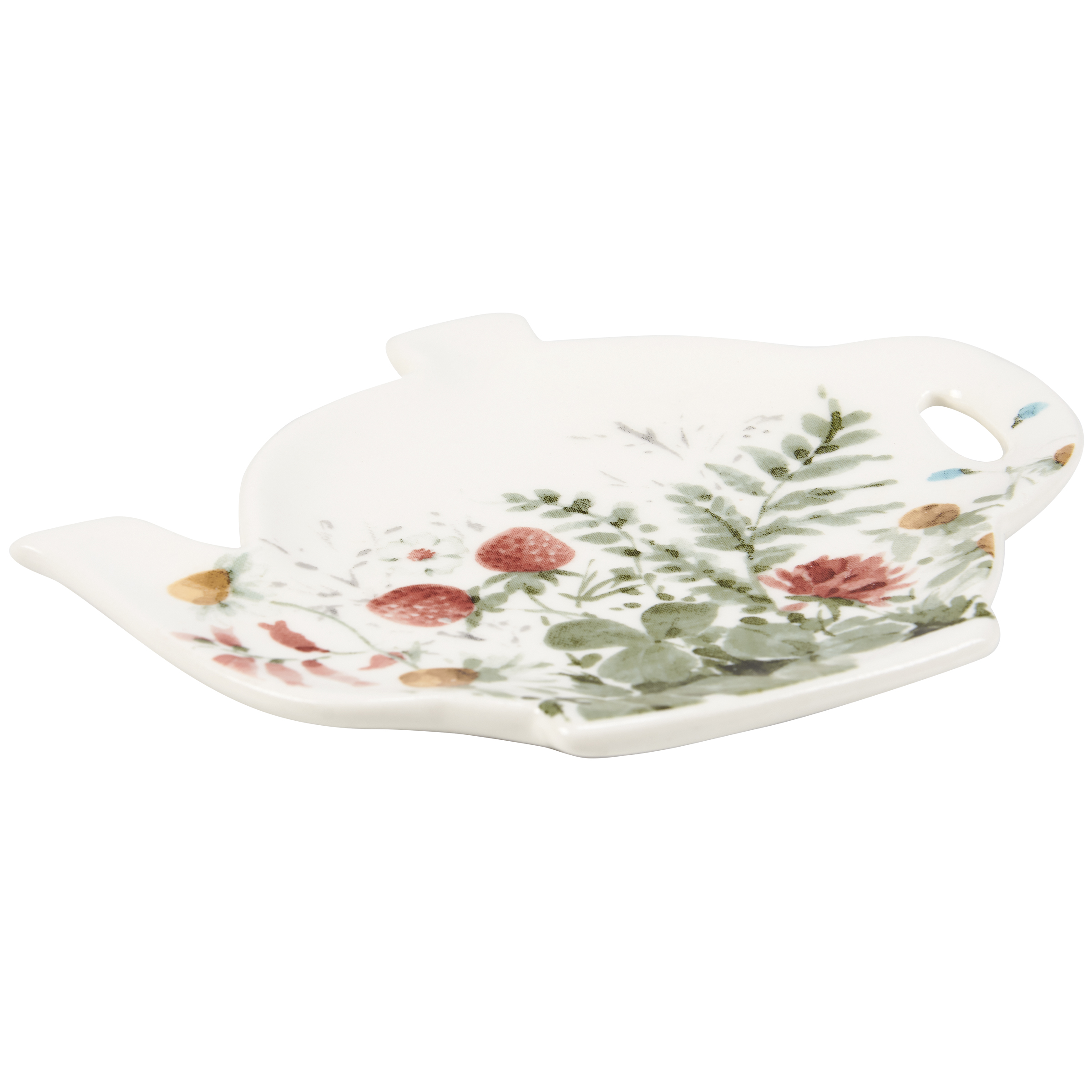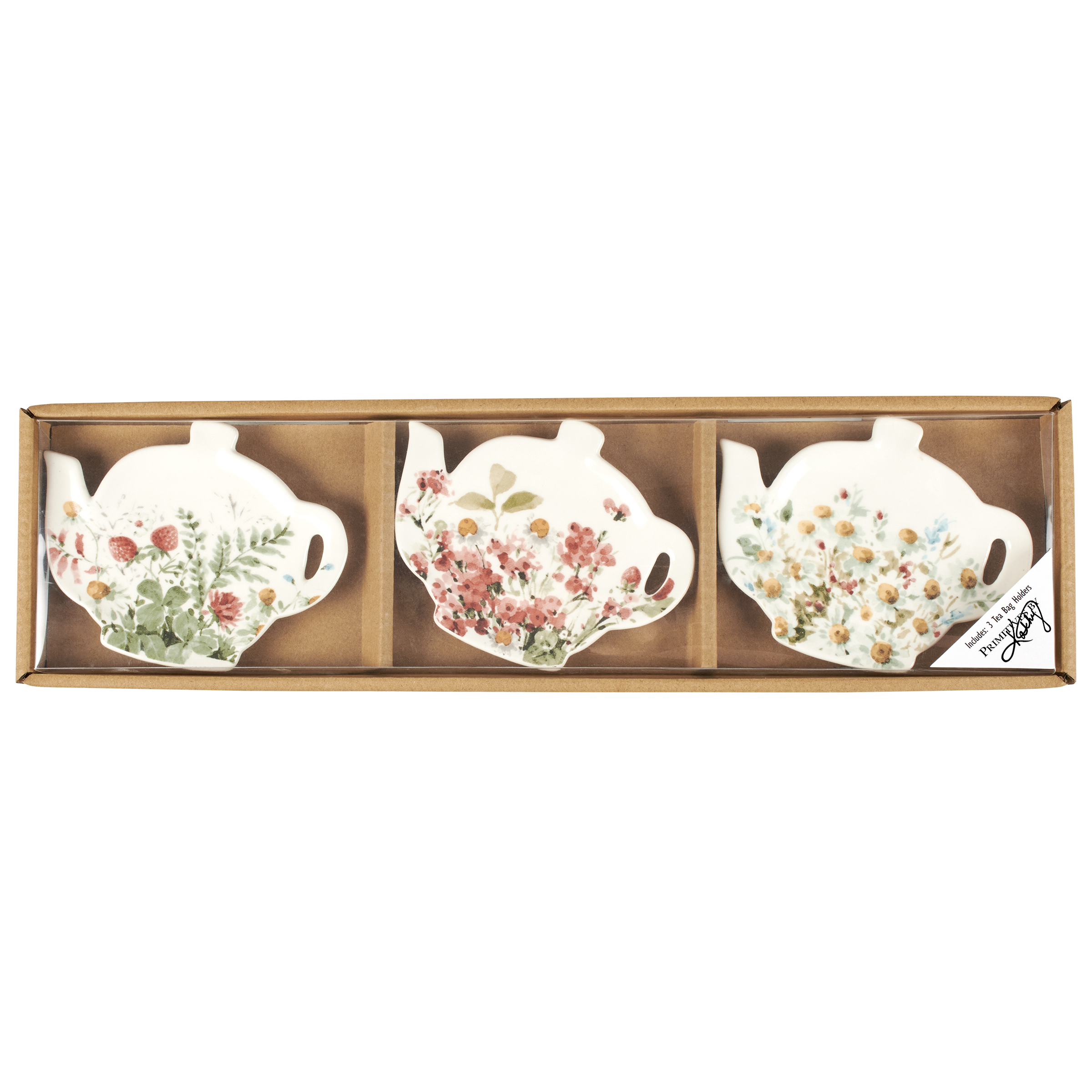 A set of three stoneware tea bag holders from our Tea & Coffee Collection displaying individual hand painted designs on each. Holders feature teapot shape and designs of wildflowers in a delicate watercolor style. Our Florals tea bag holder set is microwave, dishwasher, and food safe for convenient use. Packaged together in a cardboard box displaying designs through acrylic lid. A charming set of tabletop accessories perfect for everyday use.