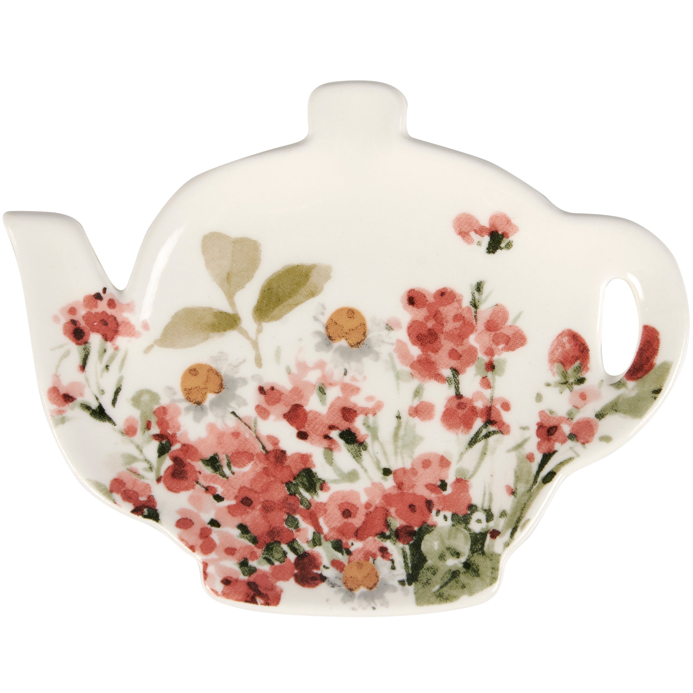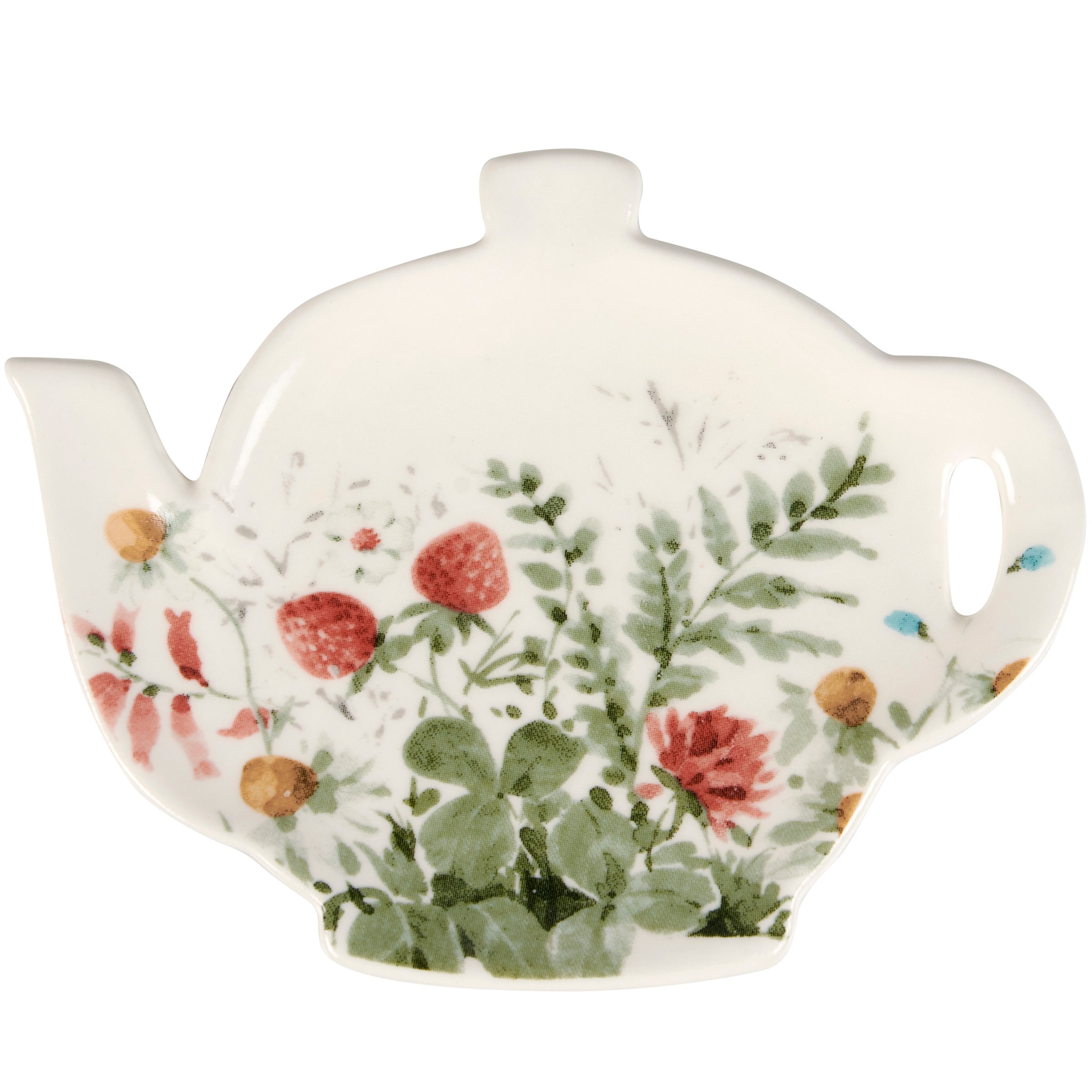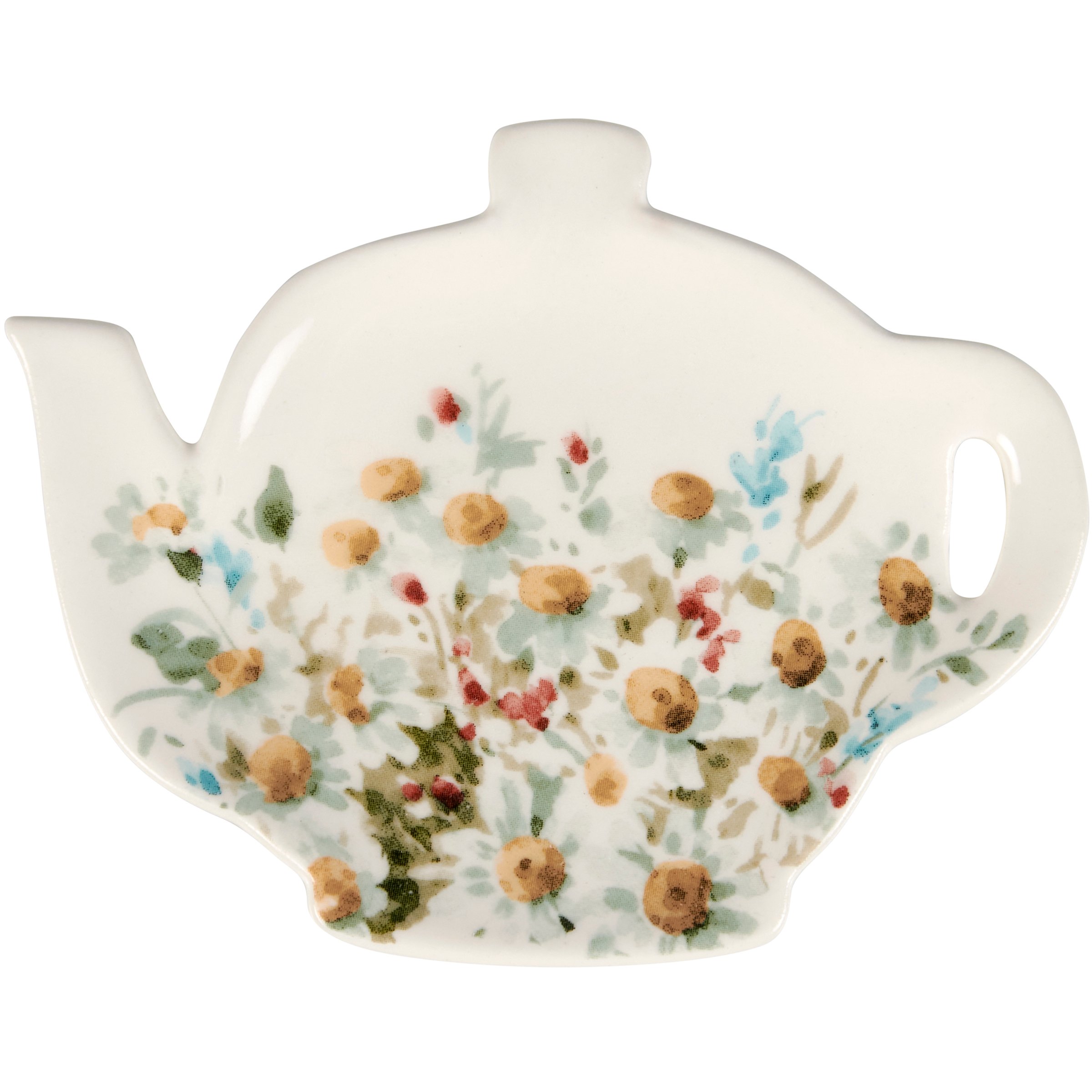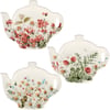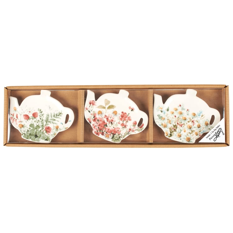 A set of three stoneware tea bag holders from our Tea & Coffee Collection displaying individual hand painted designs on each. Holders feature teapot shape and designs of wildflowers in a delicate watercolor style. Our Florals tea bag holder set is microwave, dishwasher, and food safe for convenient use. Packaged together in a cardboard box displaying designs through acrylic lid. A charming set of tabletop accessories perfect for everyday use.