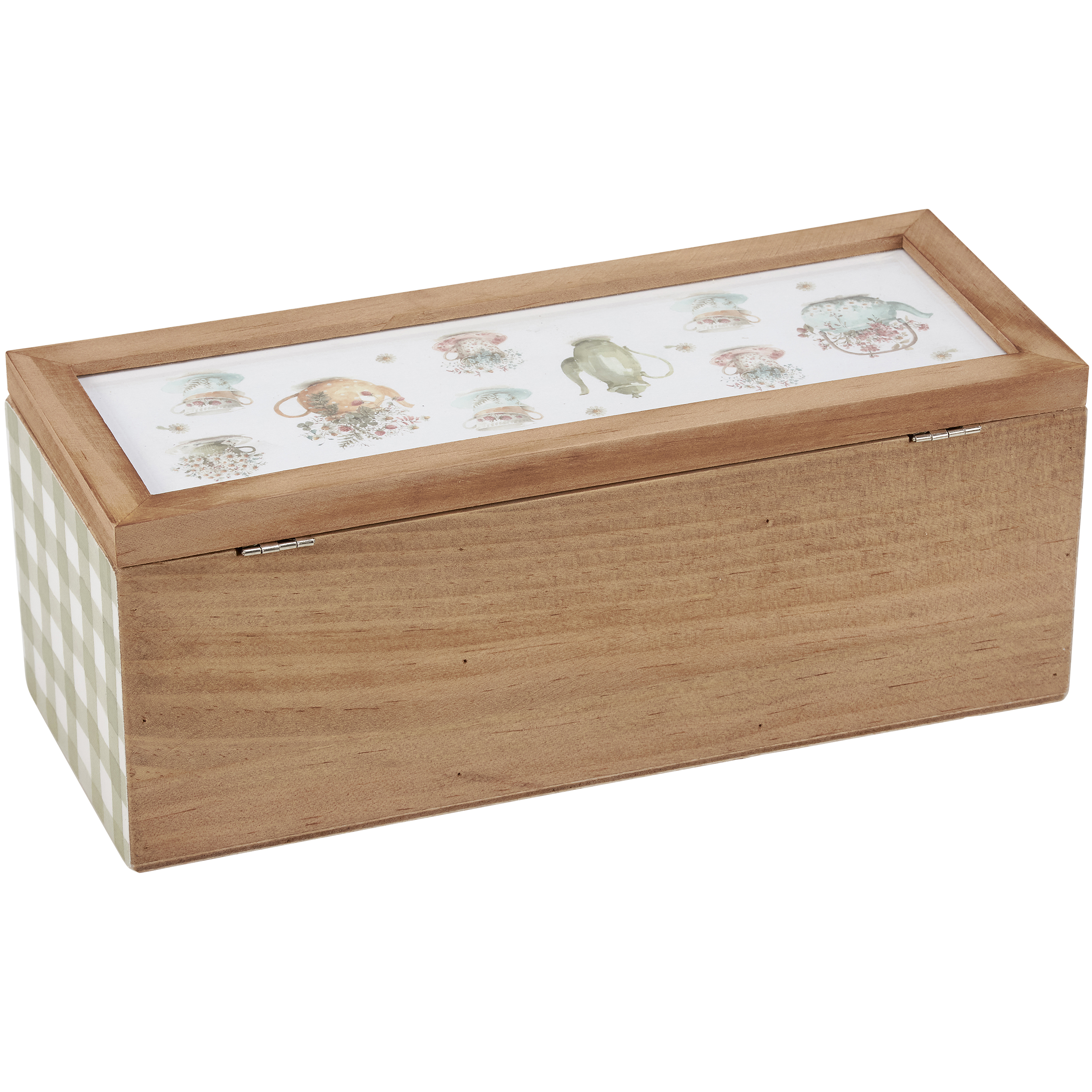 A wooden tea box from our Tea & Coffee Collection designed to organize tea bags into three divided sections. Tea box lid features natural wood with inset design displaying a pattern of teacups, tea pots, and kettles full of wildflowers from original hand painted designs. Box displays hand painted green gingham pattern behind tea-themed sentiment that reads "Tea Is Always A Good Idea." Our Tea Is Always Good tea box holds approximately 40 individually wrapped tea bags. A charming tea-themed gift perfect for an everyday tabletop accessory.