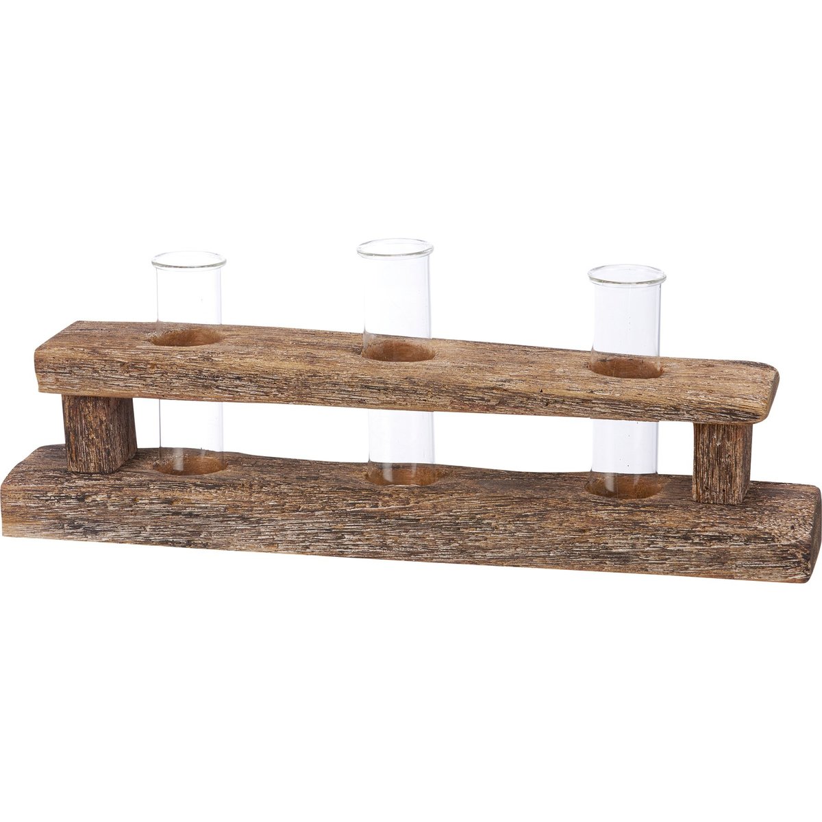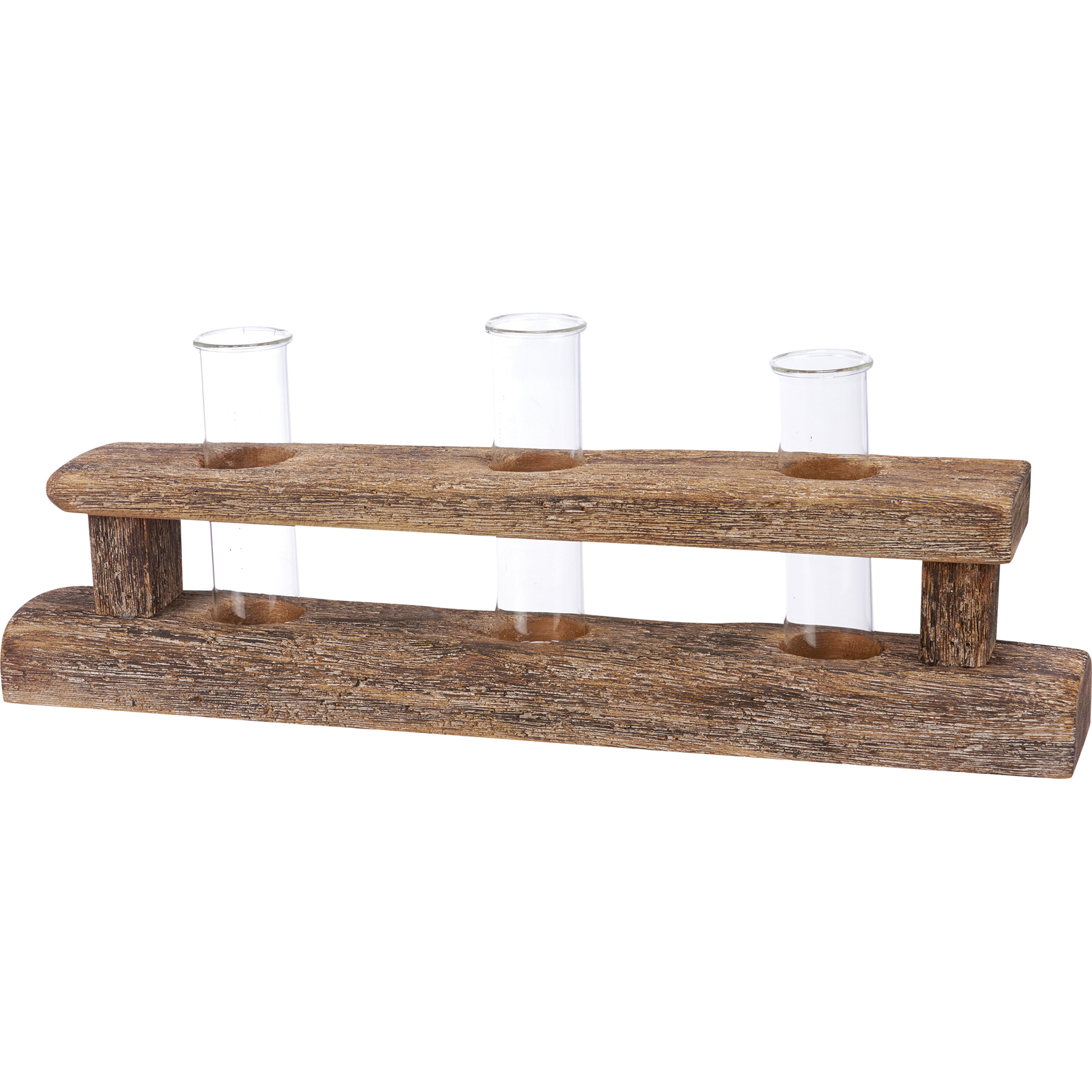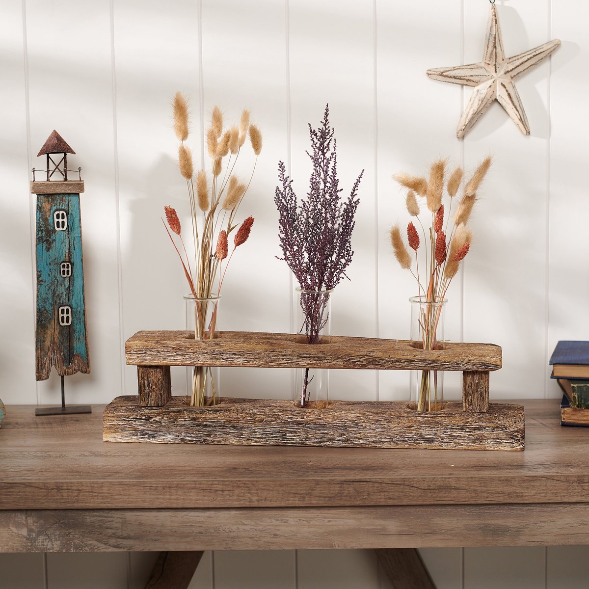 A rustic wooden flower holder designed to display small bunches of stemmed florals. Holder is made with natural wood that gives a driftwood appearance and features three glass inserts in predrilled holes to place florals. Designed to free-stand on any flat surface. Our Driftwood flower holder coordinates well with décor from our Beach Collection. Greenery pictured not included.