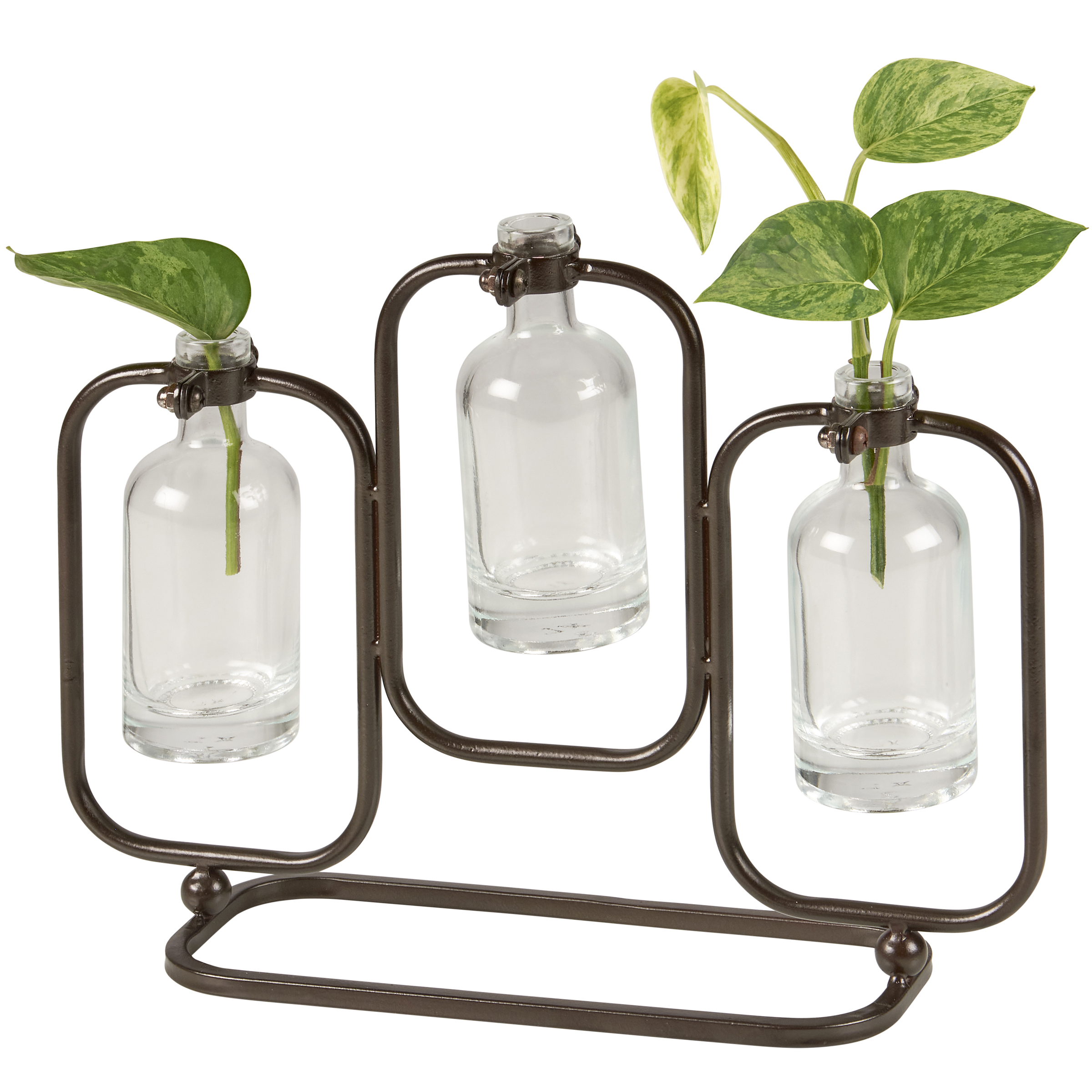 A vase from our Botanical Collection designed to hold the included 3 glass bottle vessels. Test tubes are secured in a simple black metal stand to free-stand on flat surface and easily blend with a variety of décor. Greenery pictured not included. Our Glass Trio test tube vase can be used to propagate plants or display stemmed florals. A rustic plant accessory perfect to use as everyday home décor.