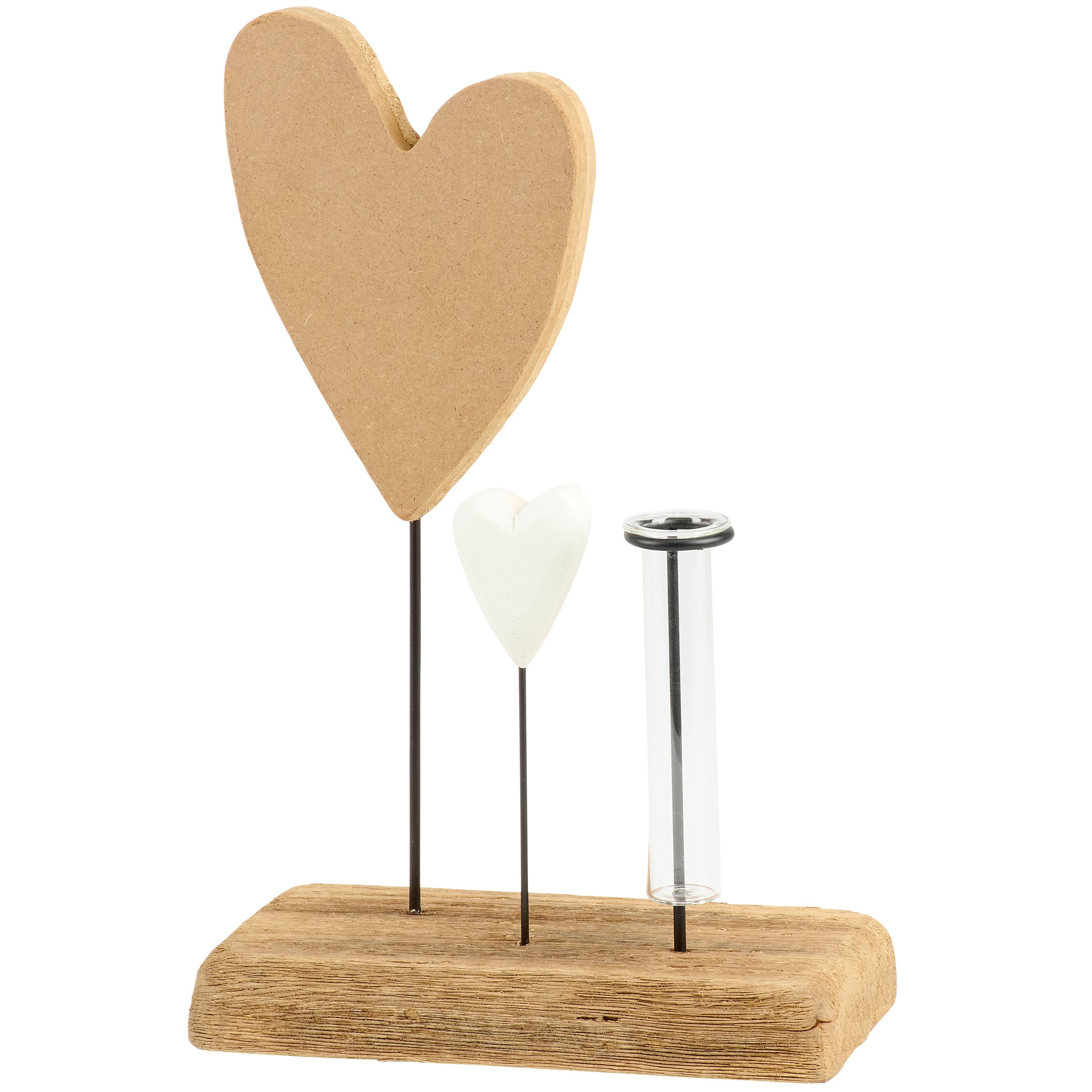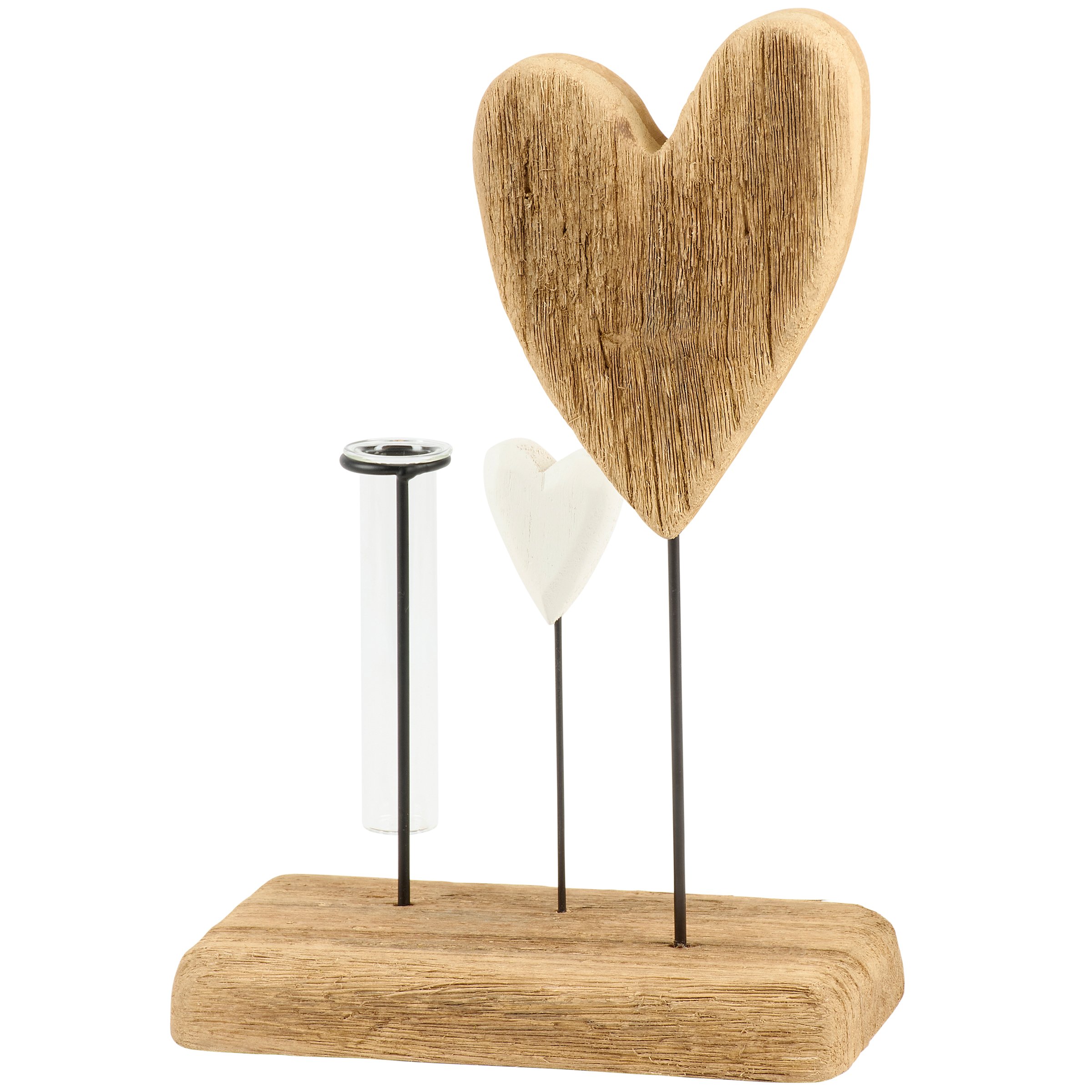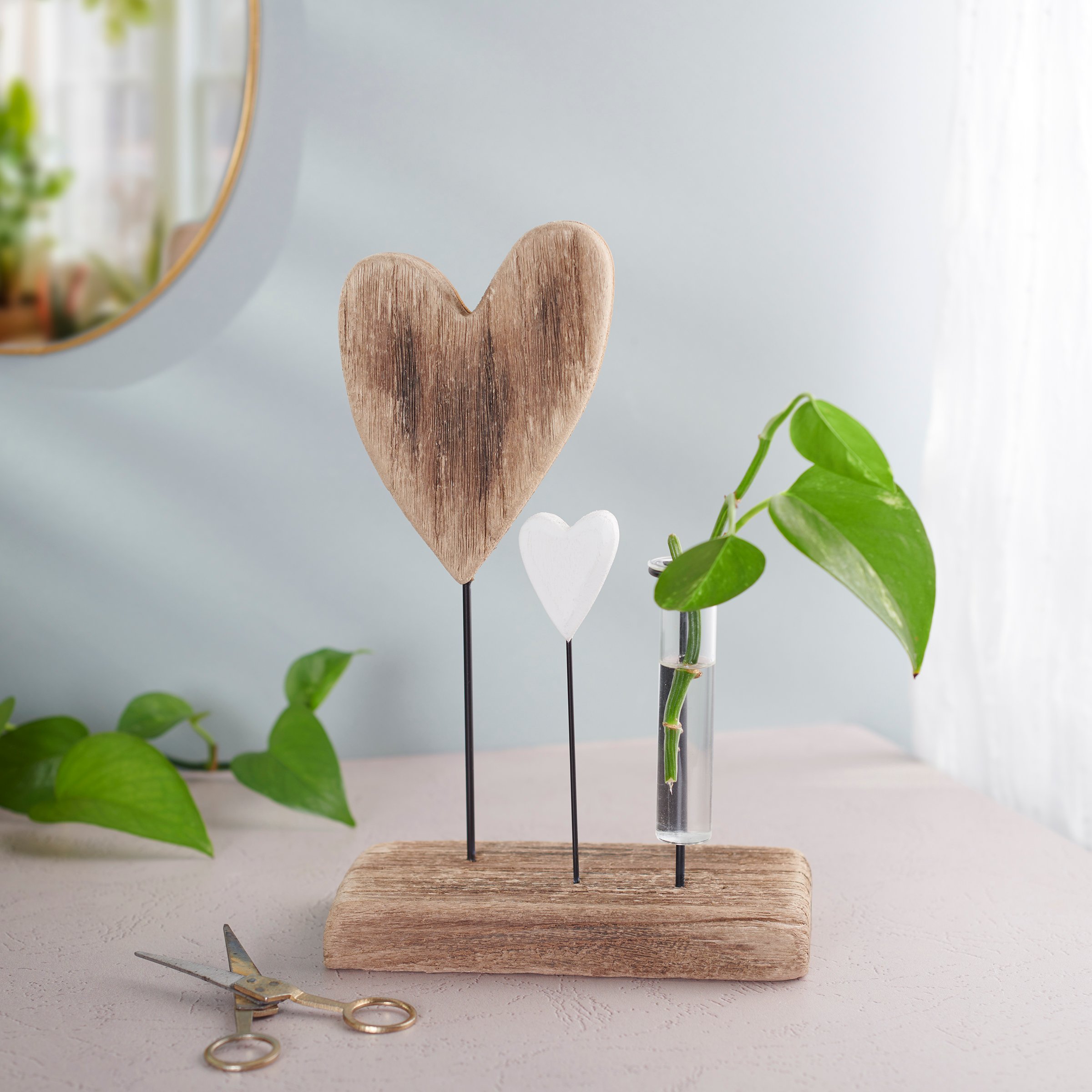 A decorative sitter from our Valentine's Day Collection displaying a handmade inspired love hearts design made of natural wood with painted and distressed details as well as a test tube vase for plant propagation. Rustic sitter features 2 heart shaped pieces and a test tube vase on metal stakes attached to a natural wood block for a floating appearance. Our Hearts test tube vase sitter is designed to free-stand on a flat surface for display. A rustic love-themed plant accessory that coordinates well with primitive home décor.