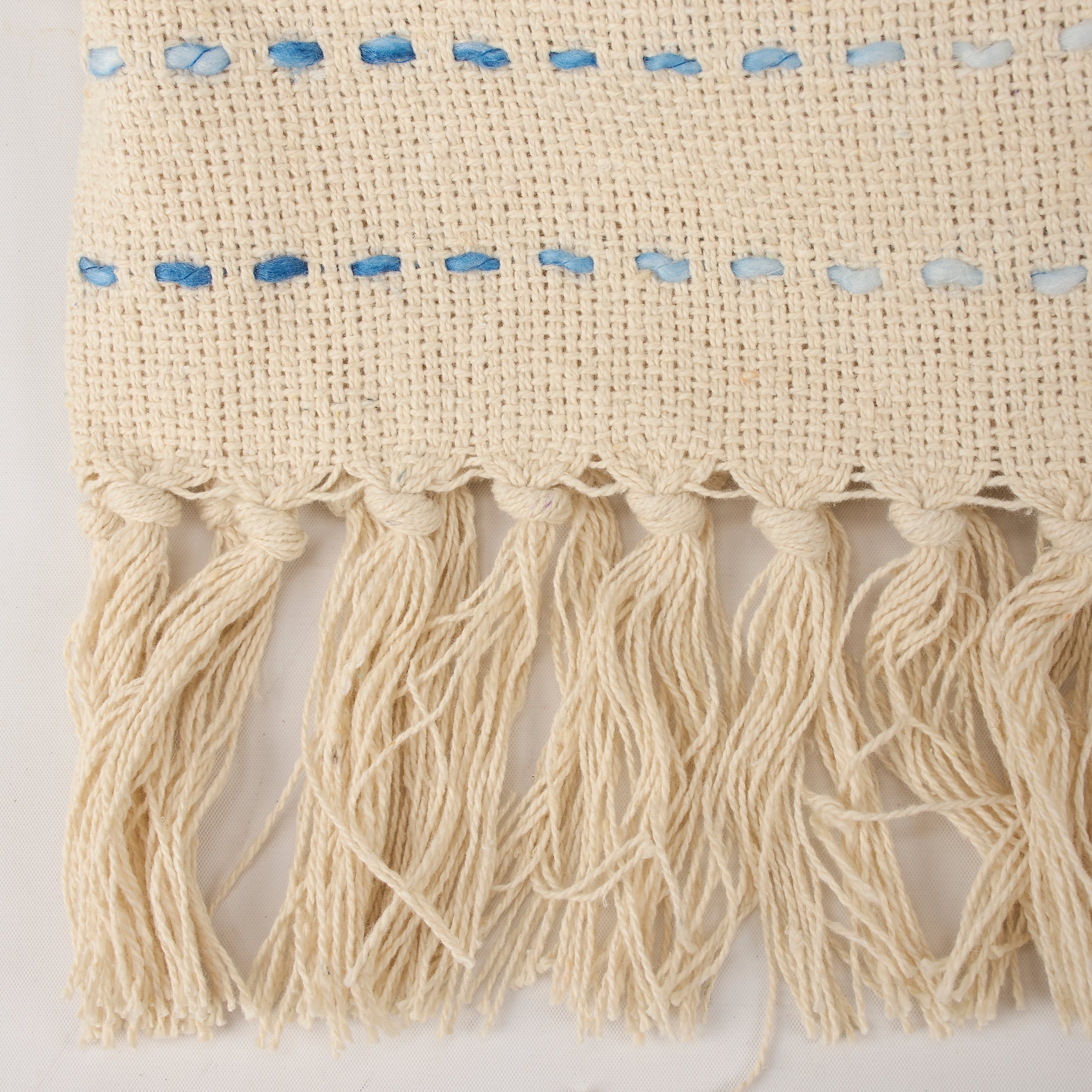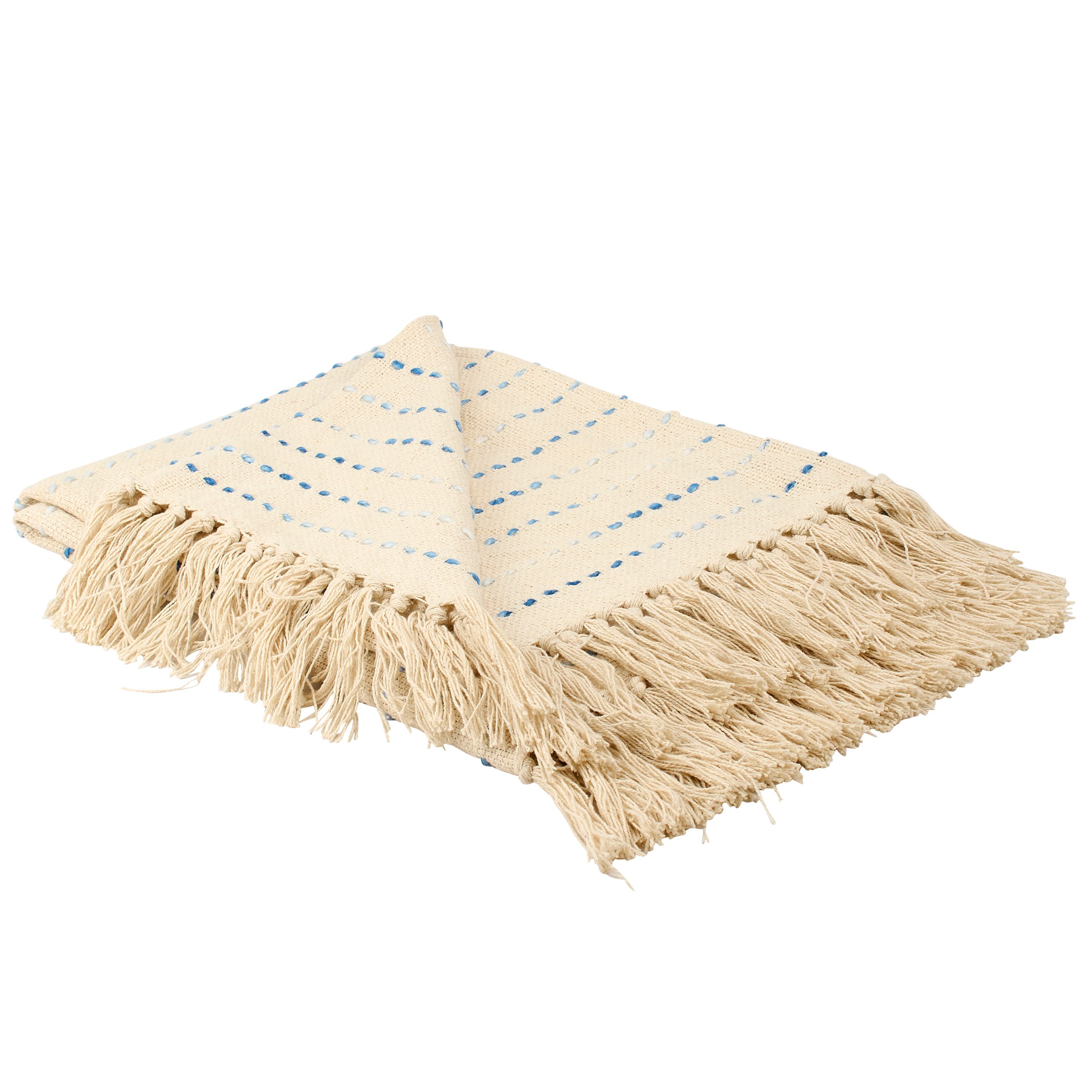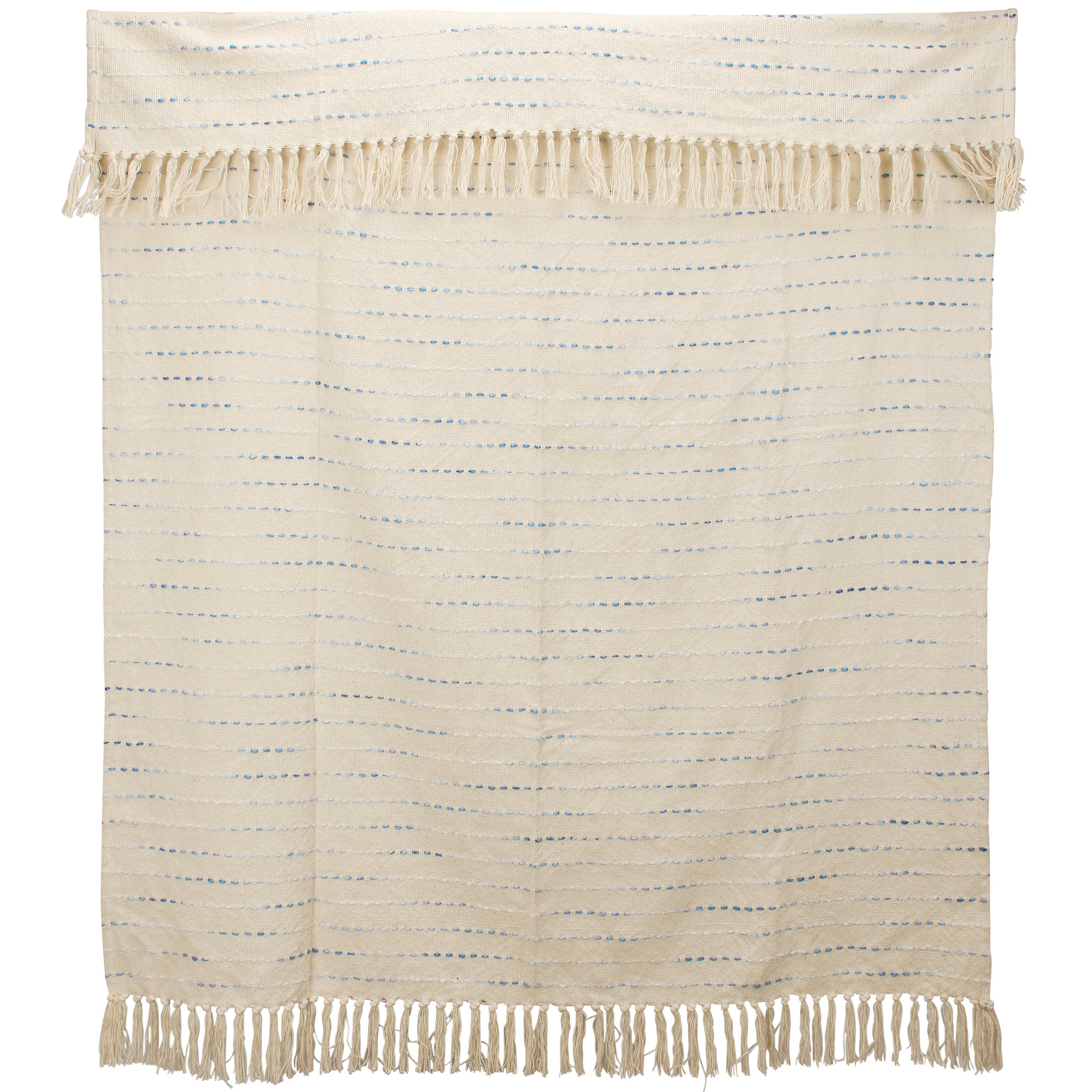 A cotton throw blanket from our Beach Collection displaying cream fabric with stitched stripes featuring gradient blue color throughout resembling ocean waves as well as tassels on top and bottom edge of the blanket. This beach throw measures 50 x 60 inches giving plenty of coverage to accent furniture or to cozy up under the blanket. Our Blue Ocean Waves throw blanket is conveniently machine-washable for easy cleaning. A ocean themed home accent perfect for adding beach style to any room.