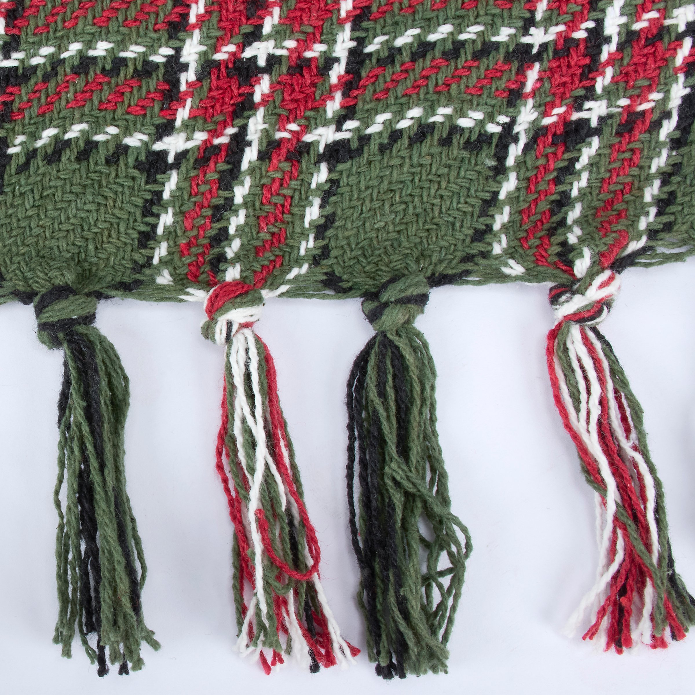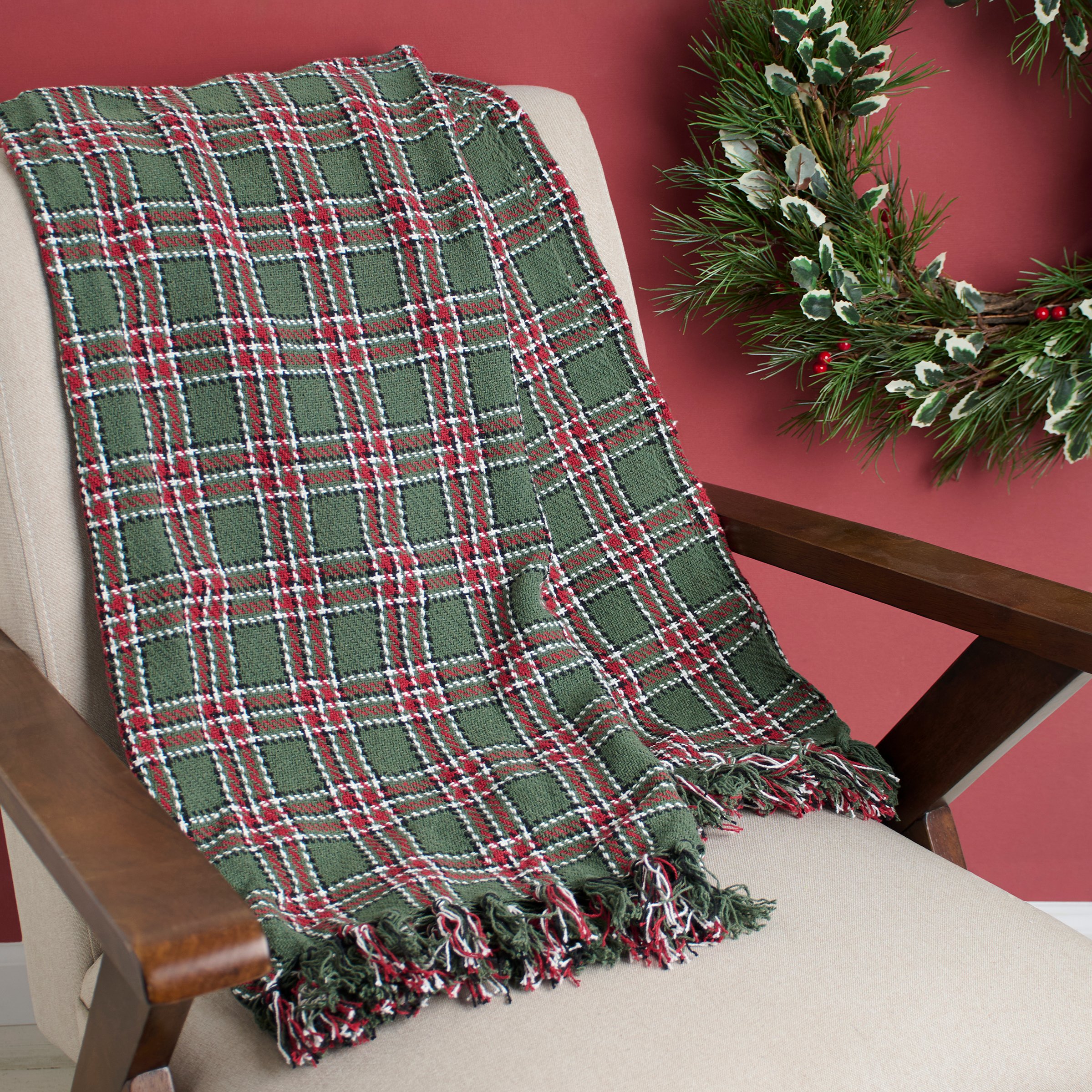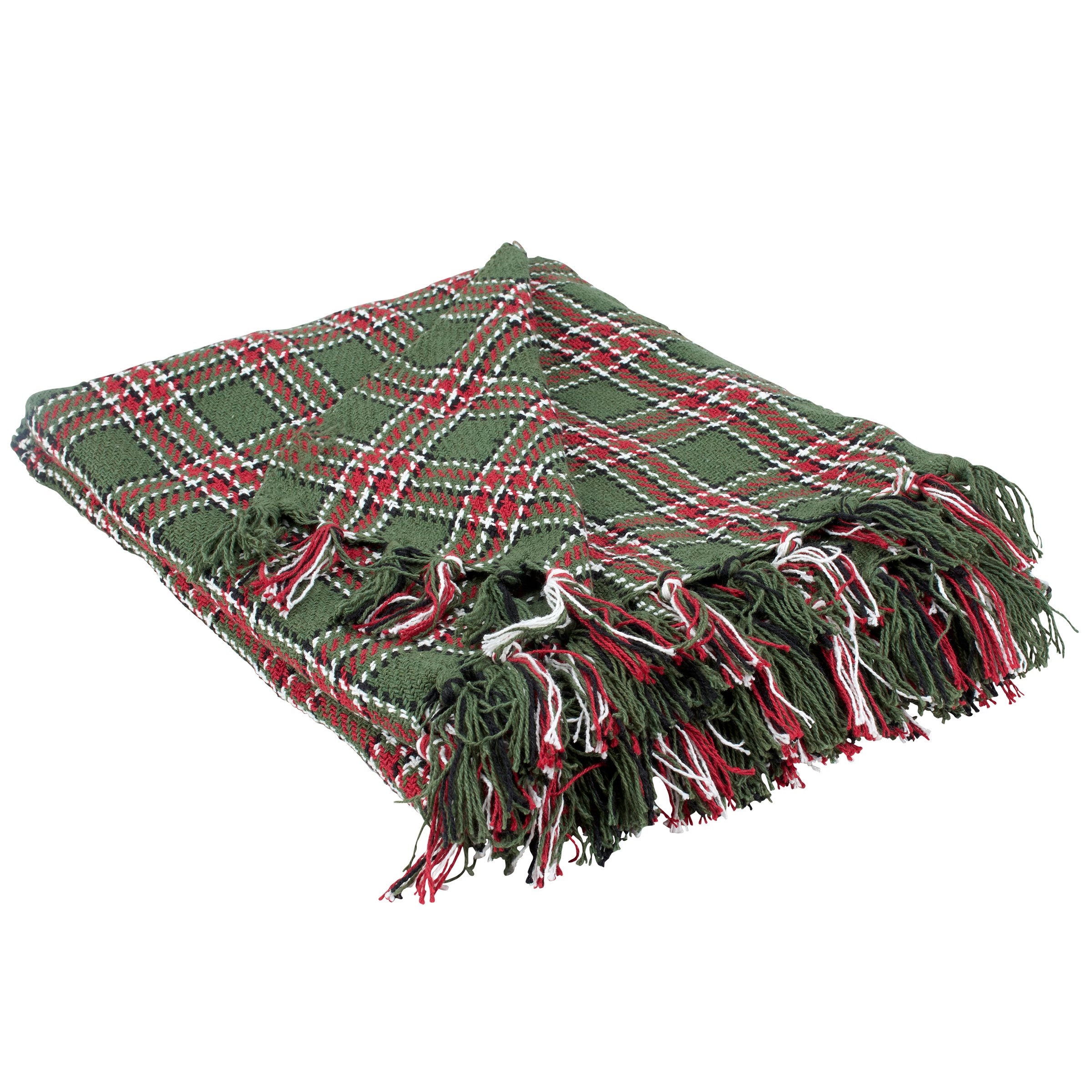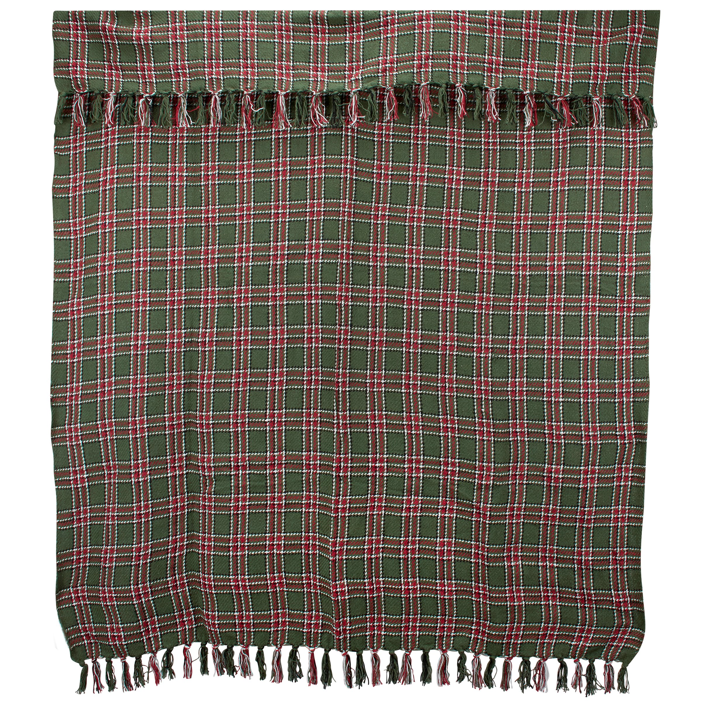 A cotton throw blanket from our Christmas Collection displaying a rustic Christmas plaid pattern woven throughout with coordinating tassels on the top and bottom edge. Rustic throw blanket measures 50 x 60 inches giving plenty of coverage to accent furniture or to cozy up under the blanket. Our Cabin Christmas Plaid throw blanket is conveniently machine-washable for easy cleaning. A rustic Christmas home accent perfect for adding seasonal style to any room.
