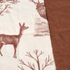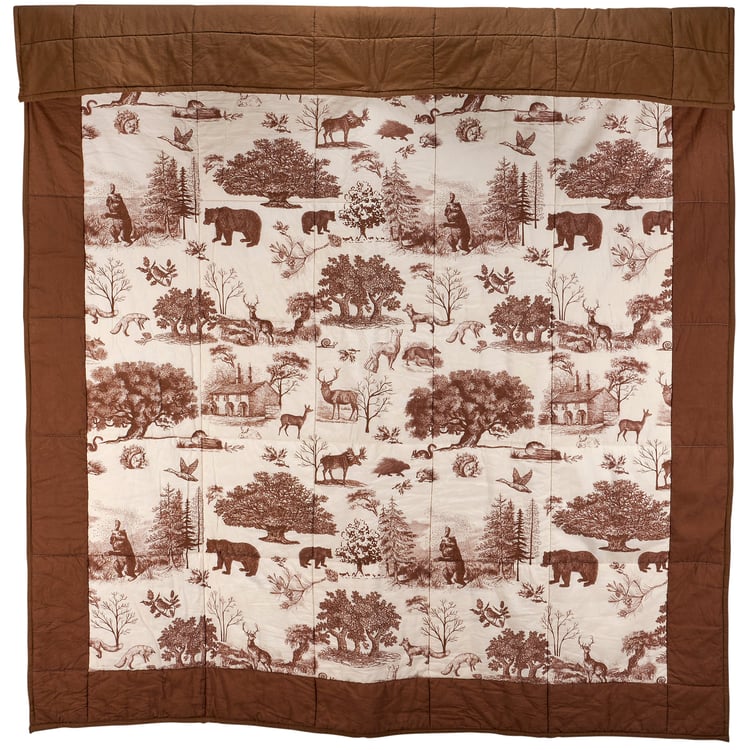 A cotton throw blanket from our Lake & Cabin Collection displaying woodland animal and cabin designs inspired by vintage toile patterns with quilted details for added texture and thick brown border. Our Cabin Toile throw blanket measures 50 x 60 inches giving plenty of coverage to accent furniture or to cozy up under the blanket. Wipe with damp cloth to clean. An outdoor-themed home accent perfect for adding vintage style to a cabin or RV.
