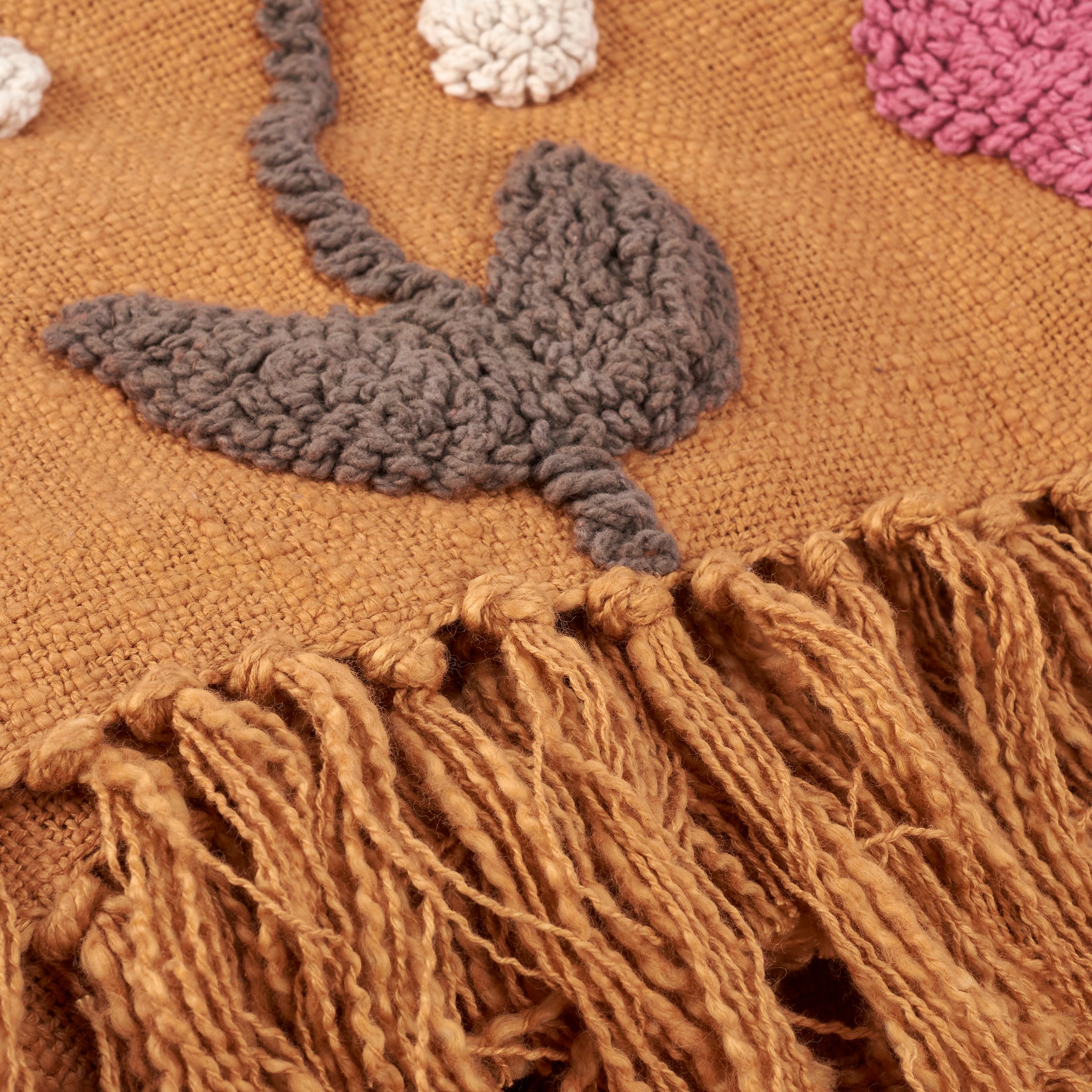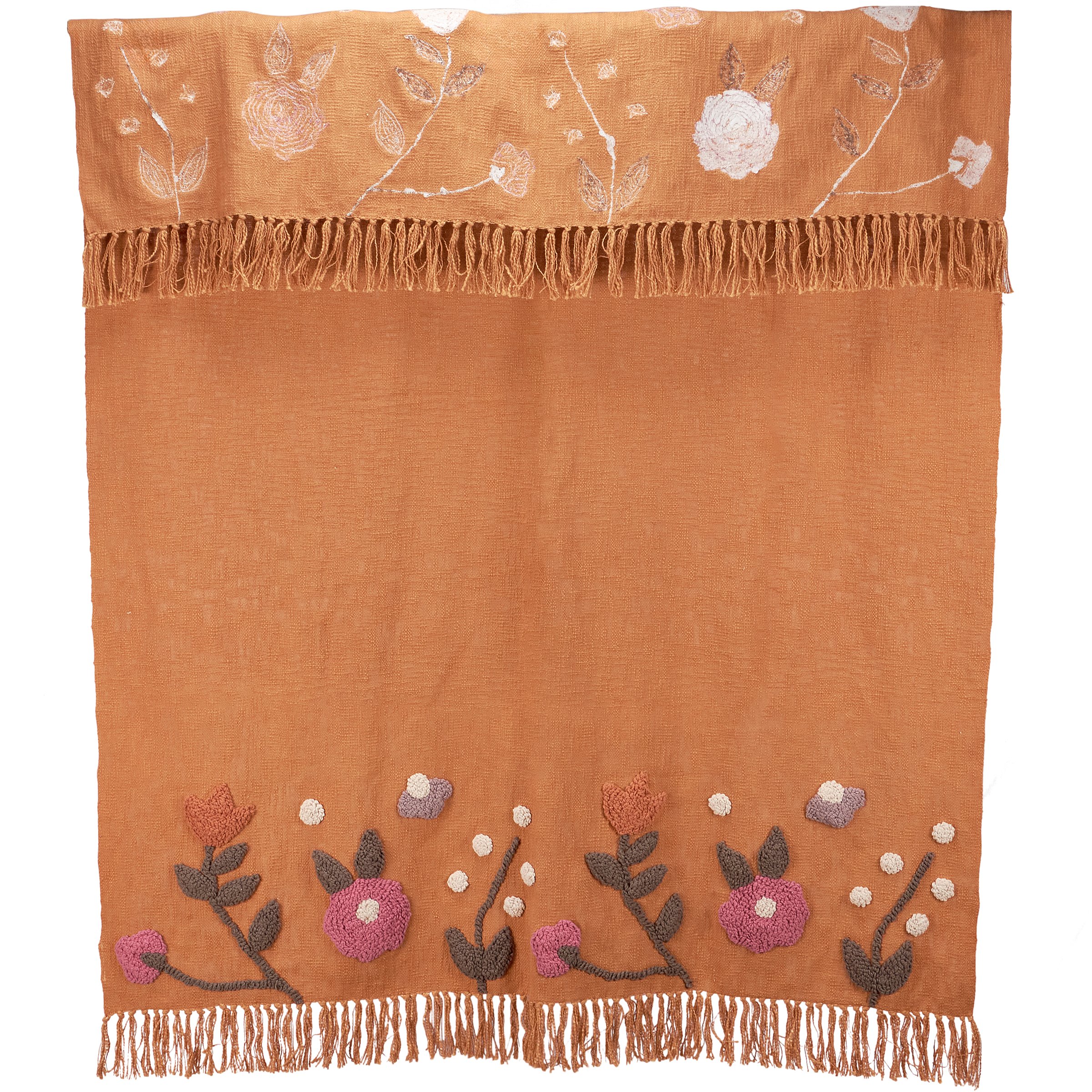 A cotton throw blanket from our Easter & Spring Collection displaying various primitive inspired spring flowers made using punch needle technique with tassels on top and bottom edge. Rustic throw blanket measures 51 x 67 inches giving plenty of coverage to accent furniture or to cozy up under the blanket. Our Floral Pops throw blanket is conveniently machine-washable for easy cleaning. A rustic home accent perfect for seasonal use.