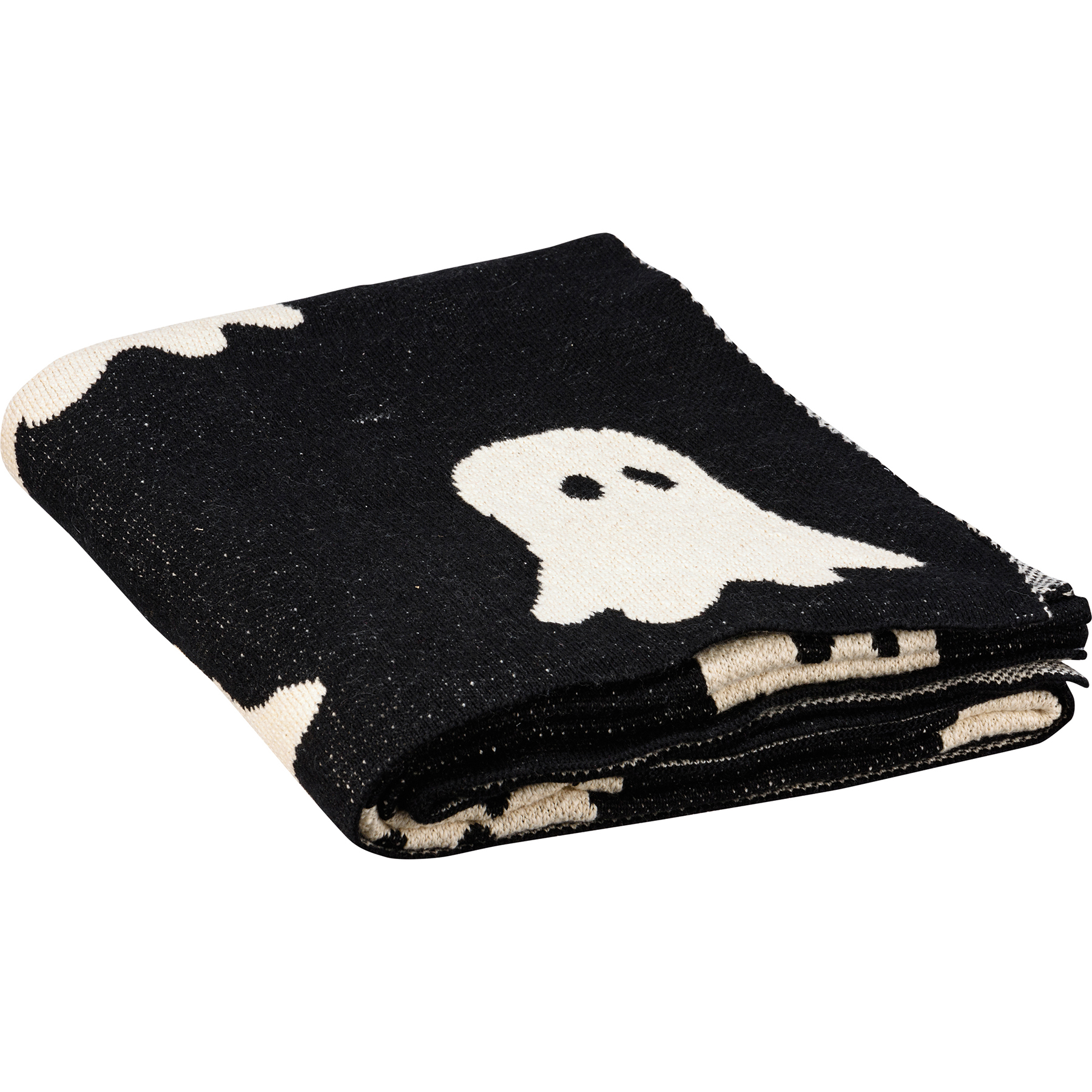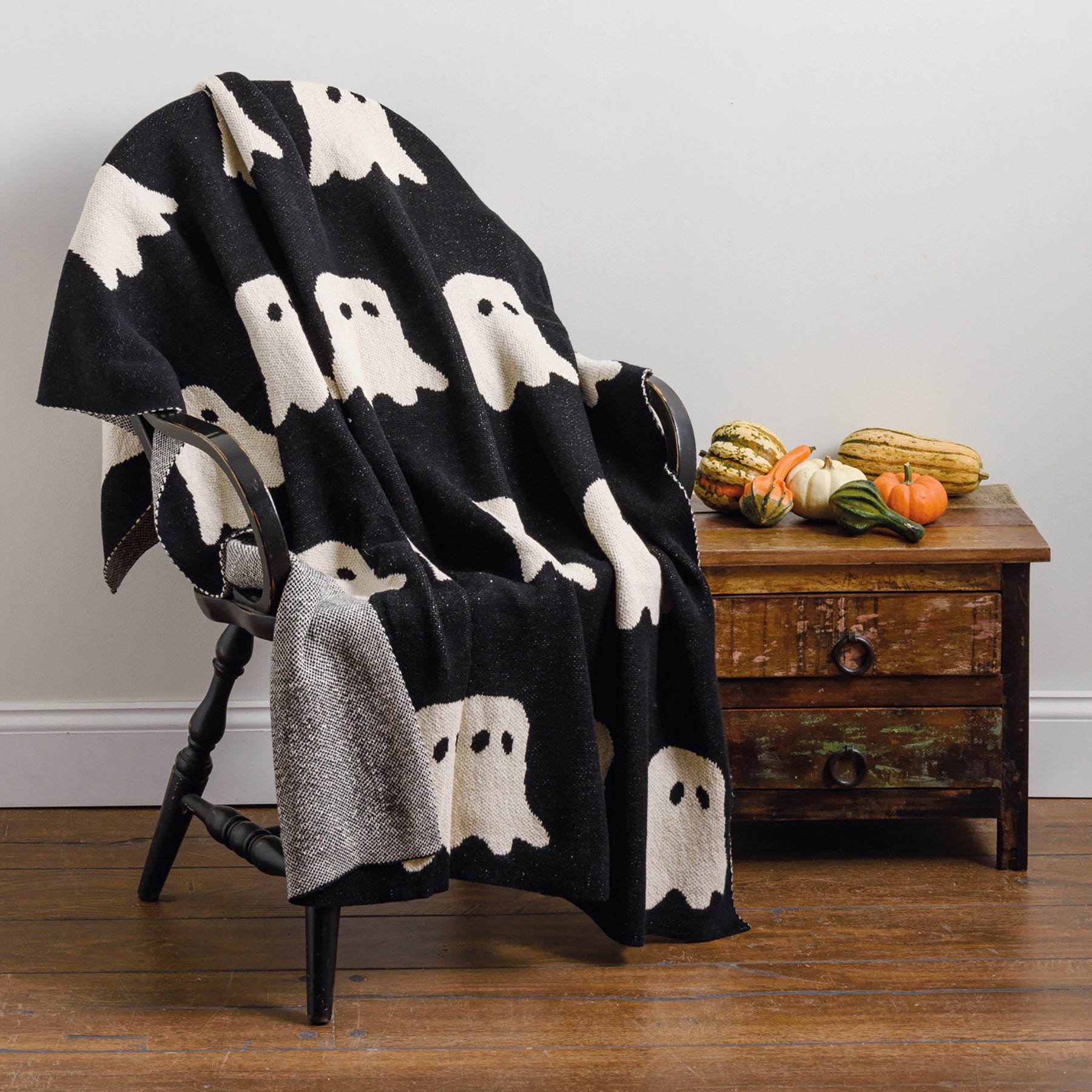A machine-knitted black cotton throw featuring ghost designs. 50" x 60". Our Ghosts throw is machine-washable.