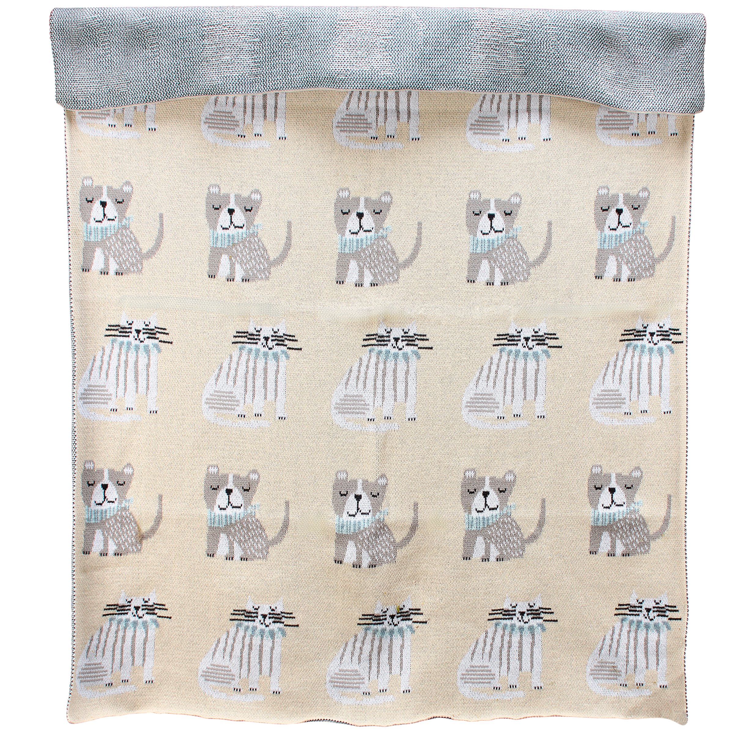 A cotton throw blanket from our Baby & Kids Collection displaying a cute pet inspired pattern of cats and dogs woven into the blanket. Cute throw blanket measures 30 inches by 40 inches for plenty of coverage to accent furniture or kids to cozy up under the blanket. Our Pets throw blanket is conveniently machine-washable for easy cleaning. A cute pet-themed home accent perfect for children's room decor.