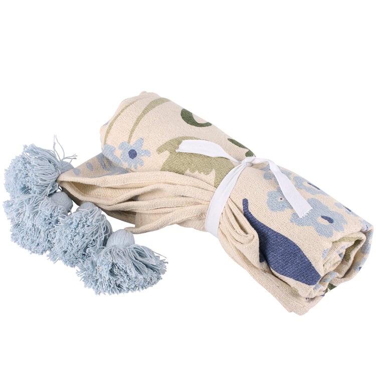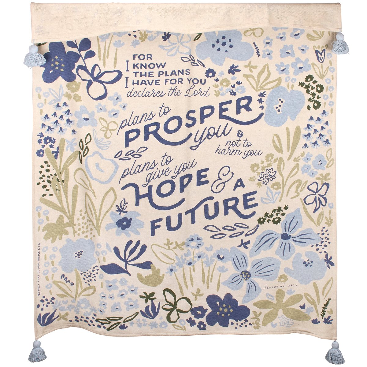 A cotton throw blanket from our Faith Collection displaying beautiful botanicals surrounding a faith inspired sentiment that reads "For I Know The Plans I Have For You Declares The Lord - Plans To Prosper You & Not To Harm You - Plans To Give You Hope & A Future." Faith design is replicated from original hand illustrated artwork. Floral throw blanket features coordinating blue tassels on each corner and measures 50 x 60 inches giving plenty of coverage to accent furniture or to cozy up under the blanket. Our Plans To Prosper You throw blanket is conveniently machine-washable for easy cleaning. A faith-themed home accent perfect for adding style to any room.