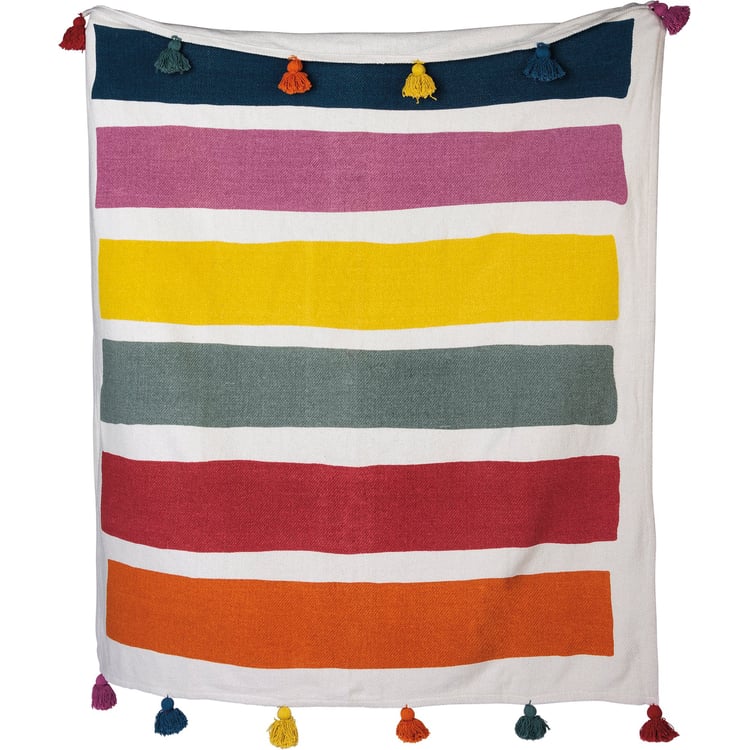 A cotton throw from our Pride Collection featuring a rainbow stripe design with coordinating tassel accents for added interest. The rainbow Throw Blanket is machine-washable.
