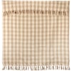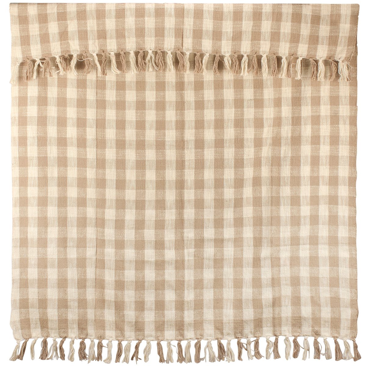 A cotton throw blanket from our Cottage Charm Collection displaying a rustic tan plaid pattern woven throughout with coordinating tassels on top and bottom edge. Rustic throw blanket measures 50 x 60 inches giving plenty of coverage to accent furniture or to cozy up under the blanket. Our Tan Plaid throw blanket is conveniently machine-washable for easy cleaning. A cottage inspired home accent perfect for adding rustic style to any room.