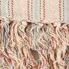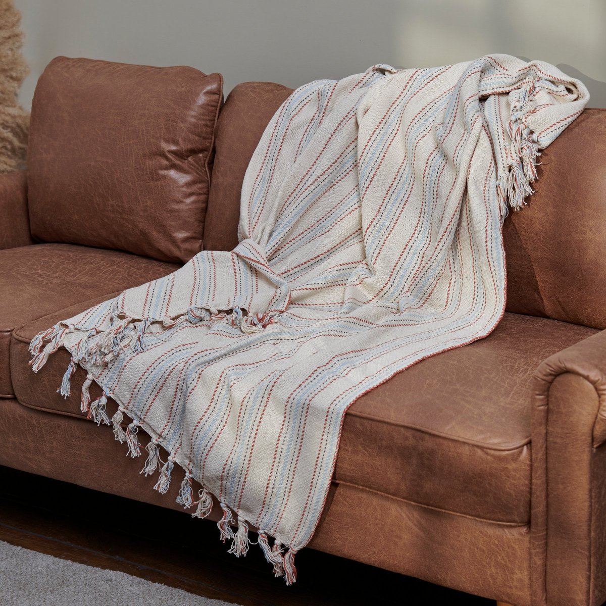 A cotton throw blanket from our Farmhouse Collection displaying a blue and red stripe pattern woven throughout with tassels on top and bottom edge. Rustic throw blanket measures 50 x 60 inches giving plenty of coverage to accent furniture or to cozy up under the blanket. Our Ticking Stripe throw blanket is conveniently machine-washable for easy cleaning. A rustic home accent perfect for everyday use.