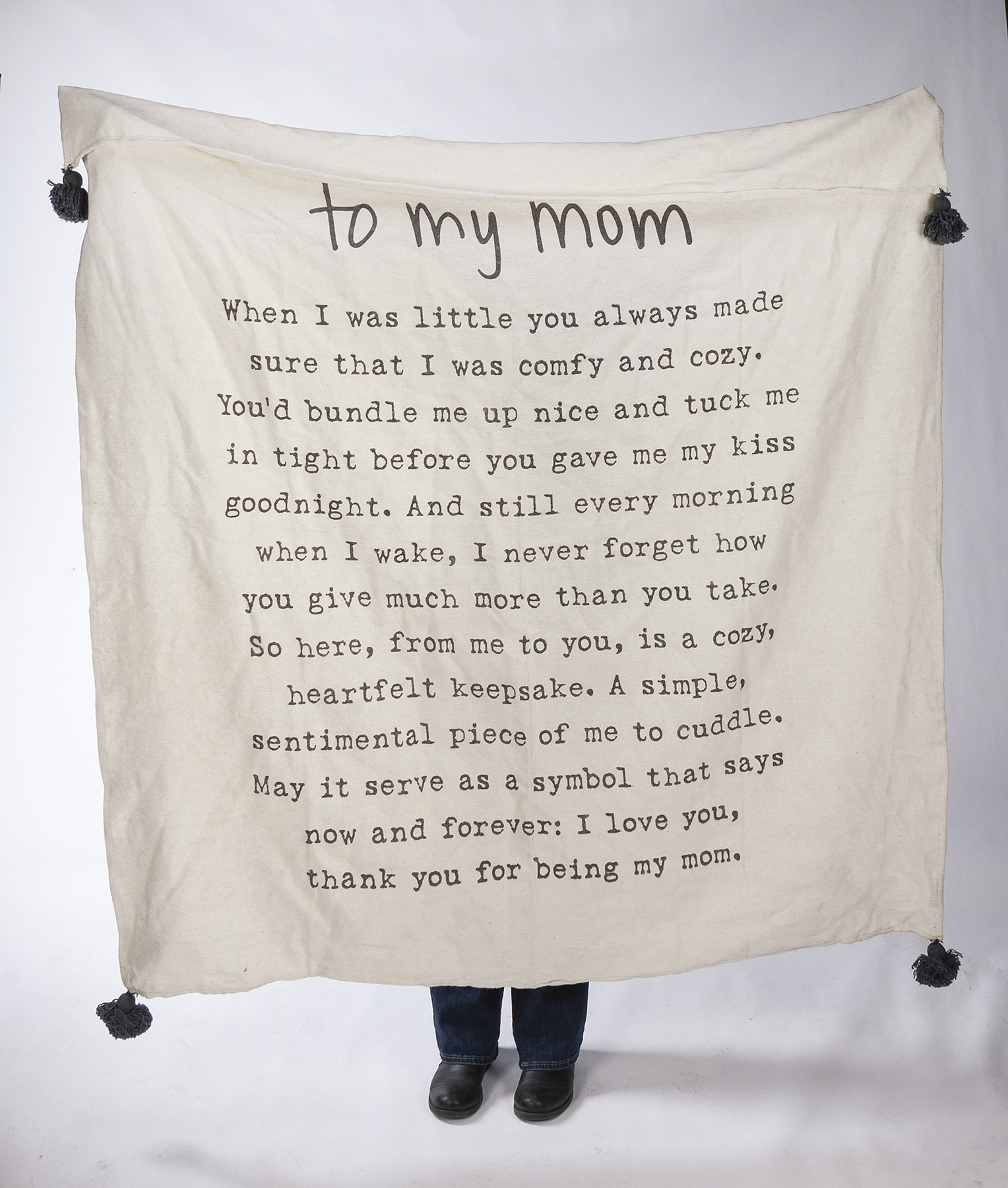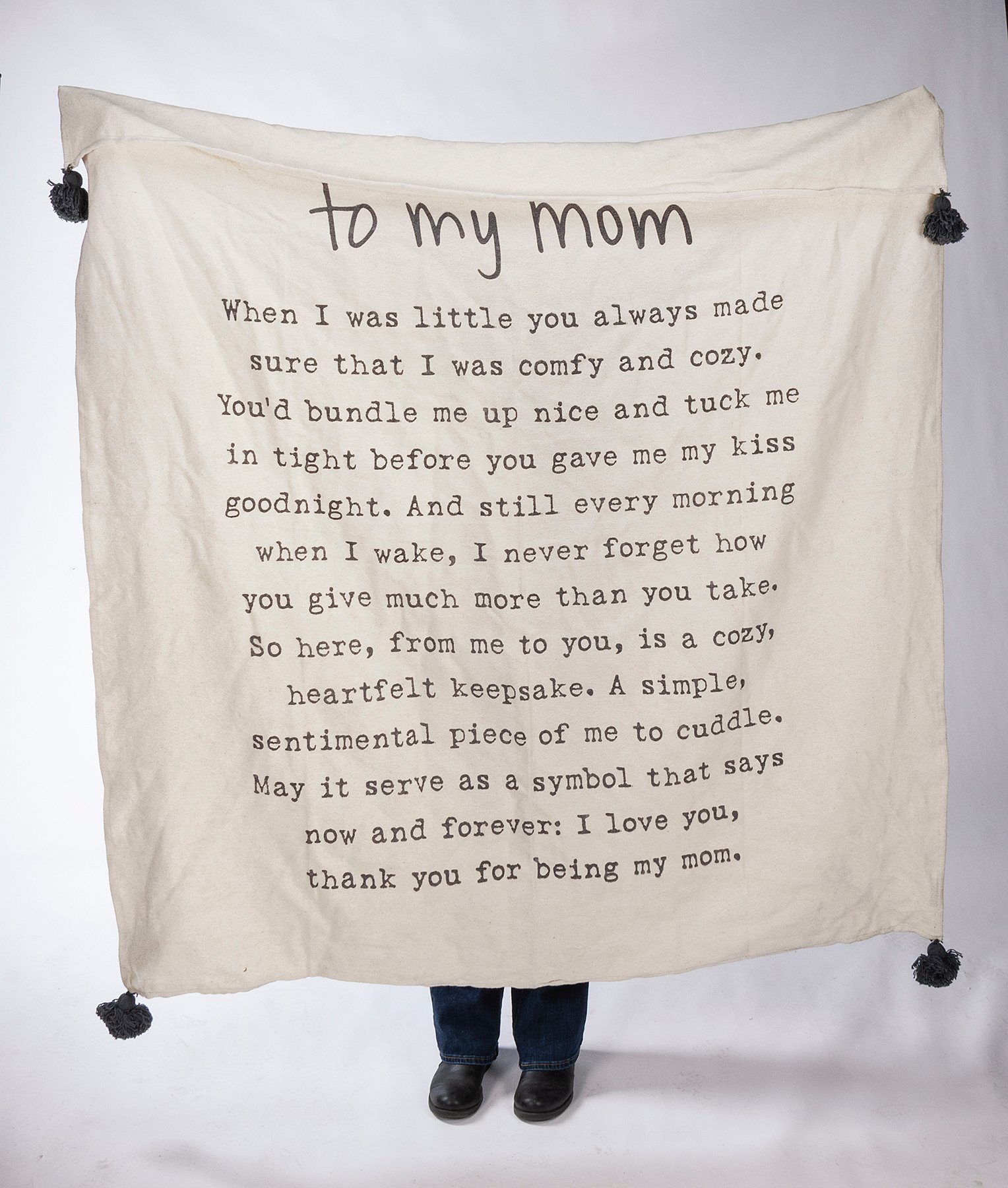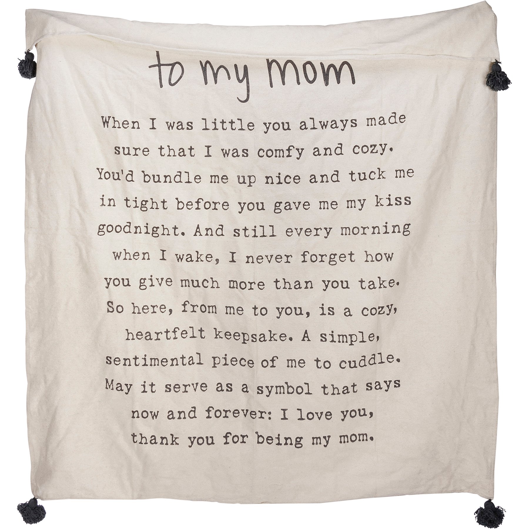 A soft cotton throw blanket from our Poetry Collection displaying a heartwarming mother-themed poem entitled "To My Mom" in a neutral color palette. Throw blanket design features hand illustrated and typeset text with coordinating corner tassels for added interest. Our To My Mom throw blanket is conveniently machine-washable for easy cleaning. Throw blanket measures 50 inches by 60 inches for plenty of cozy coverage and comes rolled, tied with cotton tape, and a hangtag displaying full blanket design. A lovely family gift perfect for Mother's Day or as an everyday home accent in any room.