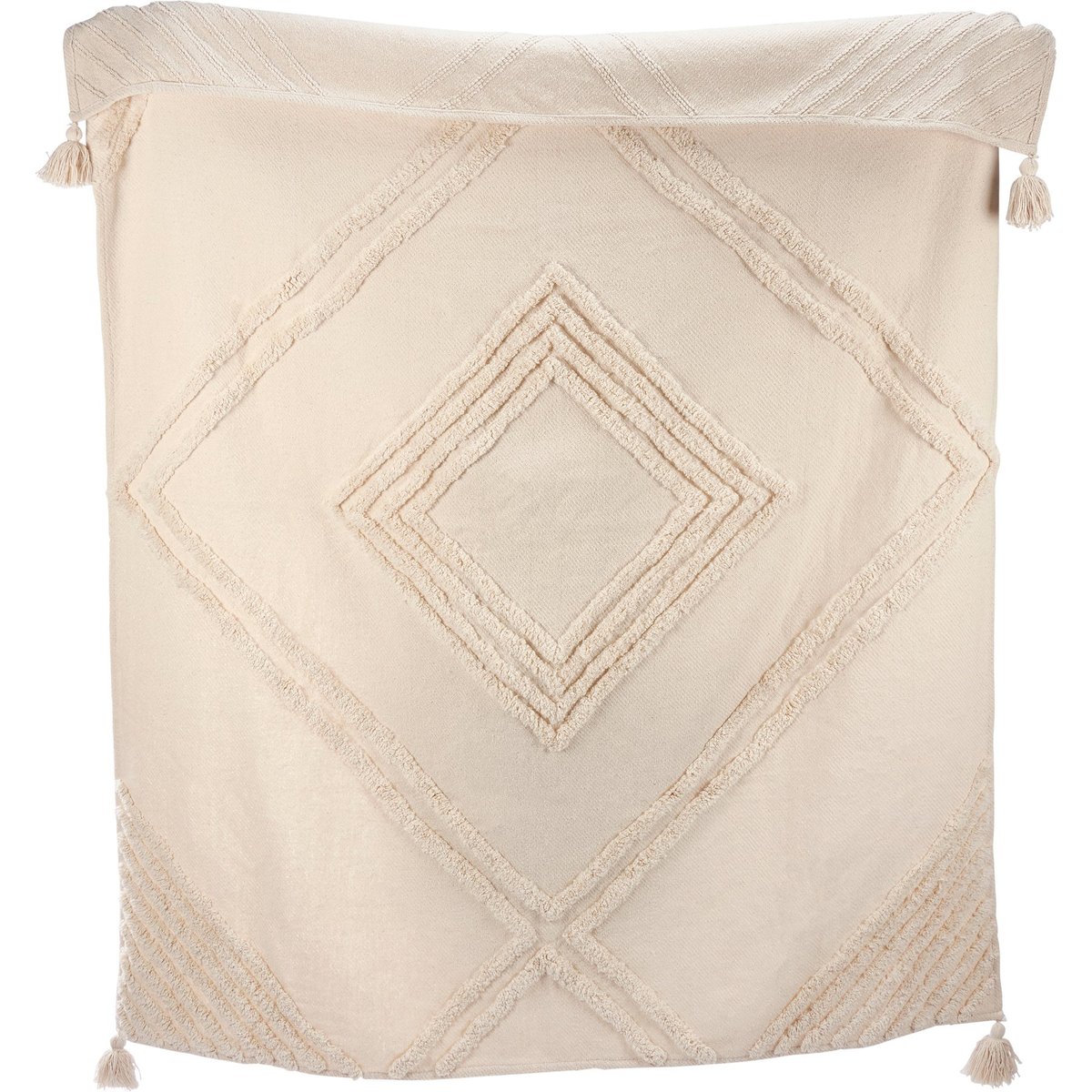 A cotton throw blanket from our Bohemian Collection displaying natural color palette and tufted diamond patterns with tassels on each corner. Throw measures 50 x 60 inches giving plenty of coverage. Our Tufted Diamonds throw is machine-washable for convenient cleaning. A neutral home accent that coordinates well with a variety of styles.