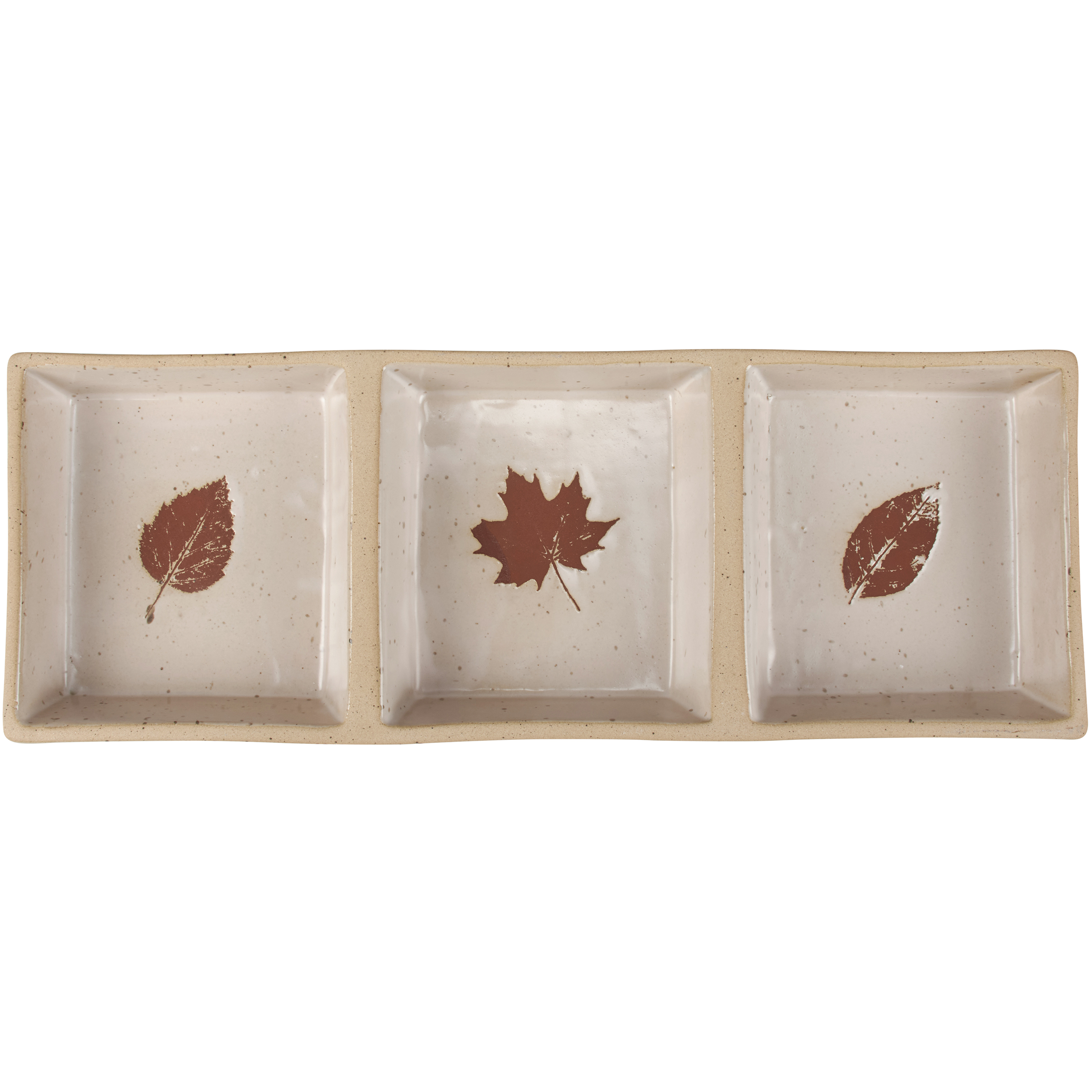 A durable stoneware tidbit tray from ourĀ Fall & Harvest Collection displaying a cream color with debossed fall leaves in brown color on the inside and bare ceramic accents on the rim. Tray features three sections to easily sort food. Our Fall Leaves tidbit tray is microwave, dishwasher, and food safe for convenient use. A piece of rustic tableware perfect for seasonal gatherings.