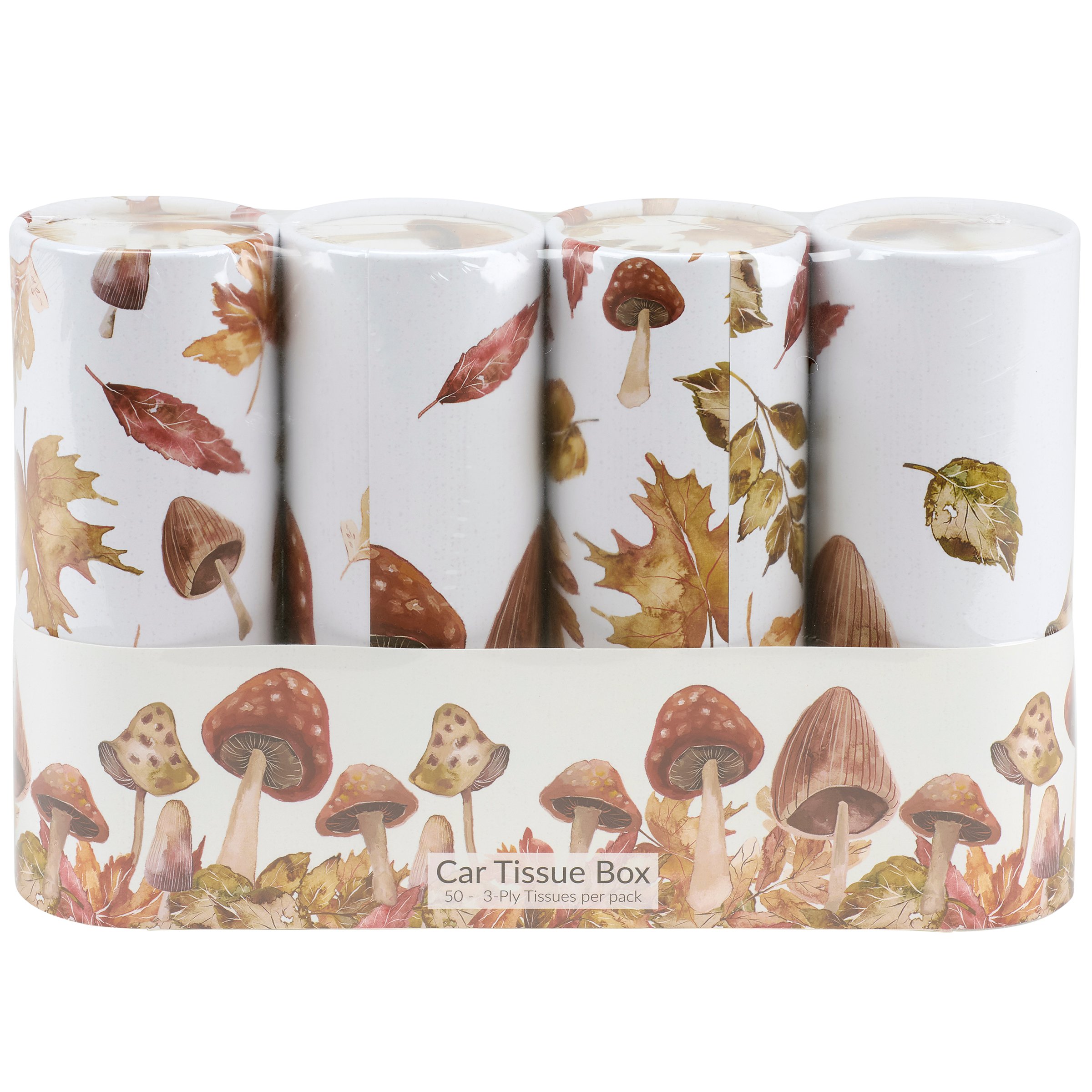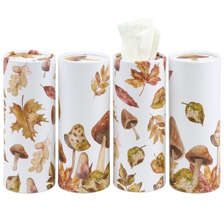 A stylish tissue box set from our Fall & Harvest Collection featuring 4 cylindrical tissue boxes displaying full wrap-around designs of mushroom and autumn leaf patterns on each box. Fall designs are replicated from original art hand painted in a delicate watercolor style. Tissue boxes feature a size and shape perfect for placing in a car cup holder for stylish on the go function or for easy placement around the house and at work. Our Harvest tissue box set includes 50 facial tissues per box for 200 3-ply tissues in total. Car tissue boxes are packaged in a decorative cardboard holder and shrink wrapped to easily view each design on store display.