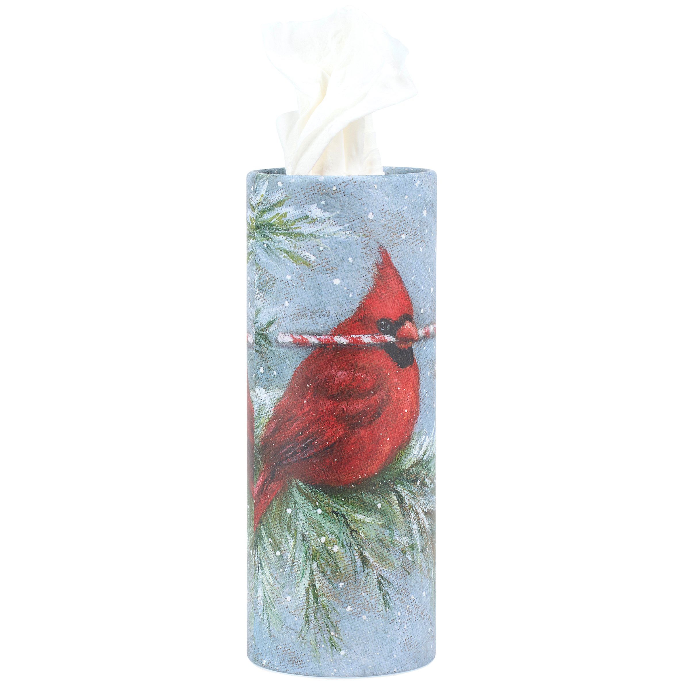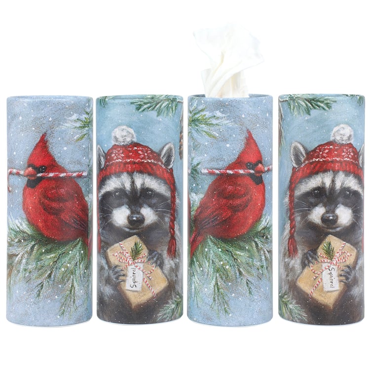A stylish tissue box set from our Christmas Collection featuring 4 cylindrical tissue boxes displaying full wrap-around designs of winter scenes with a cardinal or raccoon on each box. Winter woodland designs are replicated from original artwork painted onto burlap canvas, giving the art a unique depth and texture. Tissue boxes feature a size and shape perfect for placing in a car cup holder for stylish on the go function or for easy placement around the house and at work. Our Winter Woodland Friends tissue box set includes 50 facial tissues per box for 200 3-ply tissues in total. Car tissue boxes are packaged in a decorative cardboard holder and shrink wrapped to easily view each design on store display.